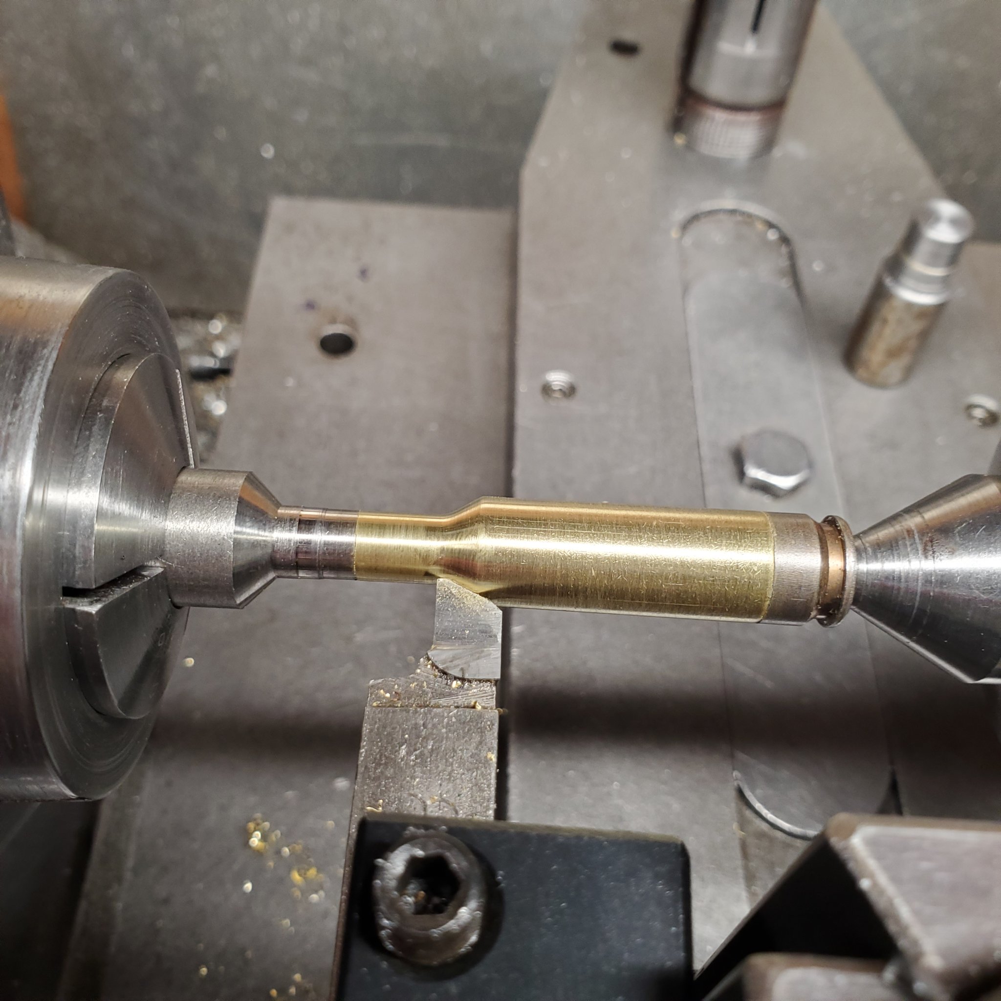 Neck turn in lathe with ground carbide 30° angle tool, with sharp 5 to 8° radius on neck/ shoulder junction to eliminate donuts.