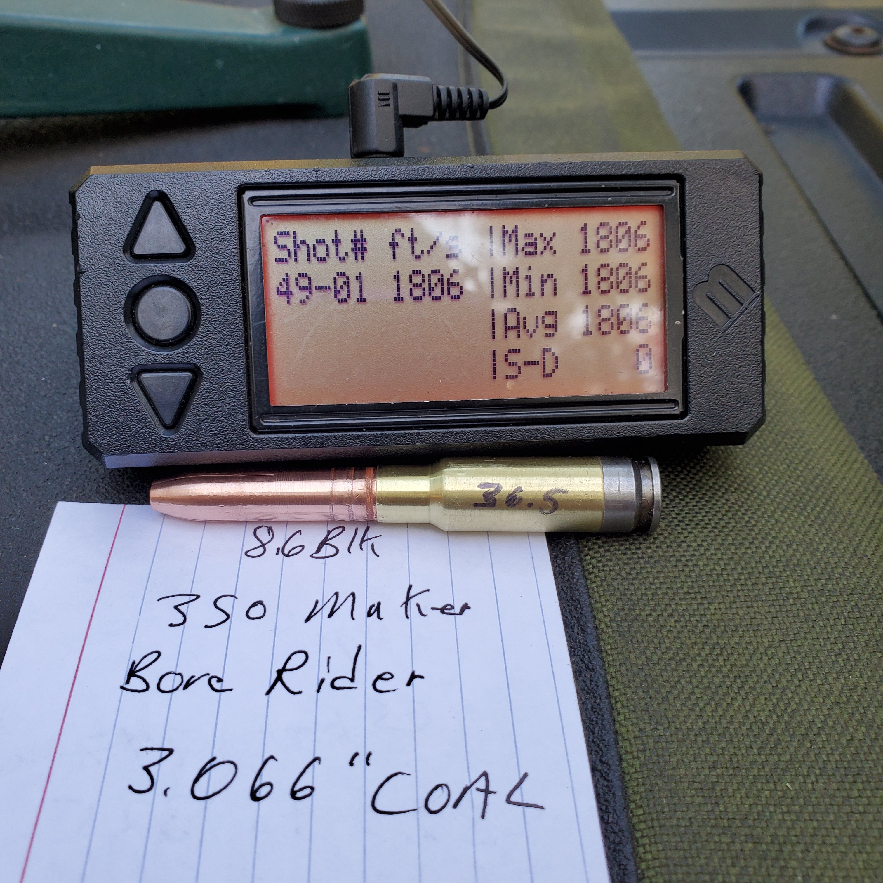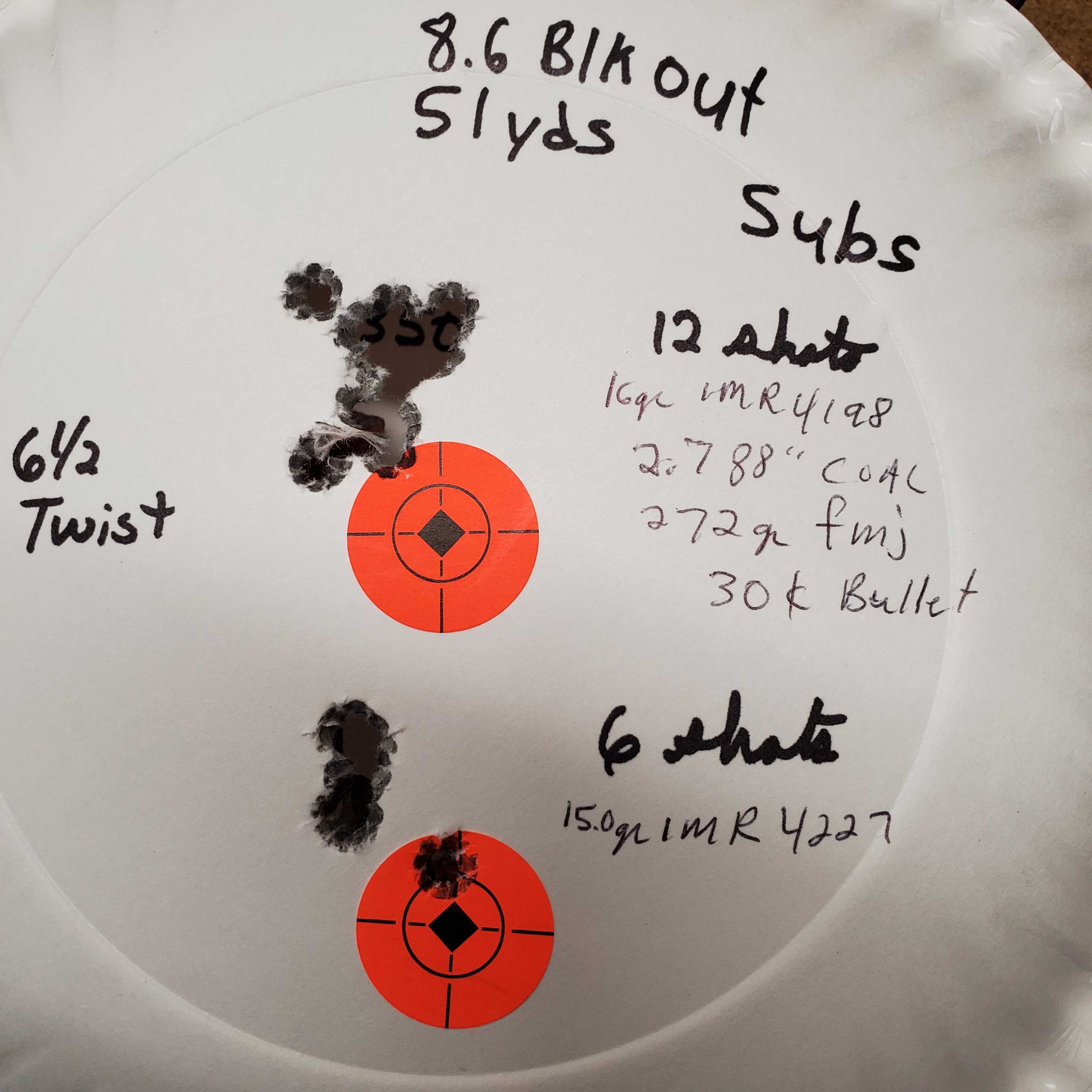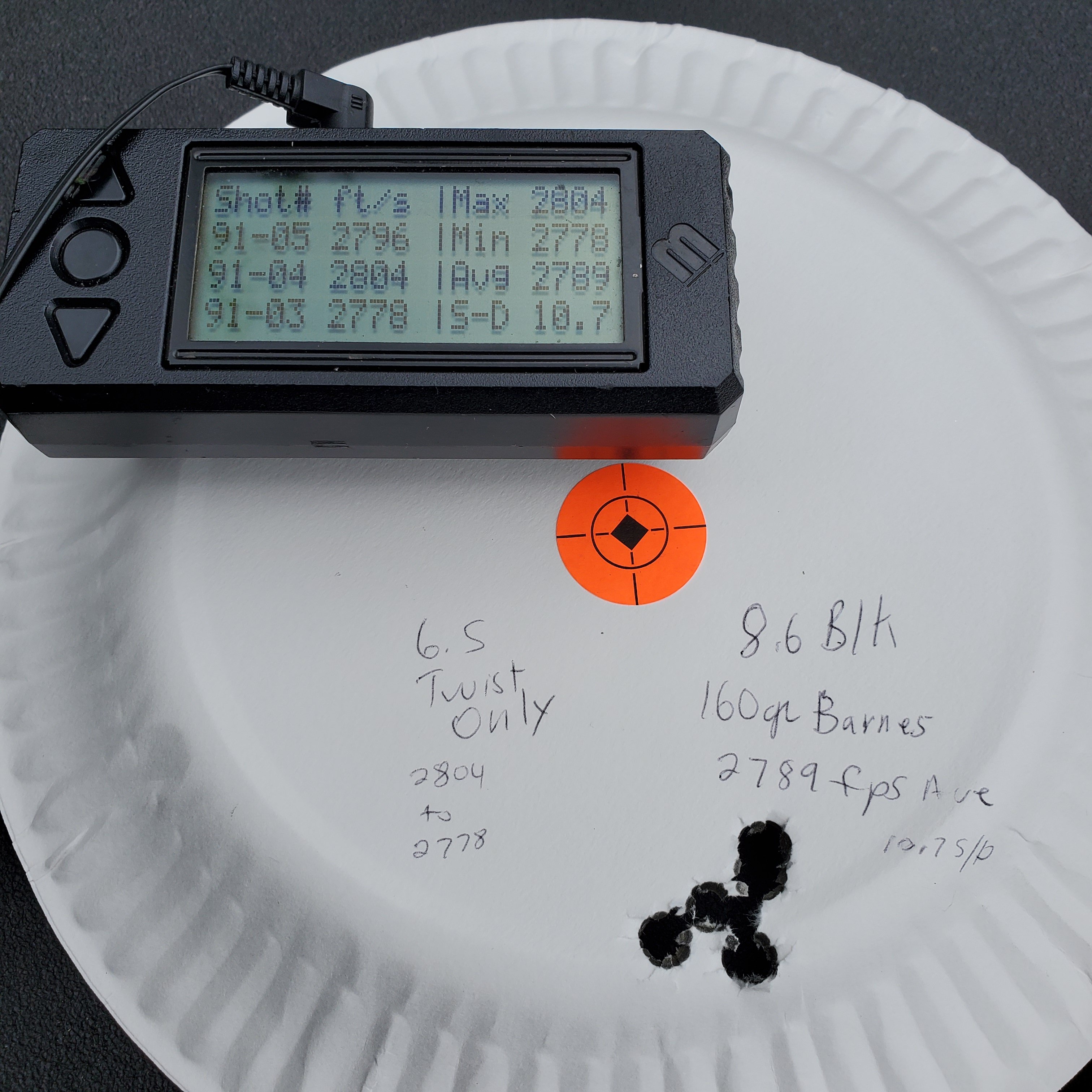 My 8.6 blkout with 6.5 twist and hybrid cases shoots Barnes 160 gr at 2800 fps 200 Speer at 2600 fps.