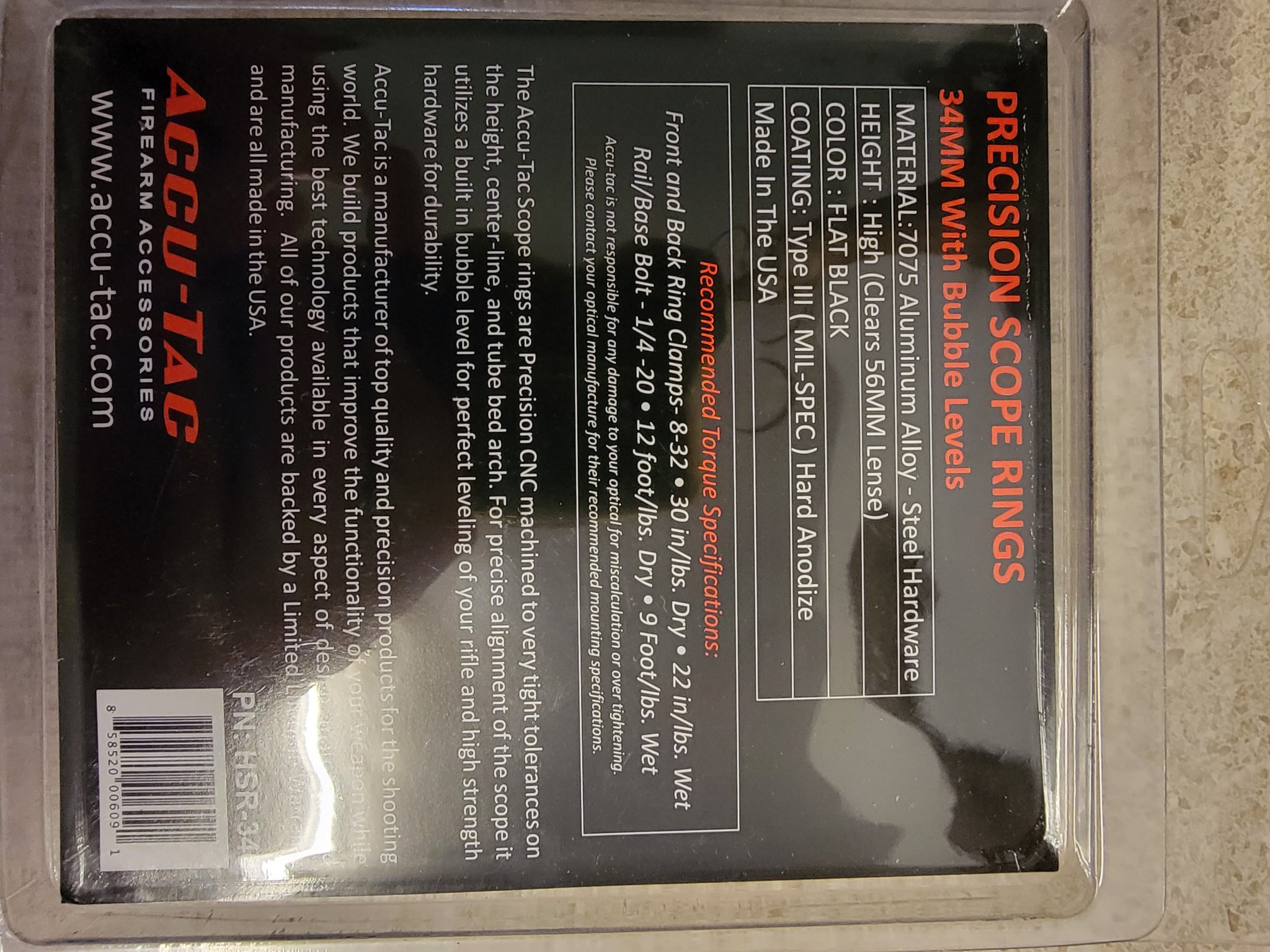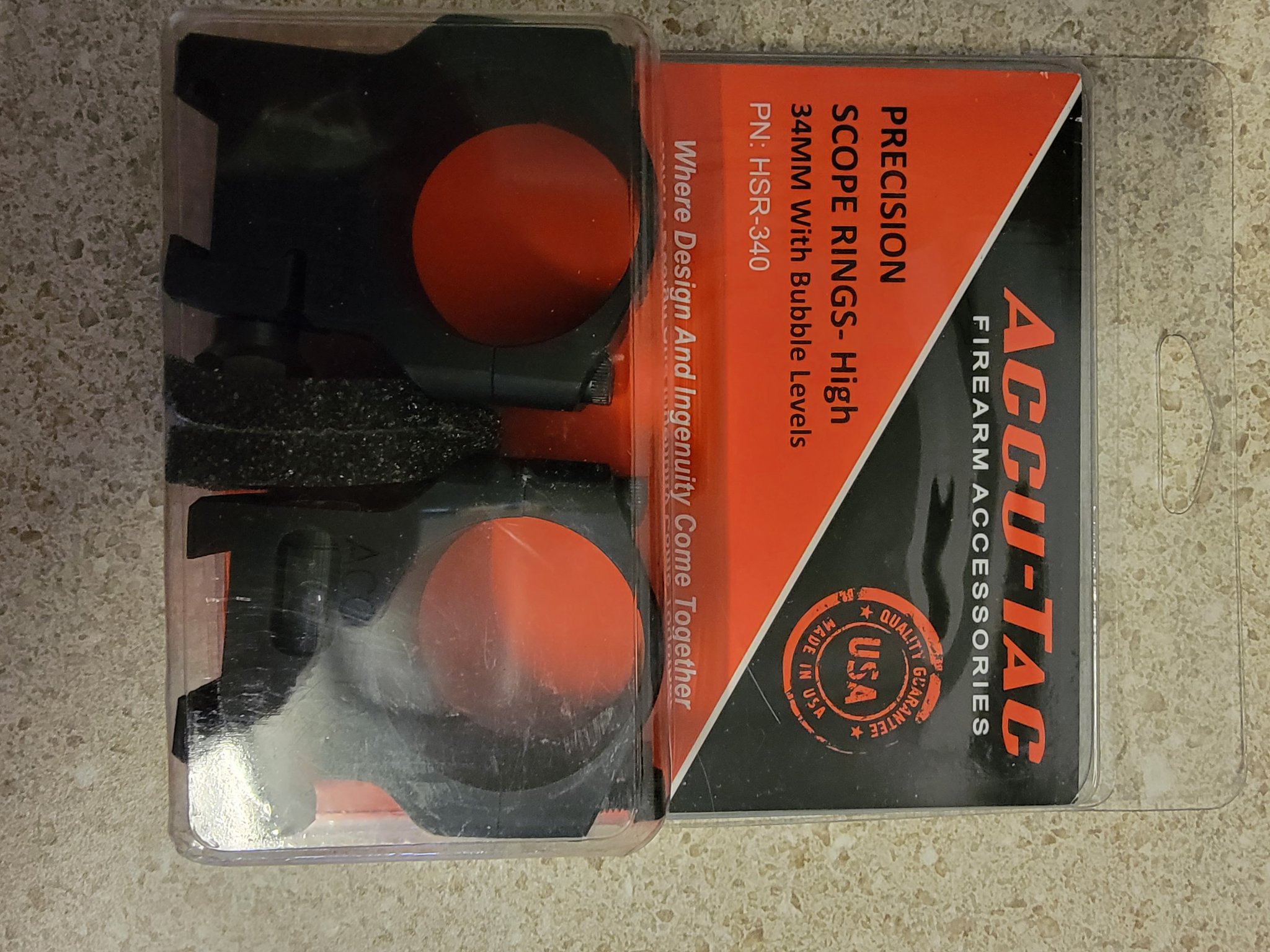 I have a set of 34mm Accu-Tac high rings with bubble level. I installed them, put a scope in them and decided to go a different route to get lower and less weight. $150 shipped.