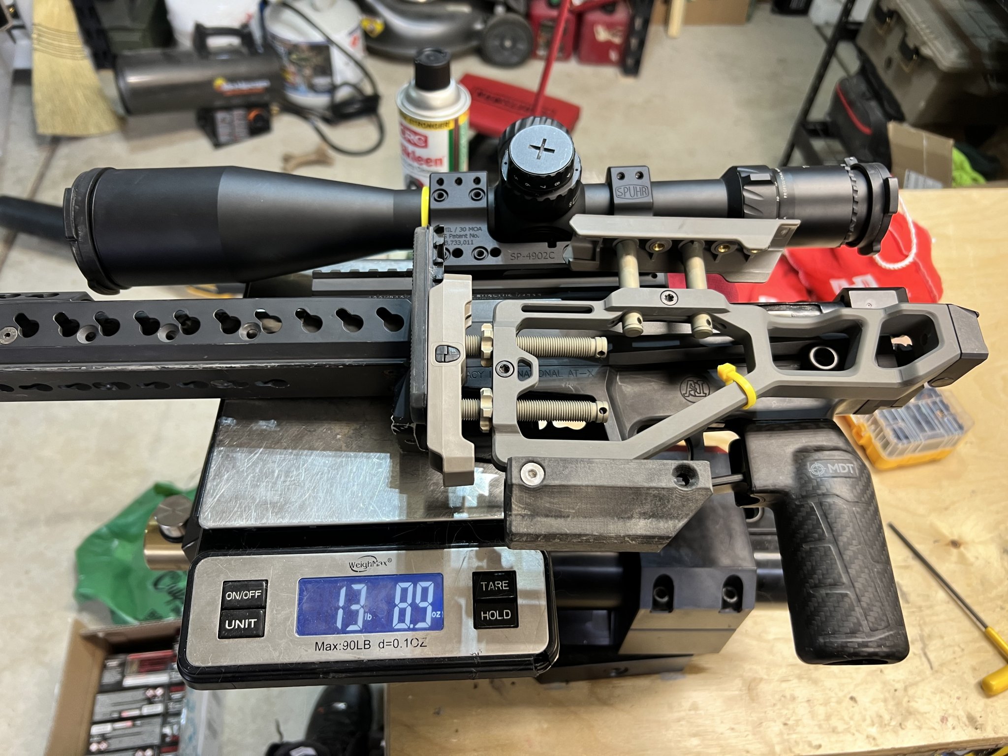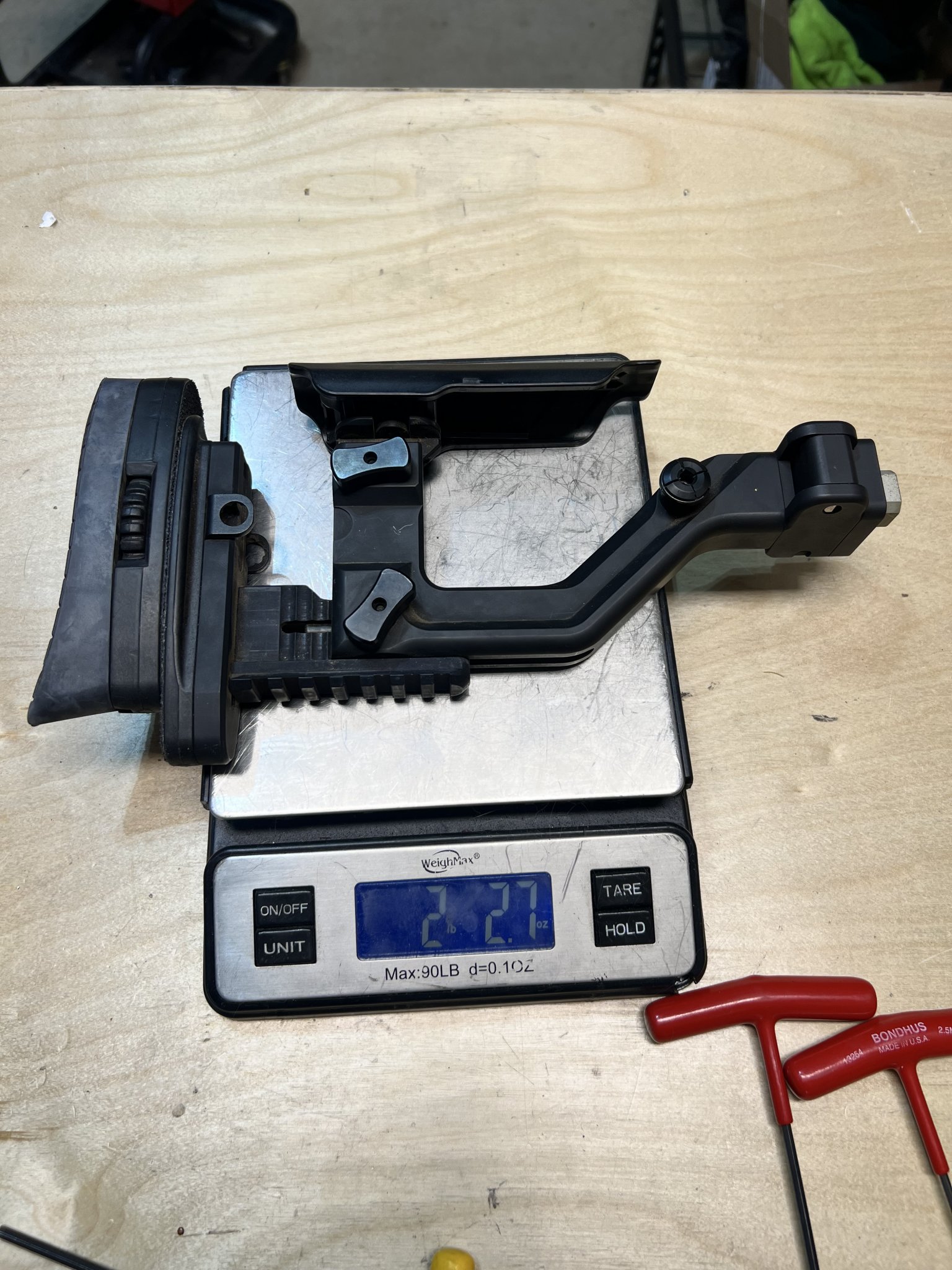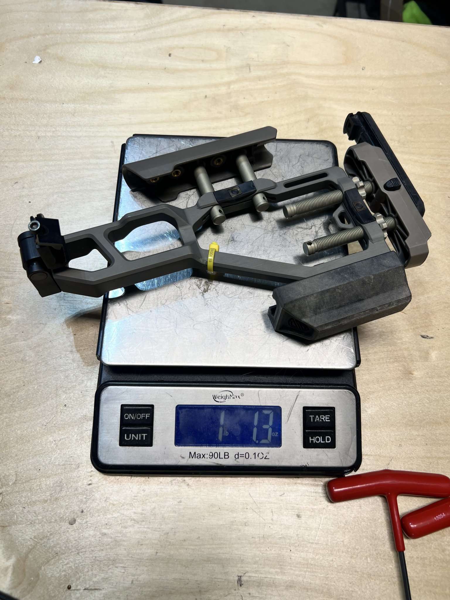This is with the high rail and a short top bridge. I left the bag rider on the stock. It’s about 1.6 oz so not much to it.Did you machine up an adapter to use the Q stock? That looks fantastic.