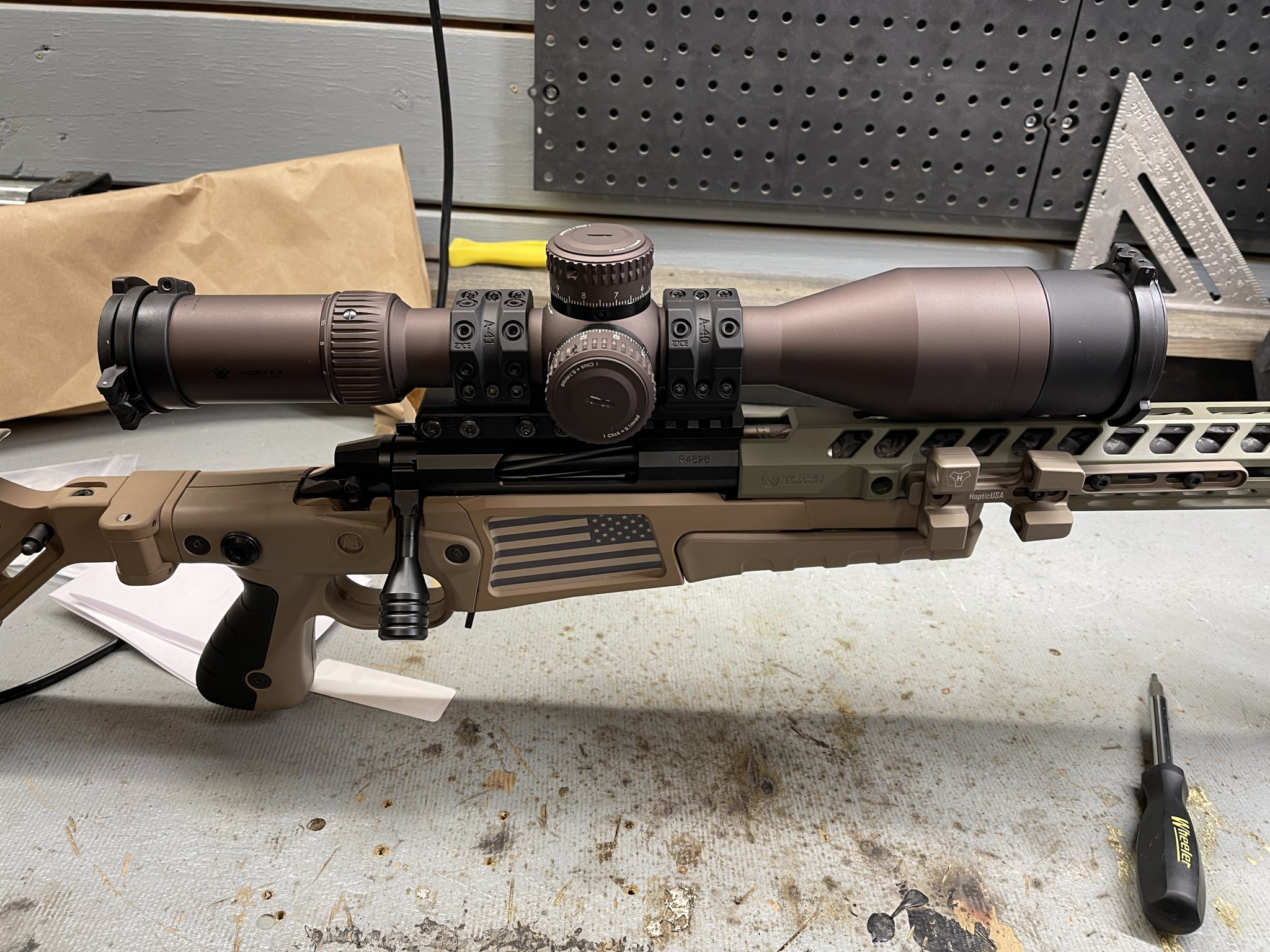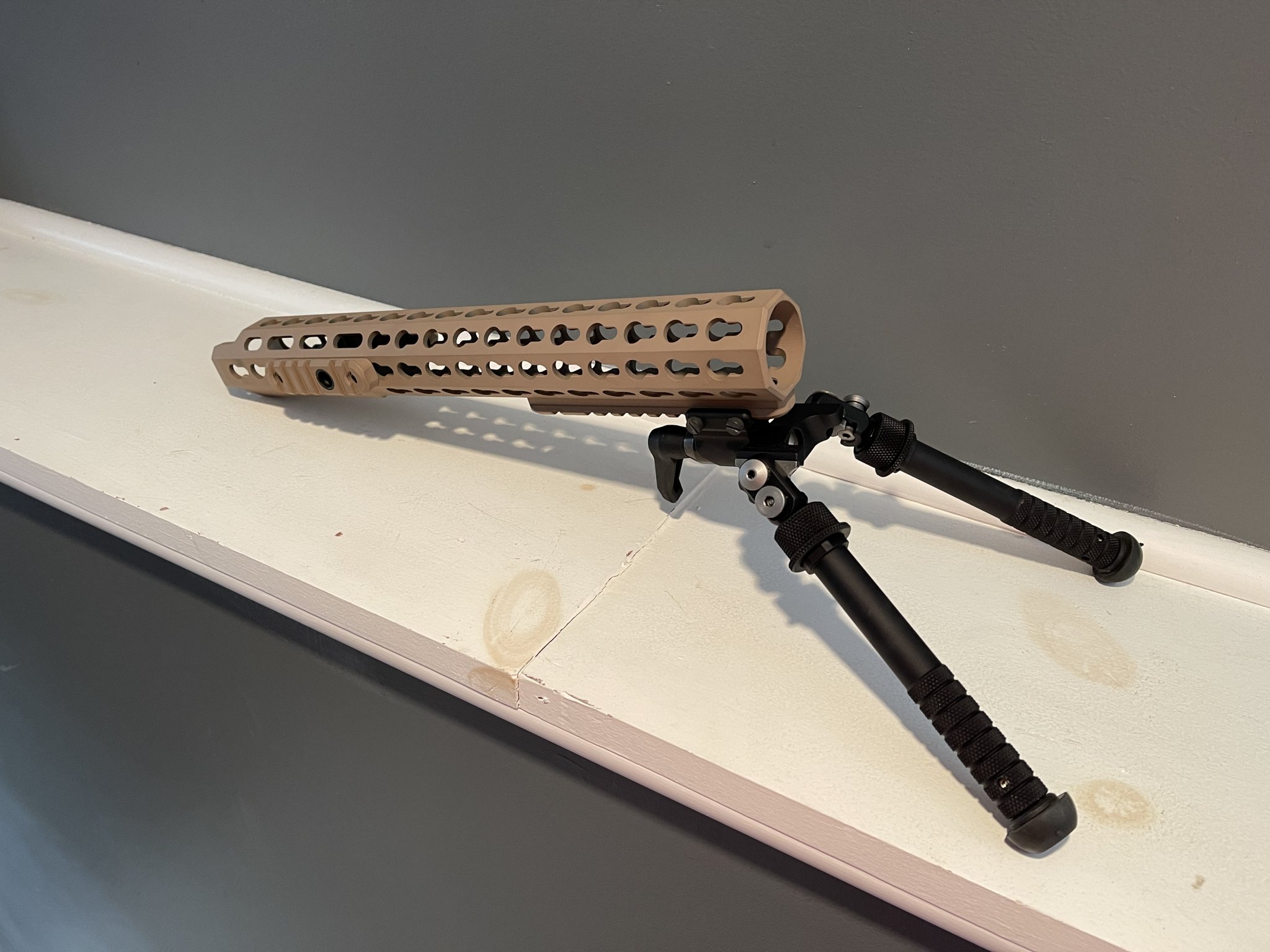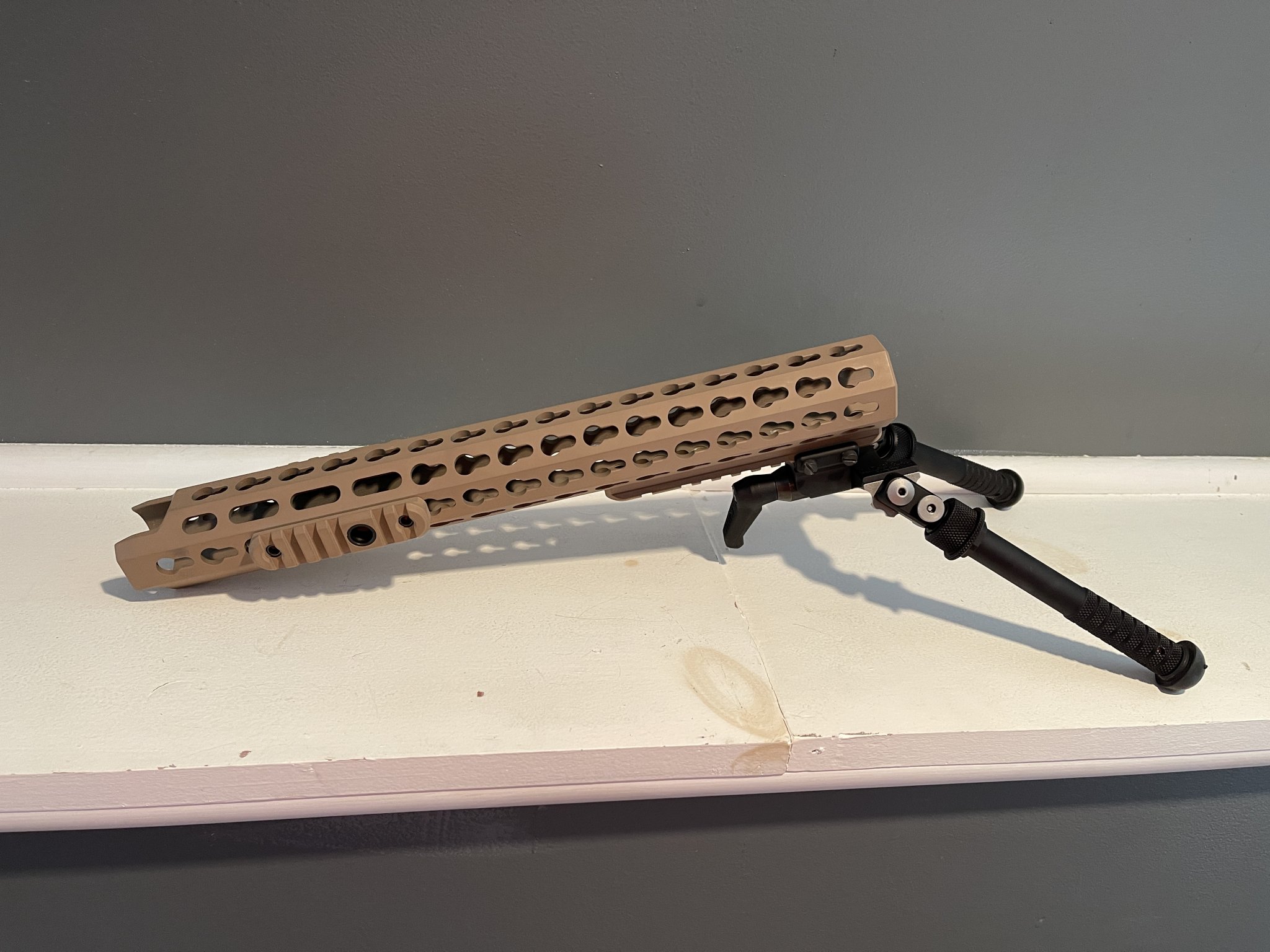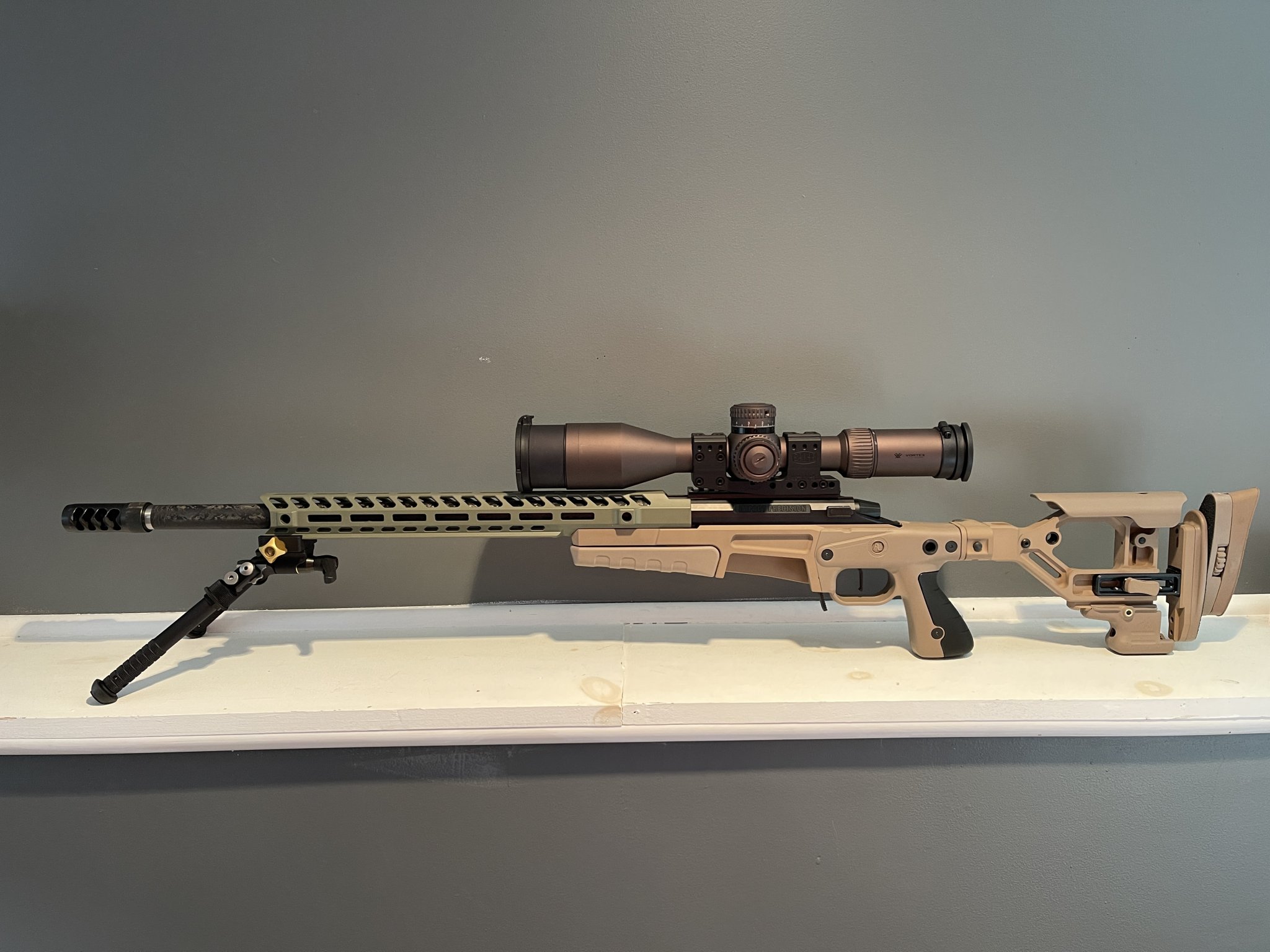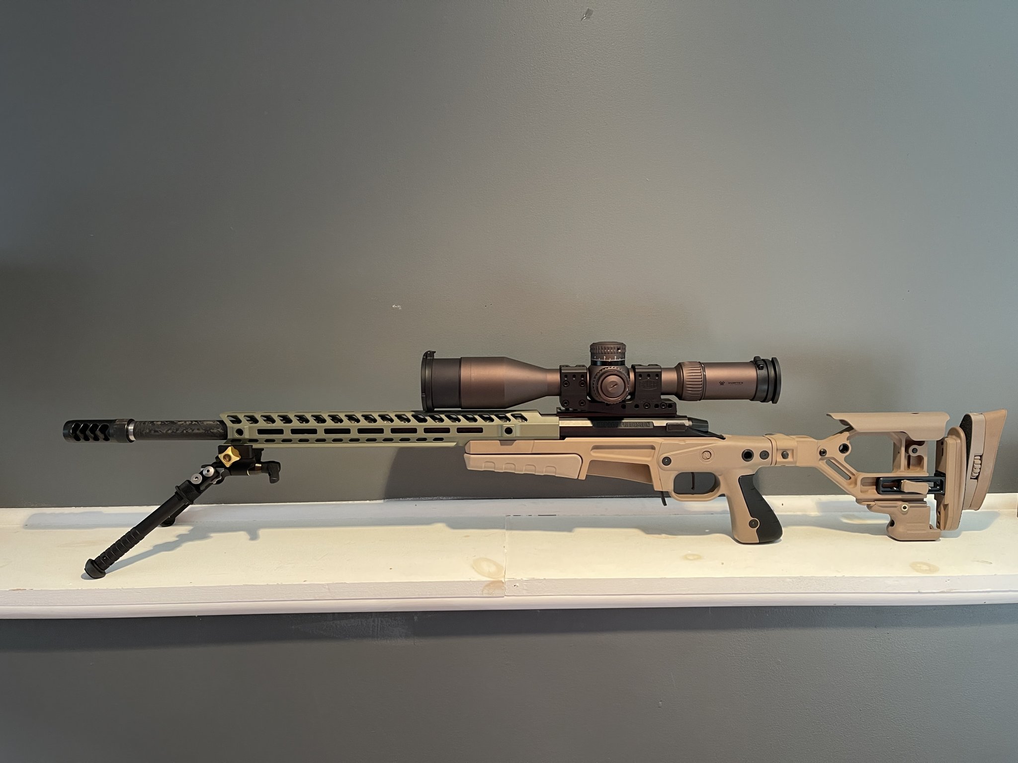 Accuracy International AX AICS Rem 700 SA chassis with Victor Company 15.5 inch hammer rail. Not pictured it will include the RRS Ax plate and a 340mm RRS key slot arca rail. Anarchy outdoors thumb rest. Hoptic 2 round holder in FDE. It will also come with the factory 13 inch keyslot rail with 2 rail sections