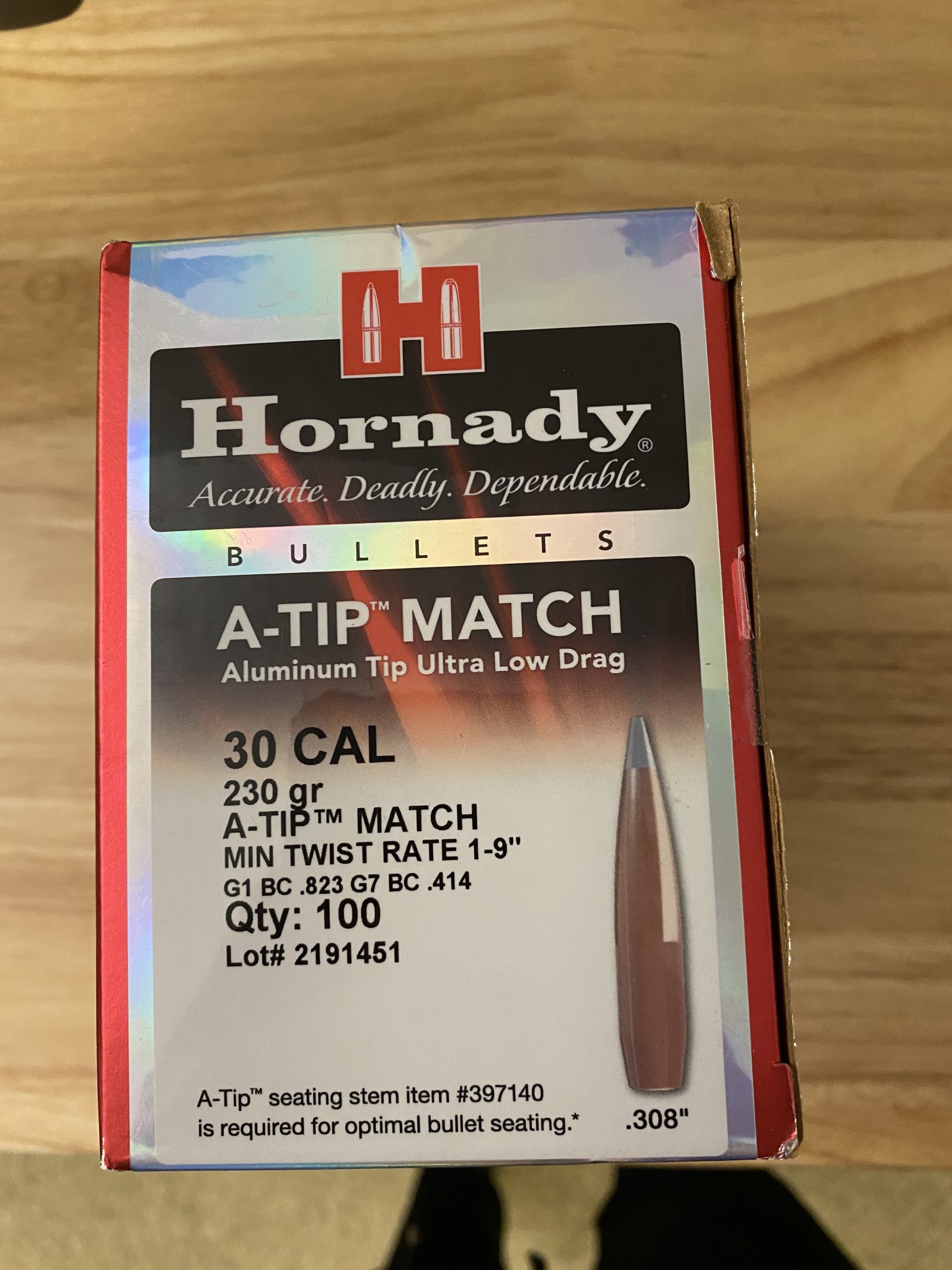One Box of Hornady 230 grain A-tips( Perfect for those who are reloading 300 Norma Mag and 300 PRC) 66 dollars+ 20 dollars shipping fee