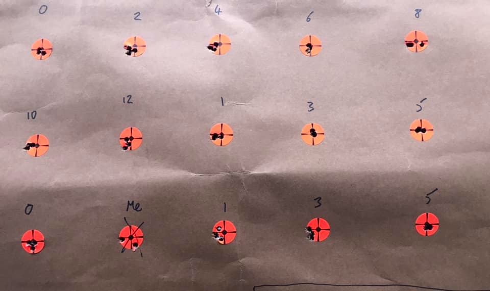 Another brain breaker, trying do to it on a 8x11 sheet of paper. I did not go to my range, I met Chris Way at a local 200 yard range near Denver. I had built a target at my range, like many above, used a 3/8" orange pasty, spread wide apart. Doing it on a single sheet made it a mess personally. I hated it.