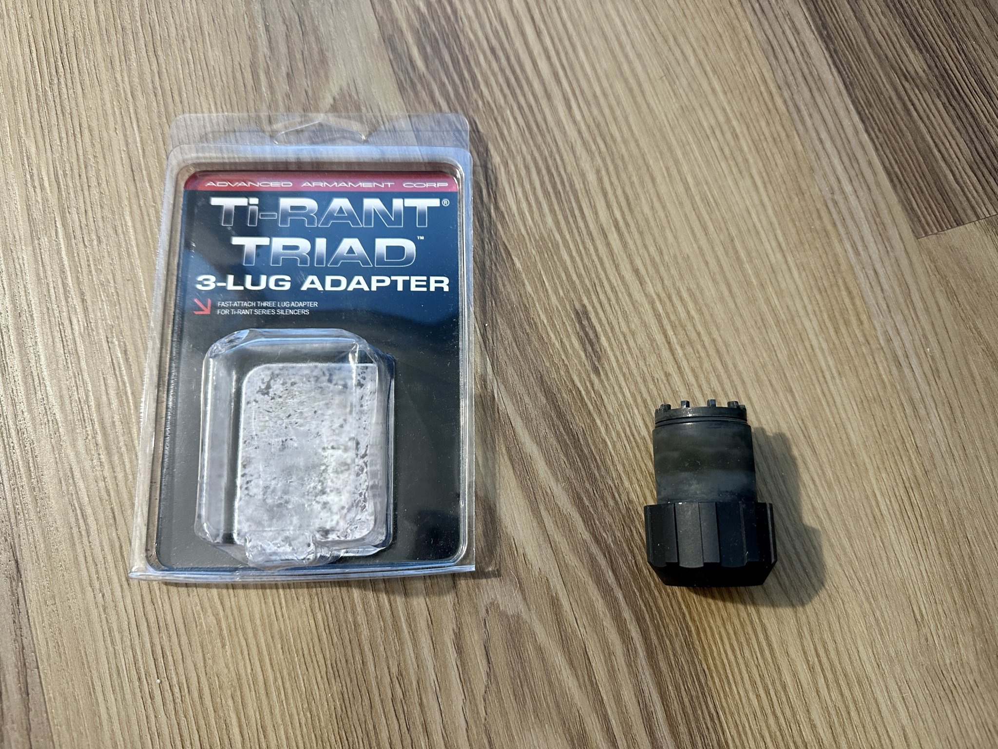 Selling my lightly used Advanced Armament Co (AAC) Triad 3-Lug Adapter Ti-RANT Suppressors Aluminum Matte. The Ti-RANT TRIAD is an adapter that adds an additional element of versatility to Ti-RANT series silencers by enabling users to quickly and easily install a Ti-RANT onto the lugged barrel of an H&K MP-5 sub-machine gun or any fixed-barrel 9mm caliber host equipped with a lugged barrel. Price shipped to your door is $110. Venmo, Zelle, Postal MO or PayPal friends and family accepted for payment.