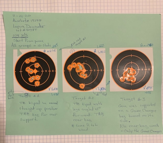 - Right group is with the gun fully supported on a Game Changer bag pinching the front of the stock into the bag. I'll take that all day long!