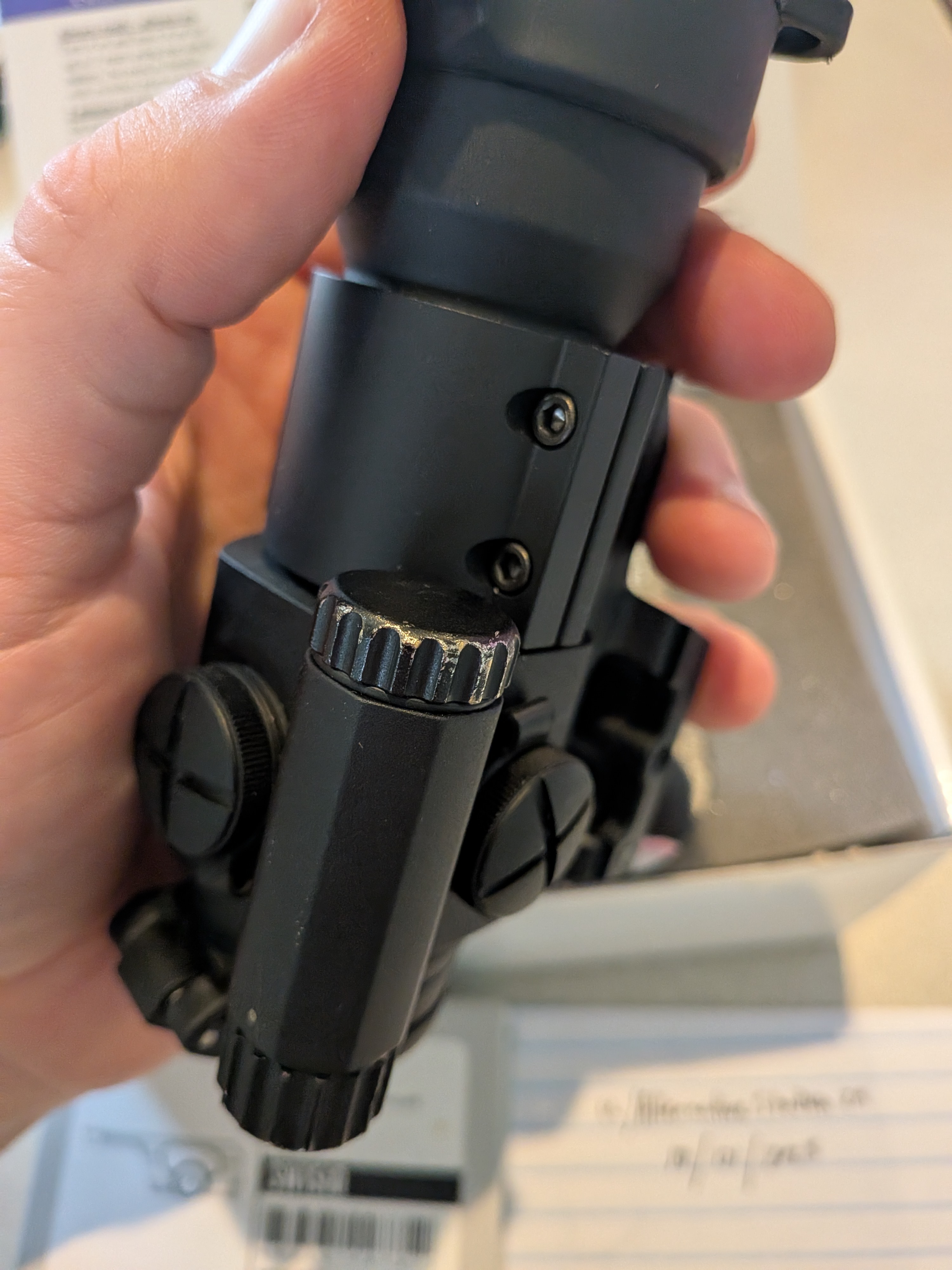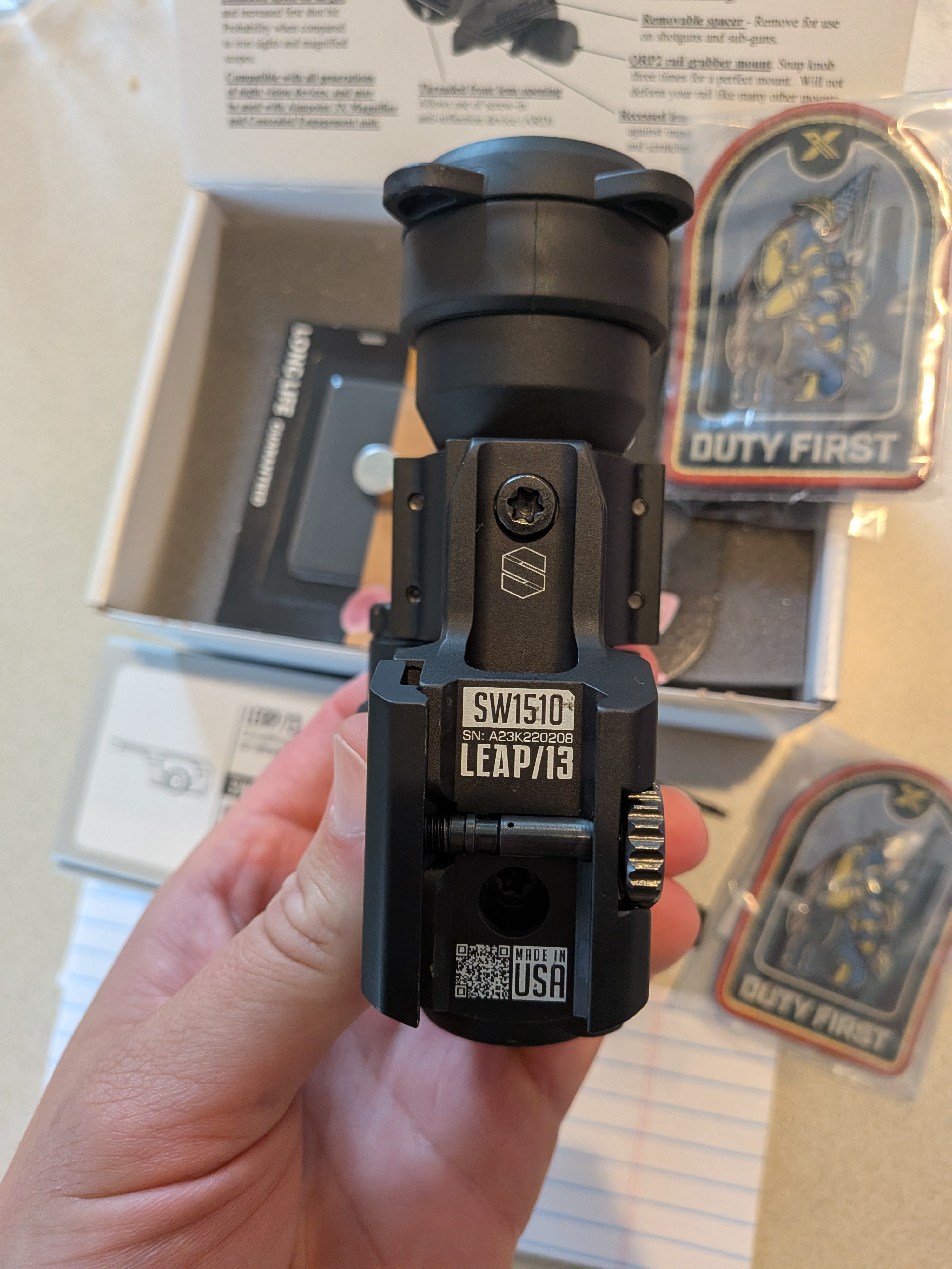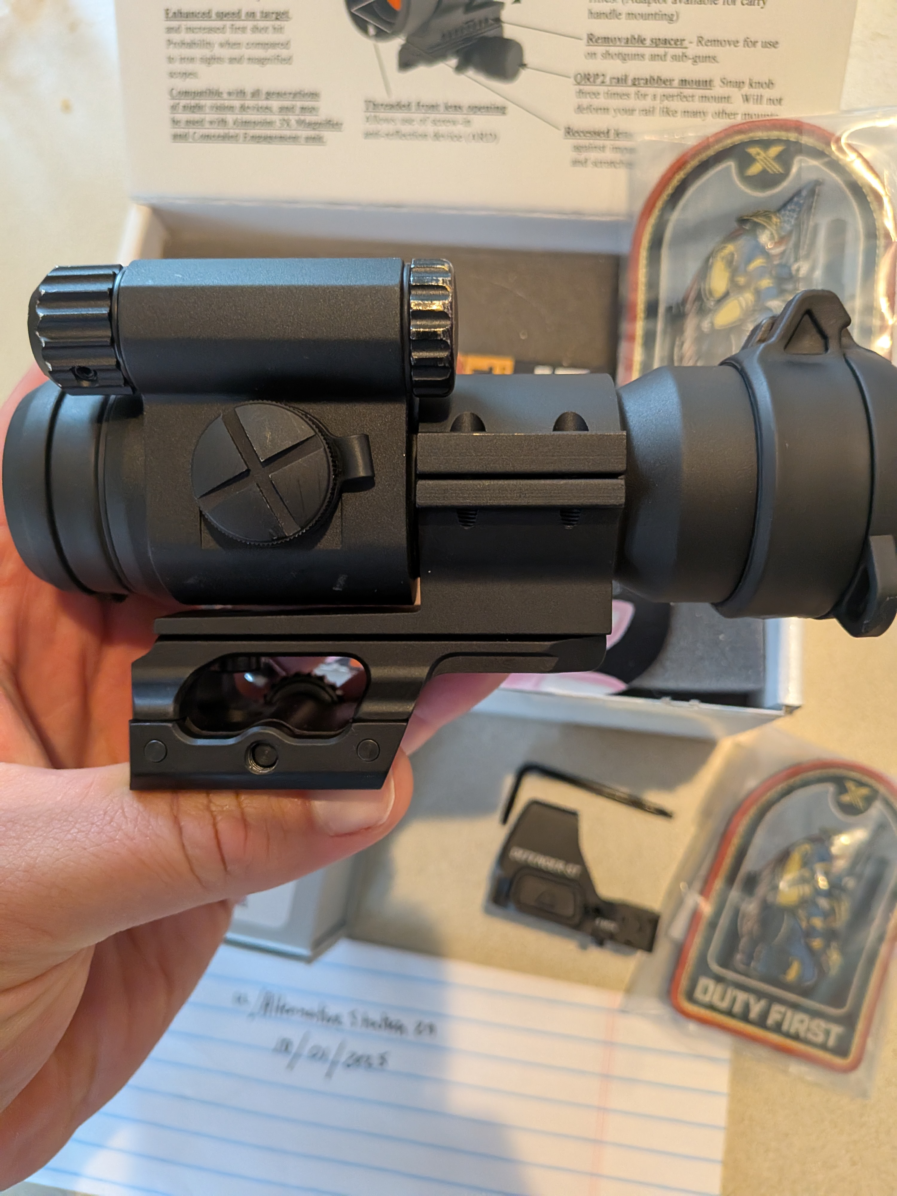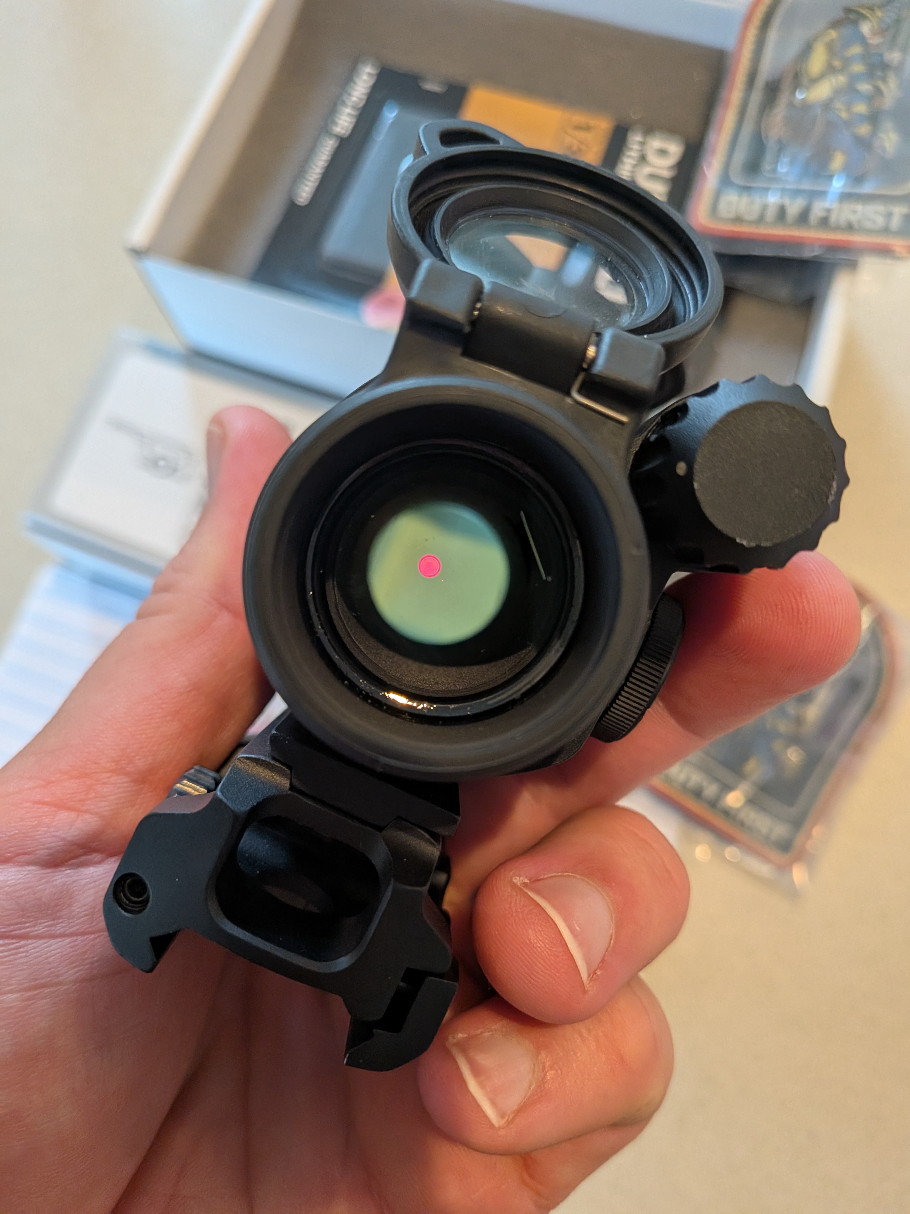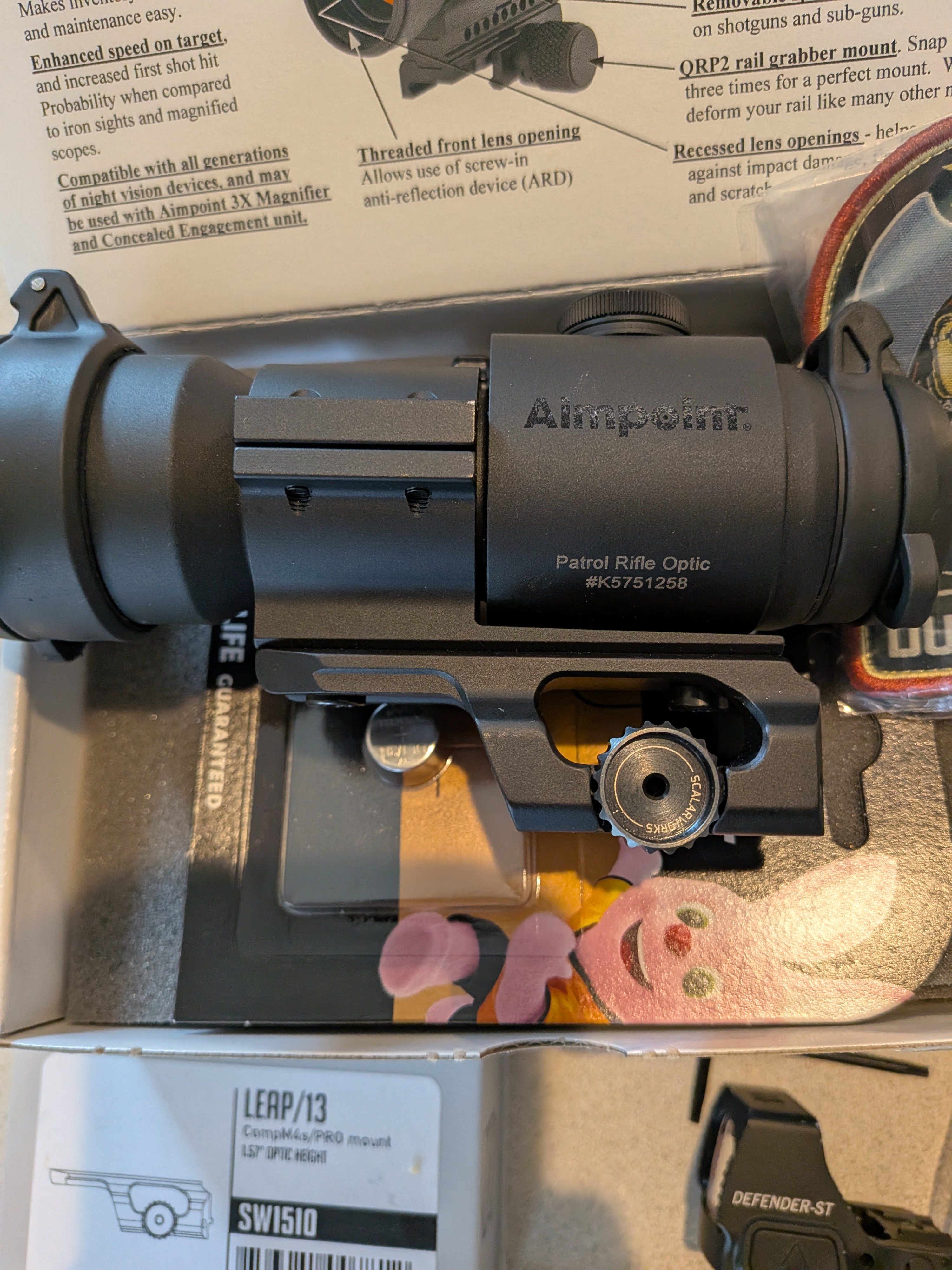 Aimpoint PRO + Scalarworks LEAP/13 1.57". Fairly lightly used mainly only scuffs around the battery compartment and adjustment caps. Has clear flip caps since I didn't like the blacked out front cap. Includes original boxes, manuals, and a battery. Includes GOVX 911 patch.