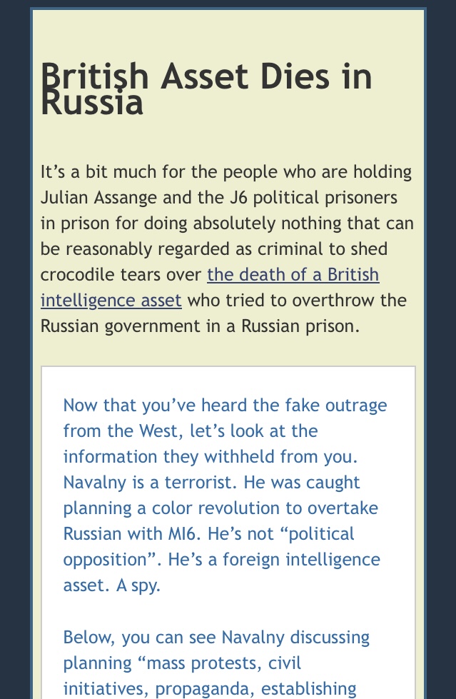 Don't give two shits, sorry. Our country is circling the drain and I'm supposed to give a fuck about a foreigner dying in a foreign prison? The Biden regime has intimidated, harassed and imprisoned political opponents right here at home, so with what moral authority are we supposed to call out Russia?