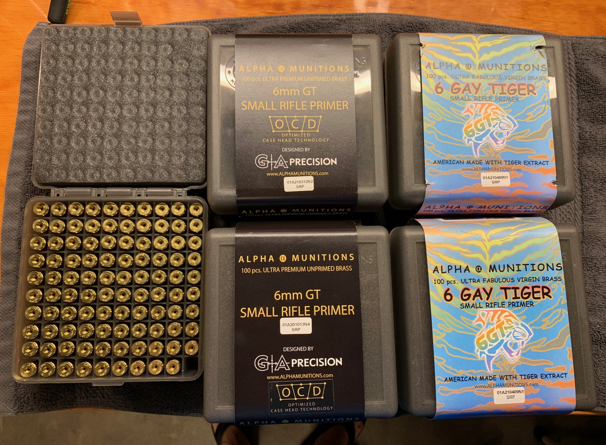 2) Alpha Munitions Brass - Quantity 3 boxes of the regular 6mmGT headstamp (one box has 99, not 100). All new OCD brass, never loaded or fired. The missing case is from making a dummy round to setup dies. Have 3 boxes of the regular 6mmGT headstamp (lot numbers shown in pics). Will sell the200 Gay Tiger headstamp ones for $SOLD, the 3 boxes of standard headstamp for $SOLD.