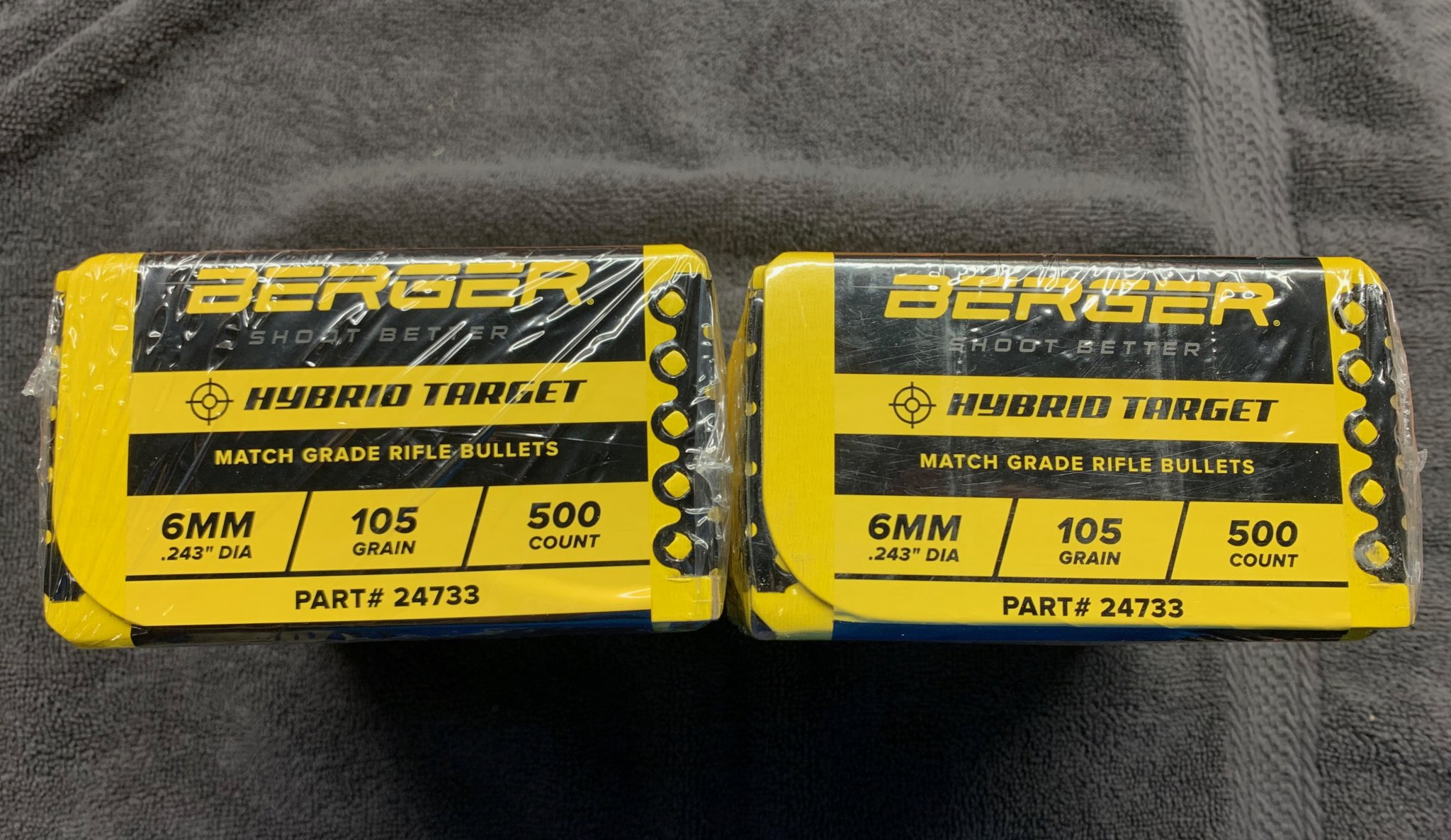 1) Quantity 1,000 (2 x 500 ct) Berger 105 Hybrid Bullets. New in plastic. One Lot P0245, the other is P02452. Price is $SOLD for both boxes of them.