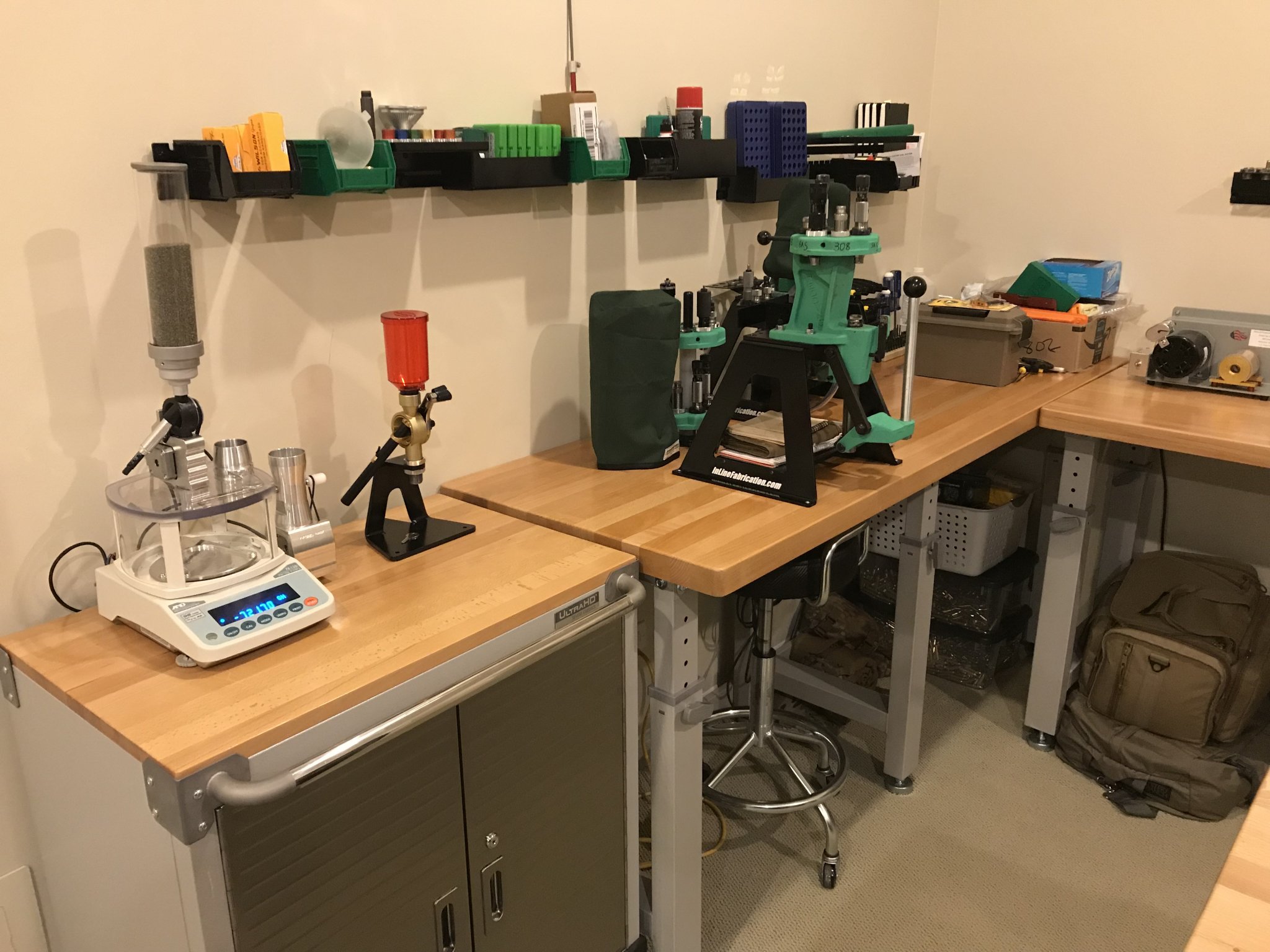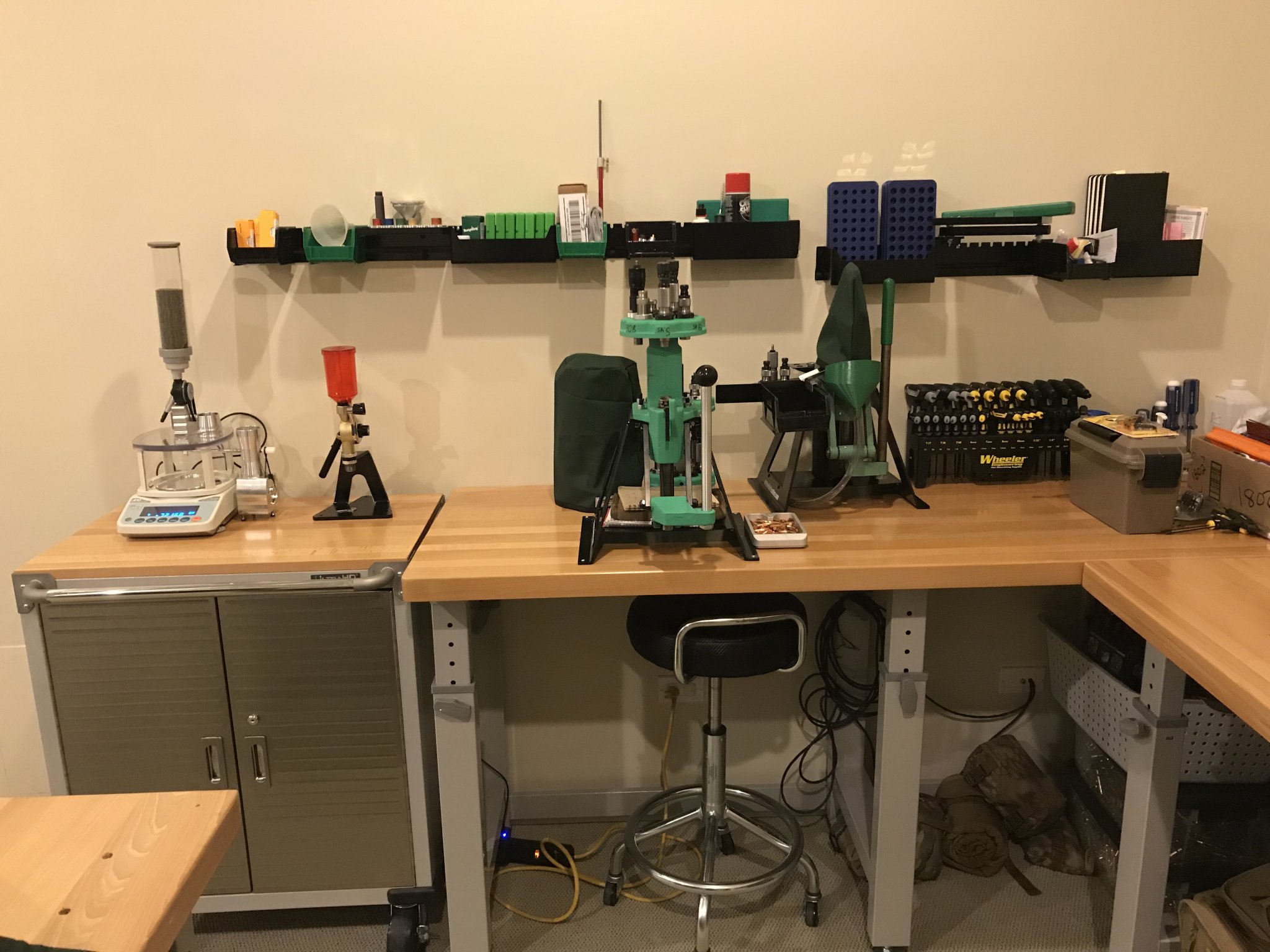 Right now I have 2x RCBS Rockchuckers next to each other as well as my Dillion 650. The Dillon is specific to 3 things; case prep on certain calibers and then all of my non Mk12 rifle 5.56 loading and all of my 45ACP loading.