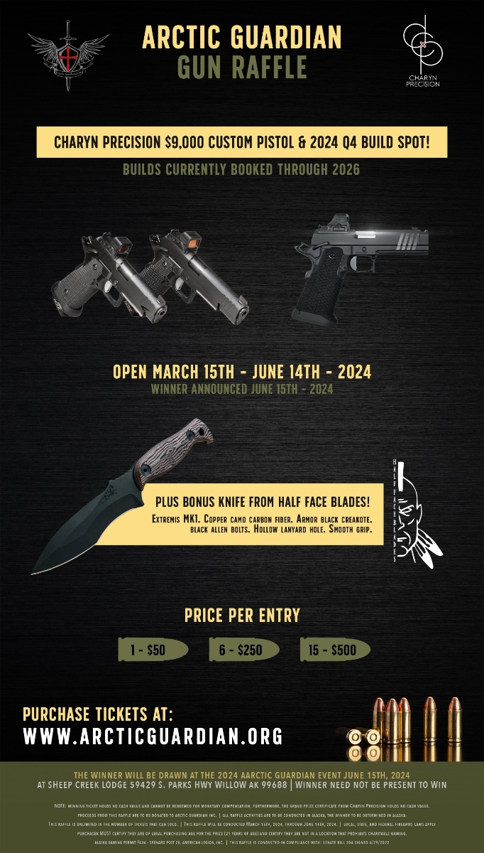 Very cool organization up in Alaska supporting active duty Military & Law Enforcement is raffling off a $9000 custom 2011 build by master pistol builder David Charyn with a Q4 2024 build date -(currently booked thru 2026). Details and link here and in the photos: