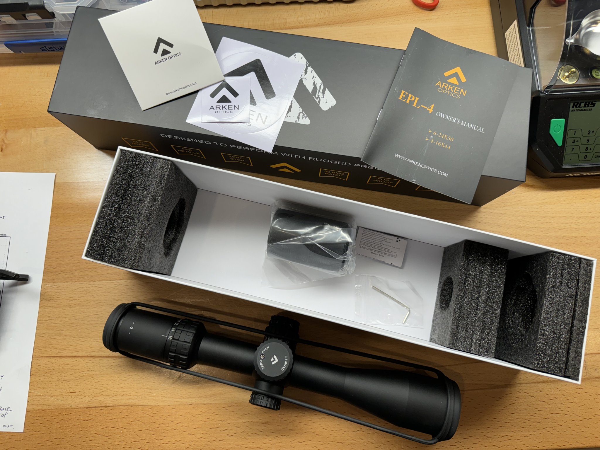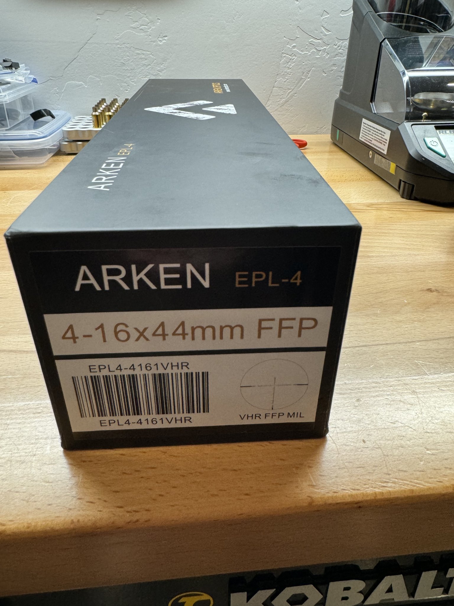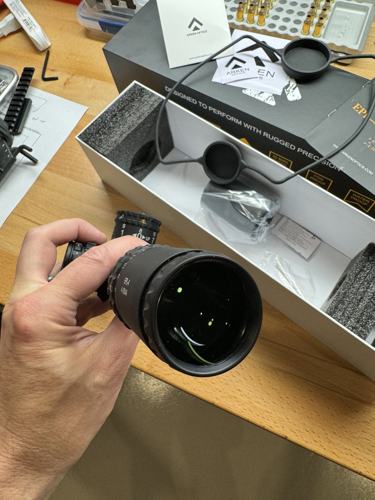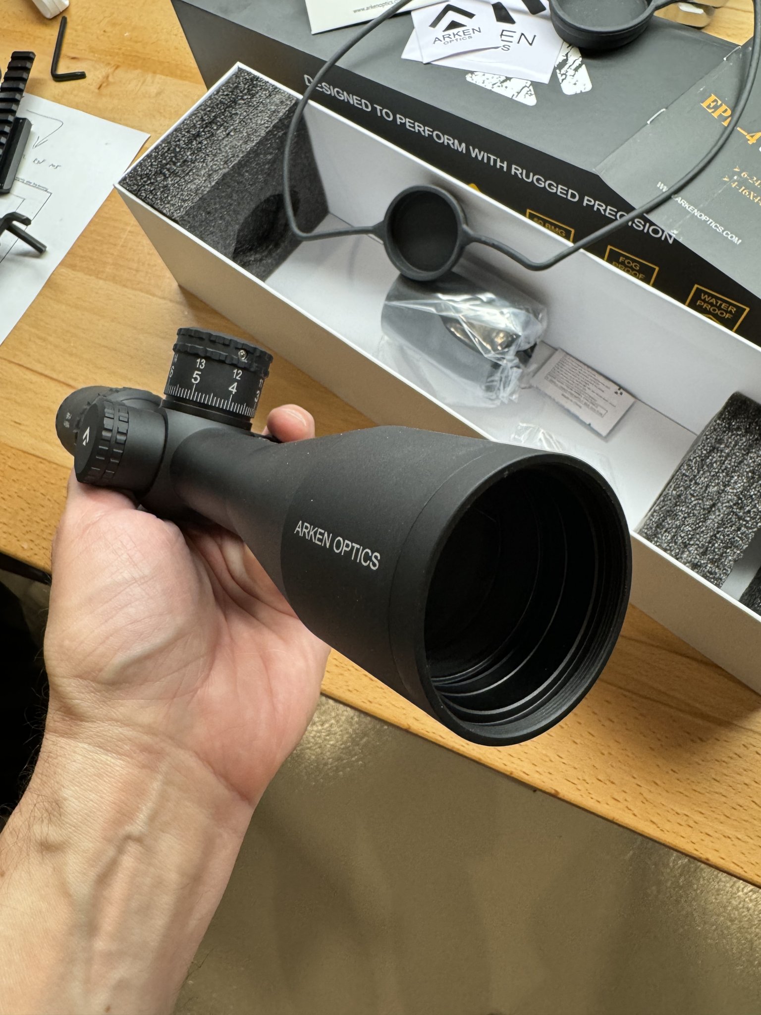 This is Arken's "lightweight hunter" scope, so it has a capped windage turret, a small 44mm objective, and the VHR illuminated reticle which is a straight crosshair style, but it is in mils. Very light.