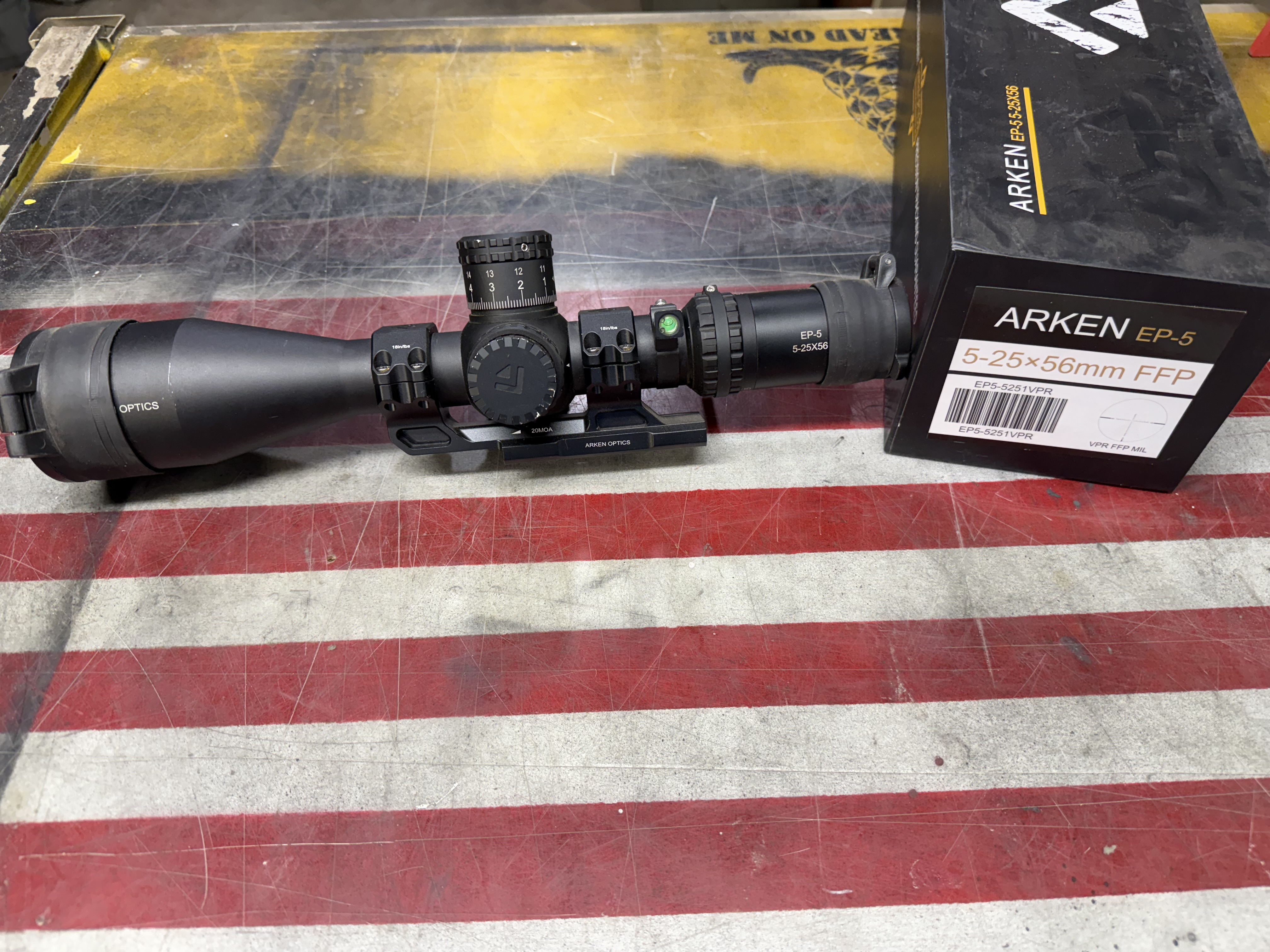 Arken EP 5-25x56 mil with cantaliver mount and level with throw lever and box 450 shipped