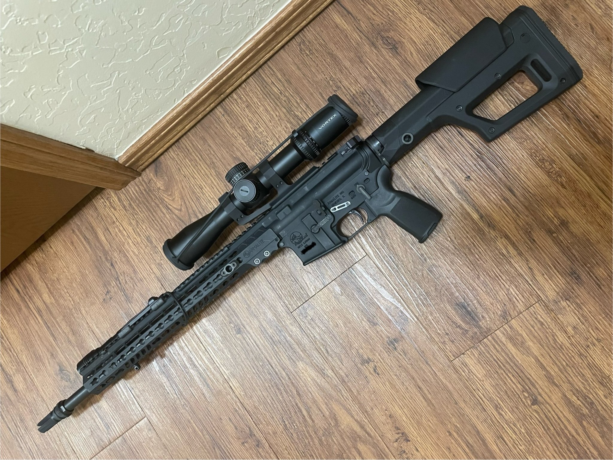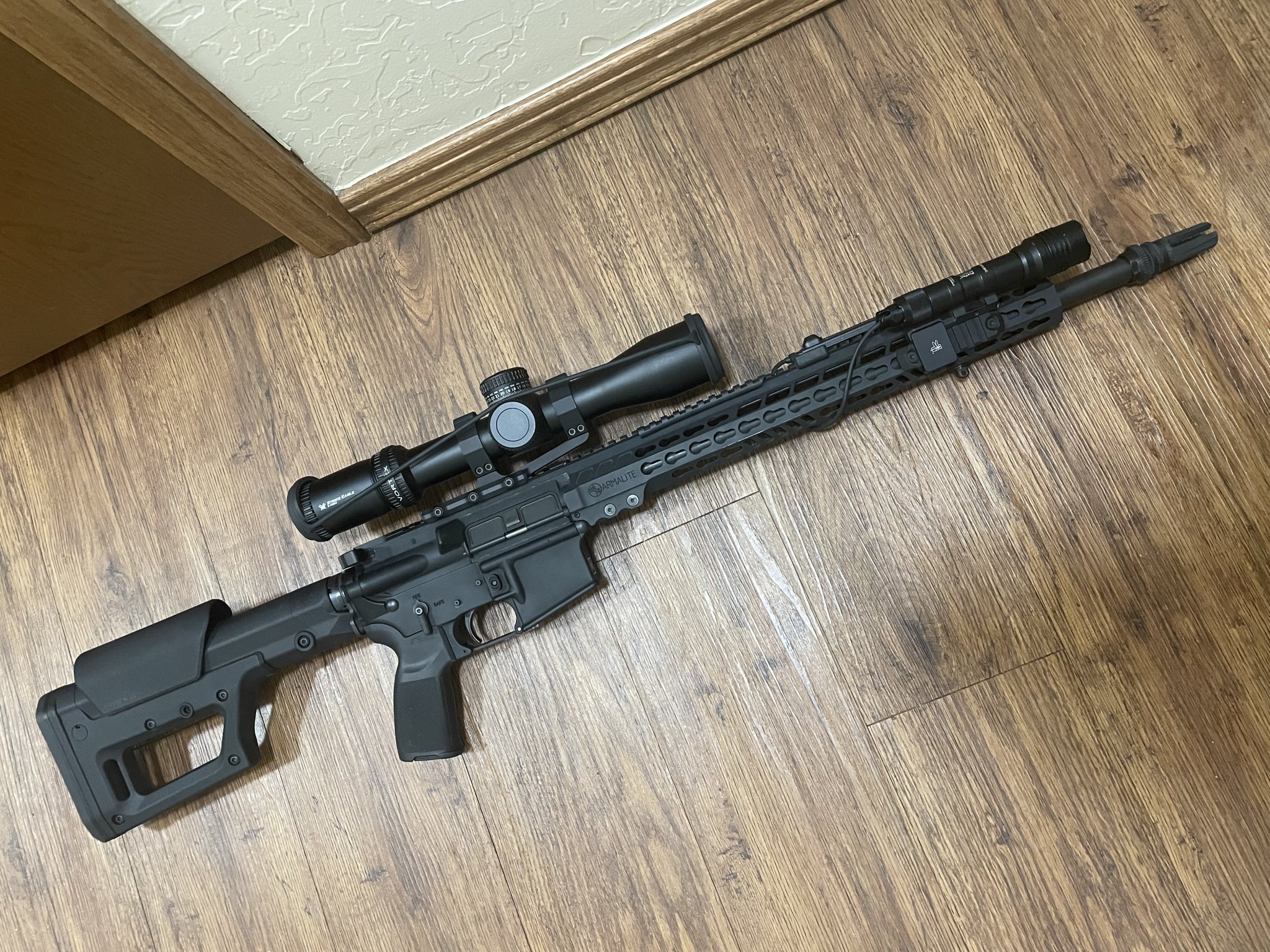 I am liquidating several things, and among them is my Armalite M-15 Tactical. From the factory it shot about 1.5-MOA so I swapped to an Odin barrel and now it is a pretty consistent .6 shooter. I also installed a geissele 2 stage, a PRS Lite, and I topped it with a Gen 3 Strike Eagle 3-18x44 EBR-7C MOA. It’s had around 350-400 rounds though it. It does show signs of light use.