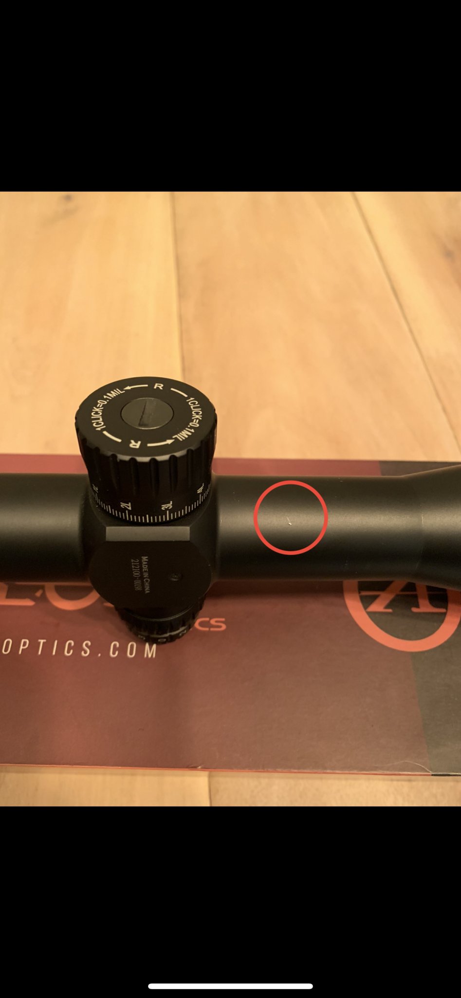 Has one small knick in it, (circled in red) otherwise in great shape. It was previously on a .22lr. Has been sitting on a shelf for the past 8 months. Have box, user guide and cleaning cloth
