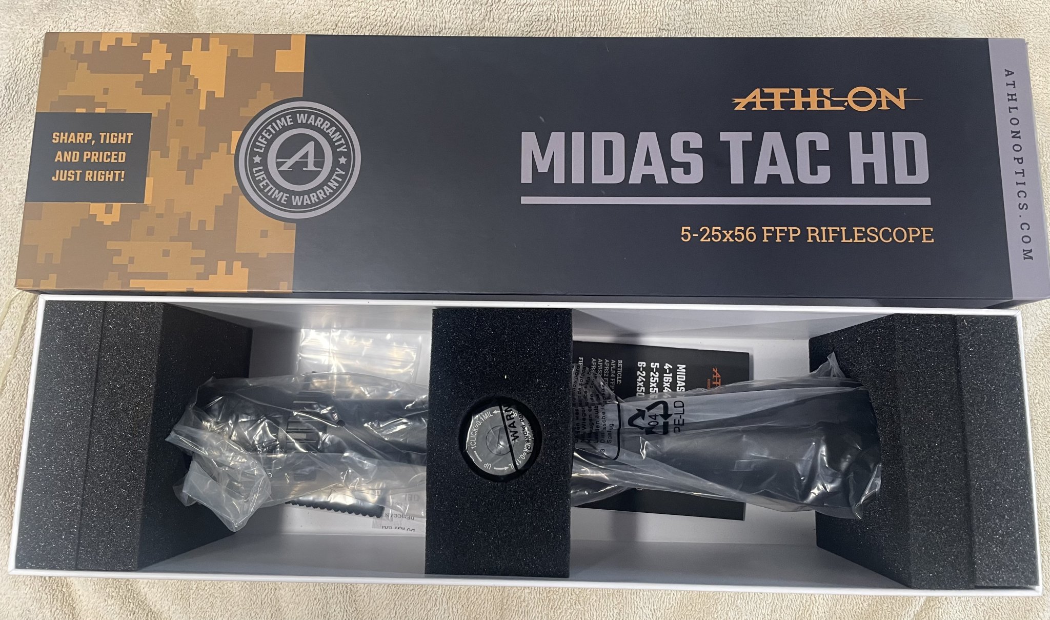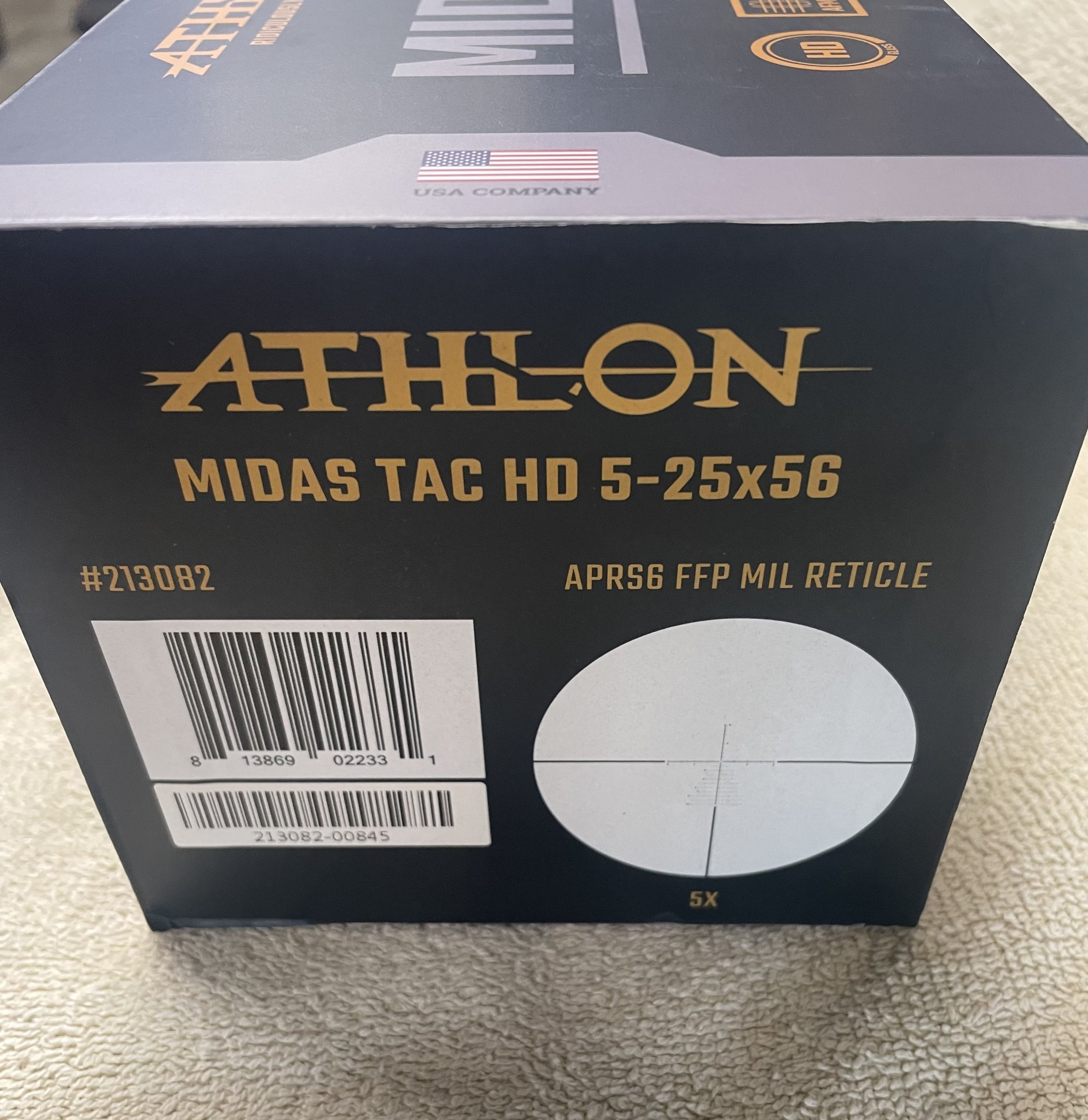 Athlon Midas Tac 5-25x56 (#213082) rifle scope. 34mm tube, FFP, with APRS6 reticle.