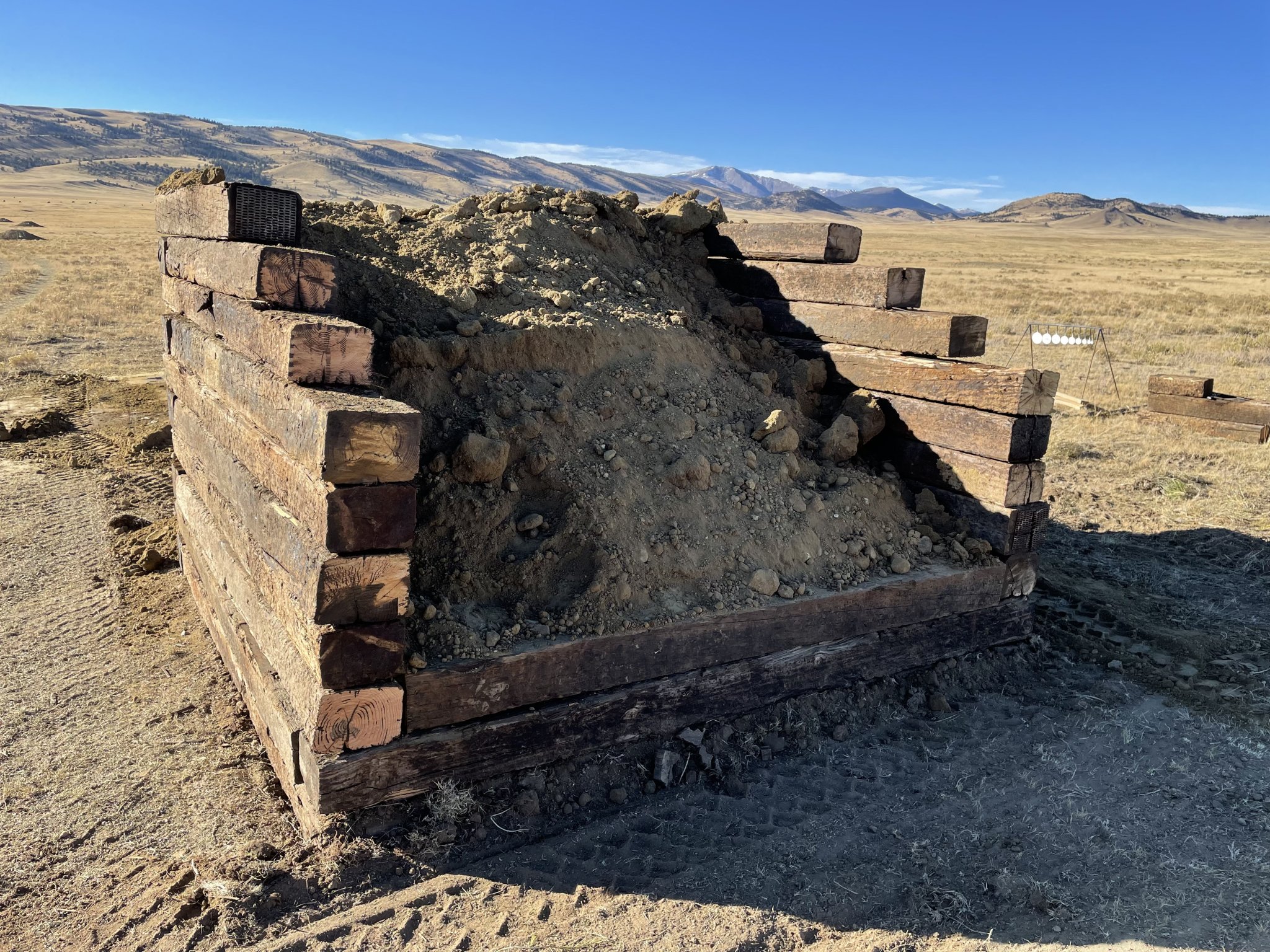 The local schuetzen range has a railroad tie, a foot of caliche base, and then another railroad tie. It’s overkill but if you are going to stack at least two deep it’s worth it to fill with some dirt inbetween the two for free insurance.