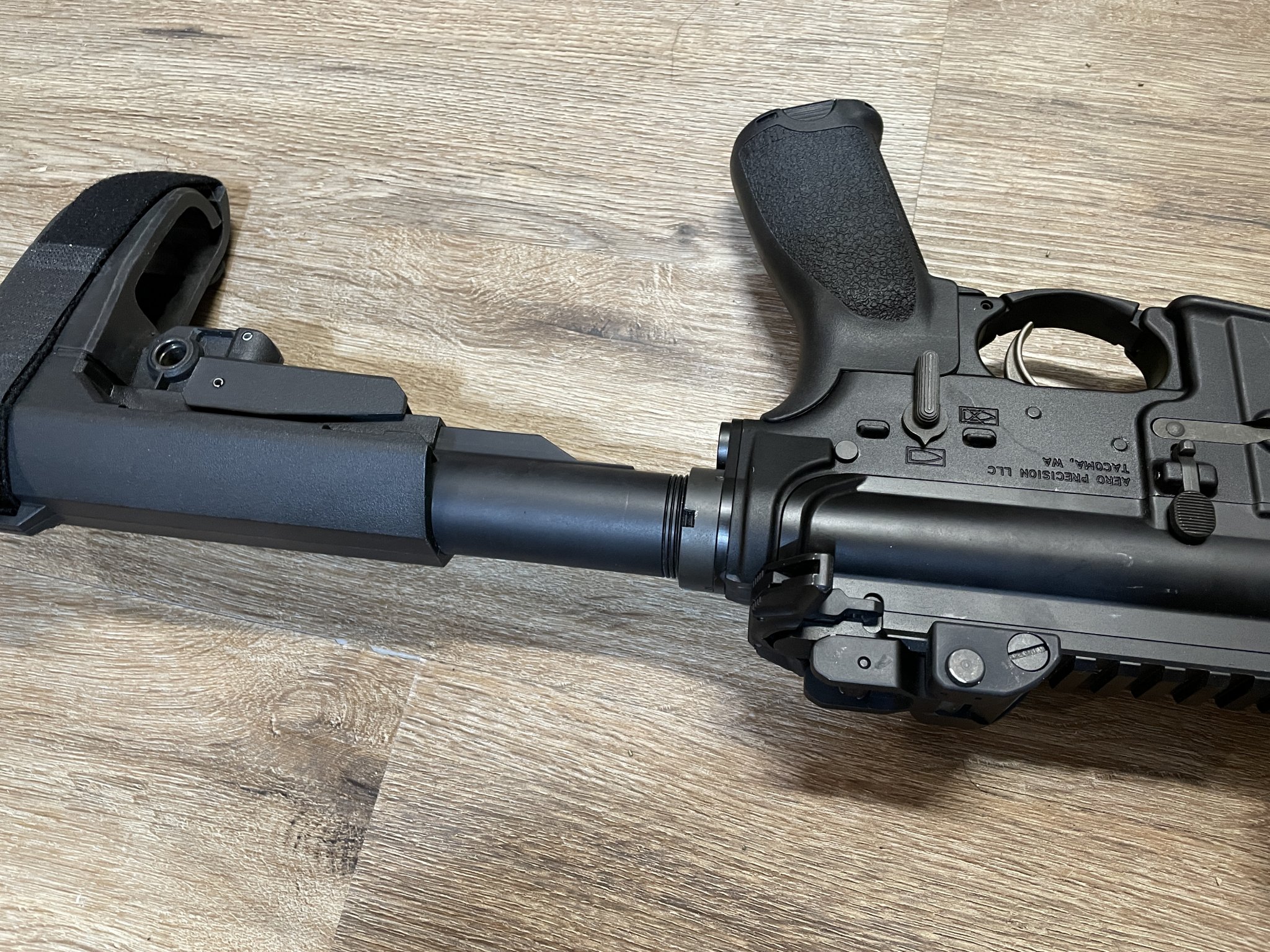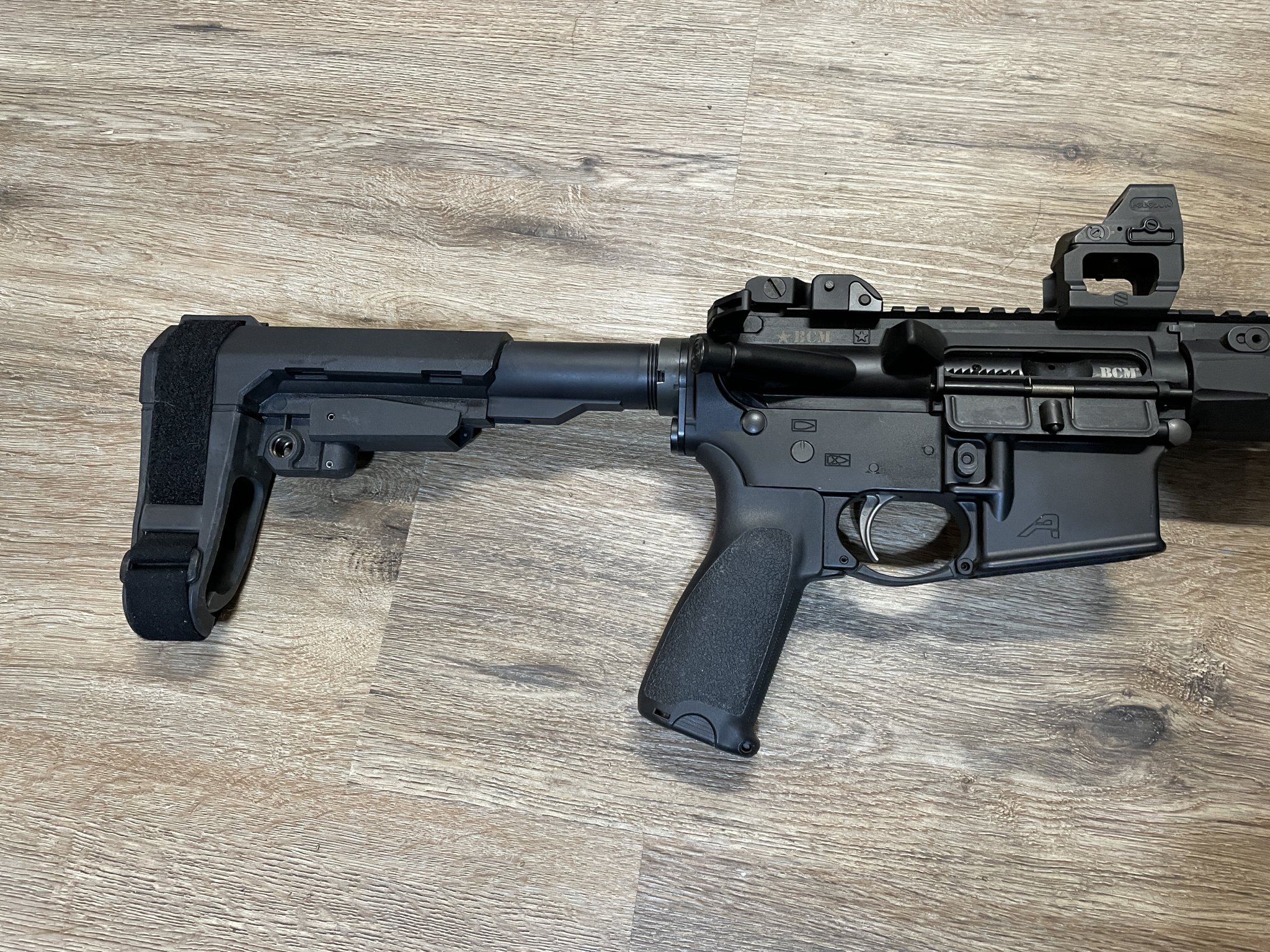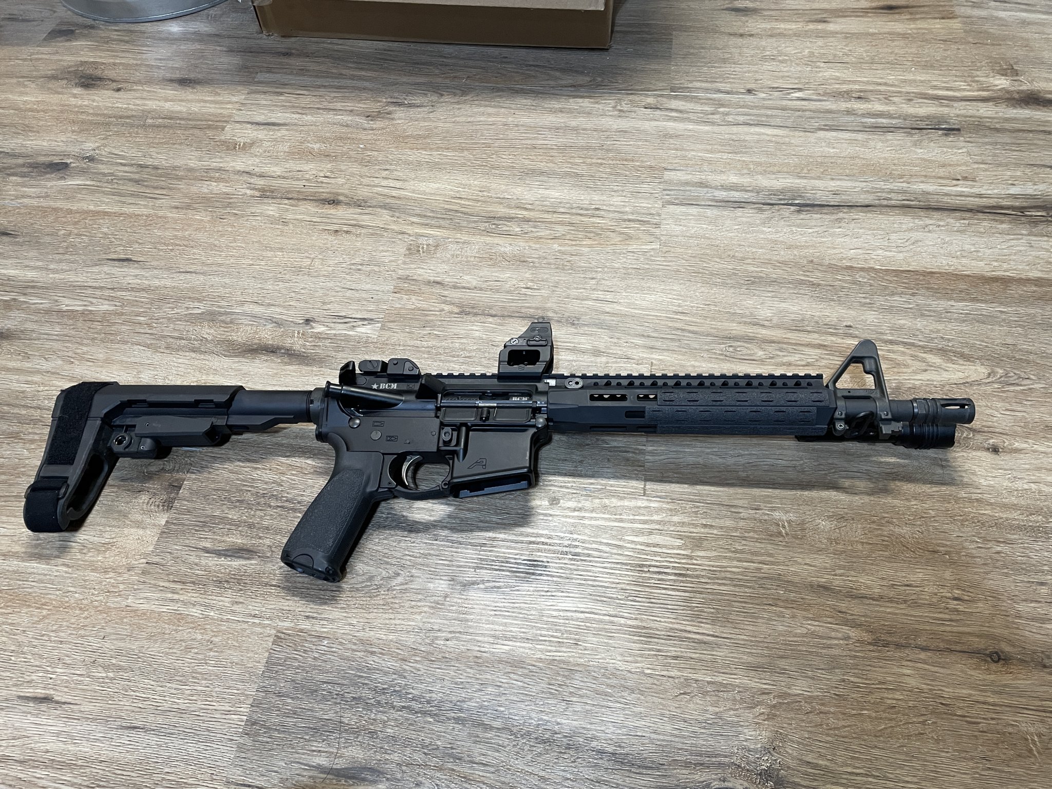 This is a full BCM upper with BCM BCG and charging handle. BCM marked (Troy I believe) back up rear sight. Mlock fore end with the front sight post. Front sight post is not the gas block. Lower is an Aero. BCM enhanced trigger group, grip and trigger guard. SB pistol brace with JP silent capture buffer system.