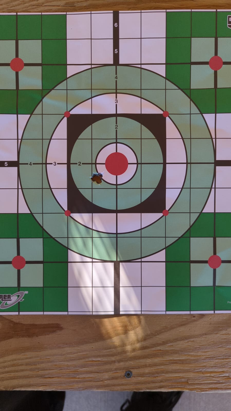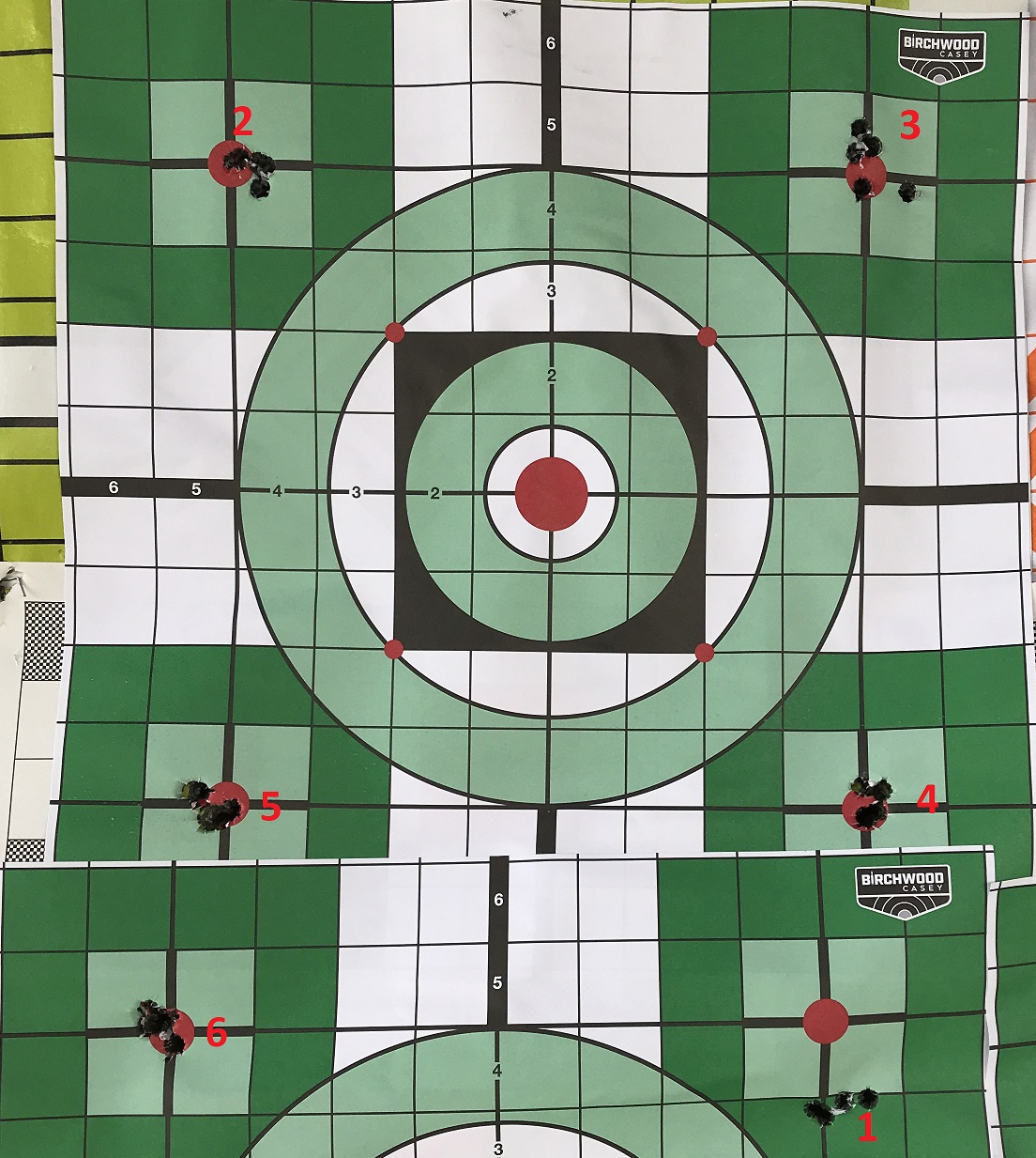 The first shot was about 3" to the right of the target. The next two shots were off the page. I aimed at a target lower down on my page and found it hit about 3" high and 3" right. After that things seemed to settle down but towards the end of my range session the shots started climbing with each successive shot.