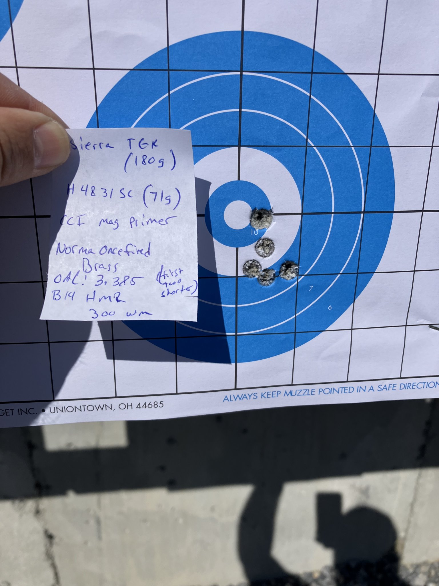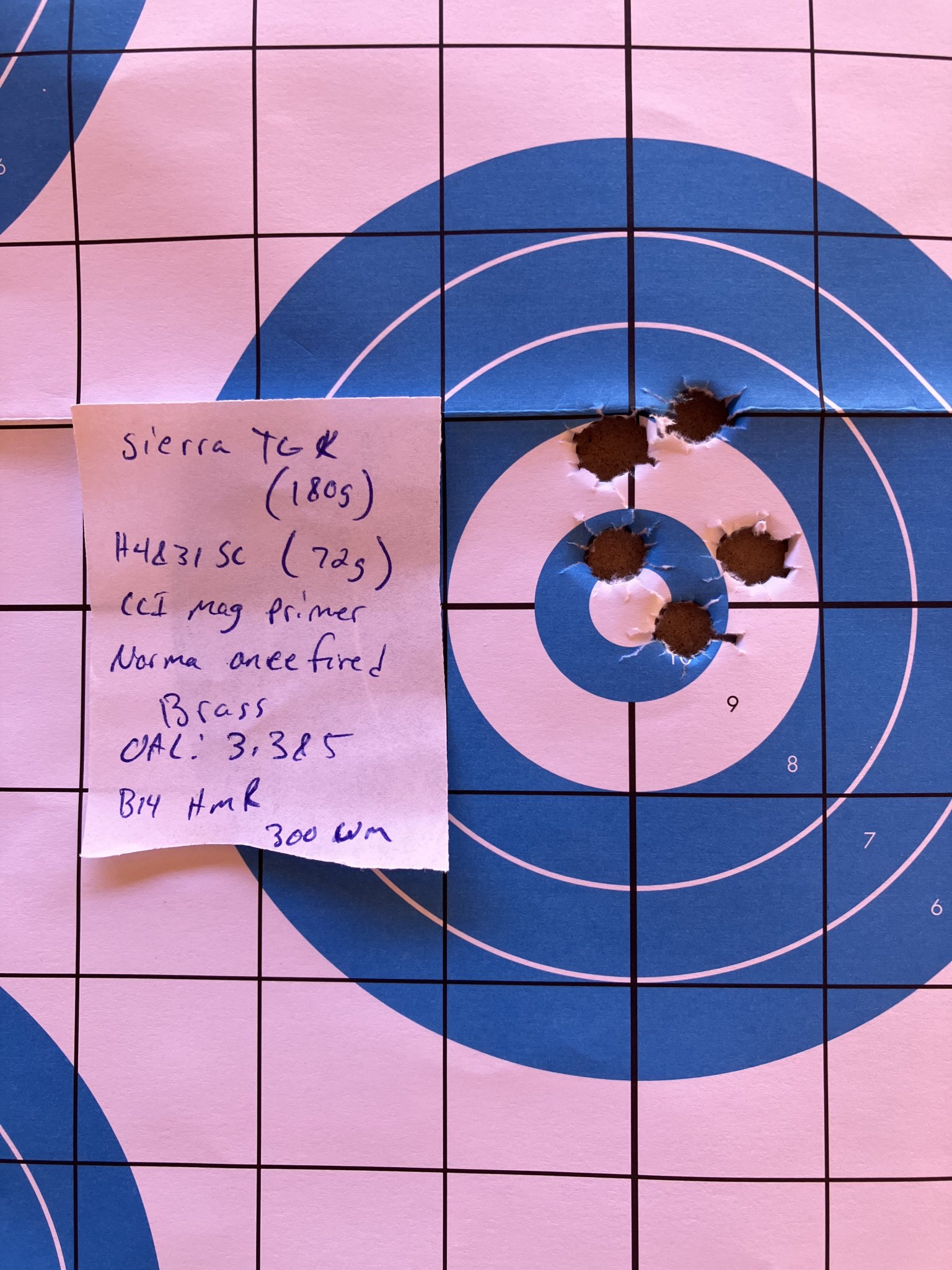 I have had zero problems from the magpul mag (probably have had around 220 rounds through the rifle). I have shot out to around 900 yards just messing around on my property and on the Most still day of doing that I shot a five shot group and it ended up putting 4 inside the length of my hand. And the 5th one is off of the picture below and to the right just a hair which was most likely operator error. In the picture I have x'd out a hole that did not belong to the group of 5 shots. ( I am the same one that posted the pics of the of the 100 yd group with the dime and the pics of my rifle)Since this is a thread about the 300wm, anyone else have a report on it? Very close to pulling the trigger on one and was wondering how the 300wm Magpul mags are working. Anyone shot it out to or past 1k yet?
