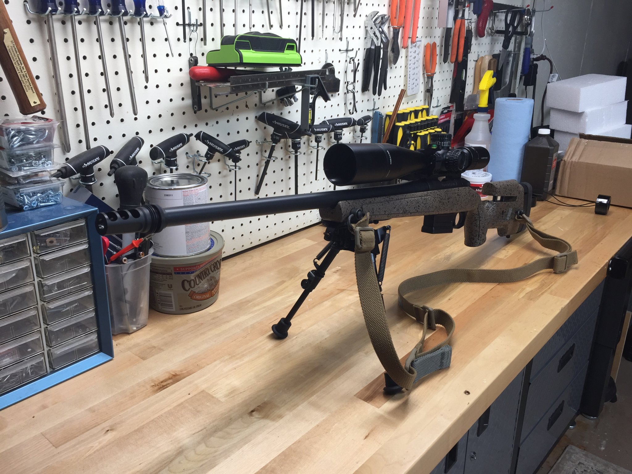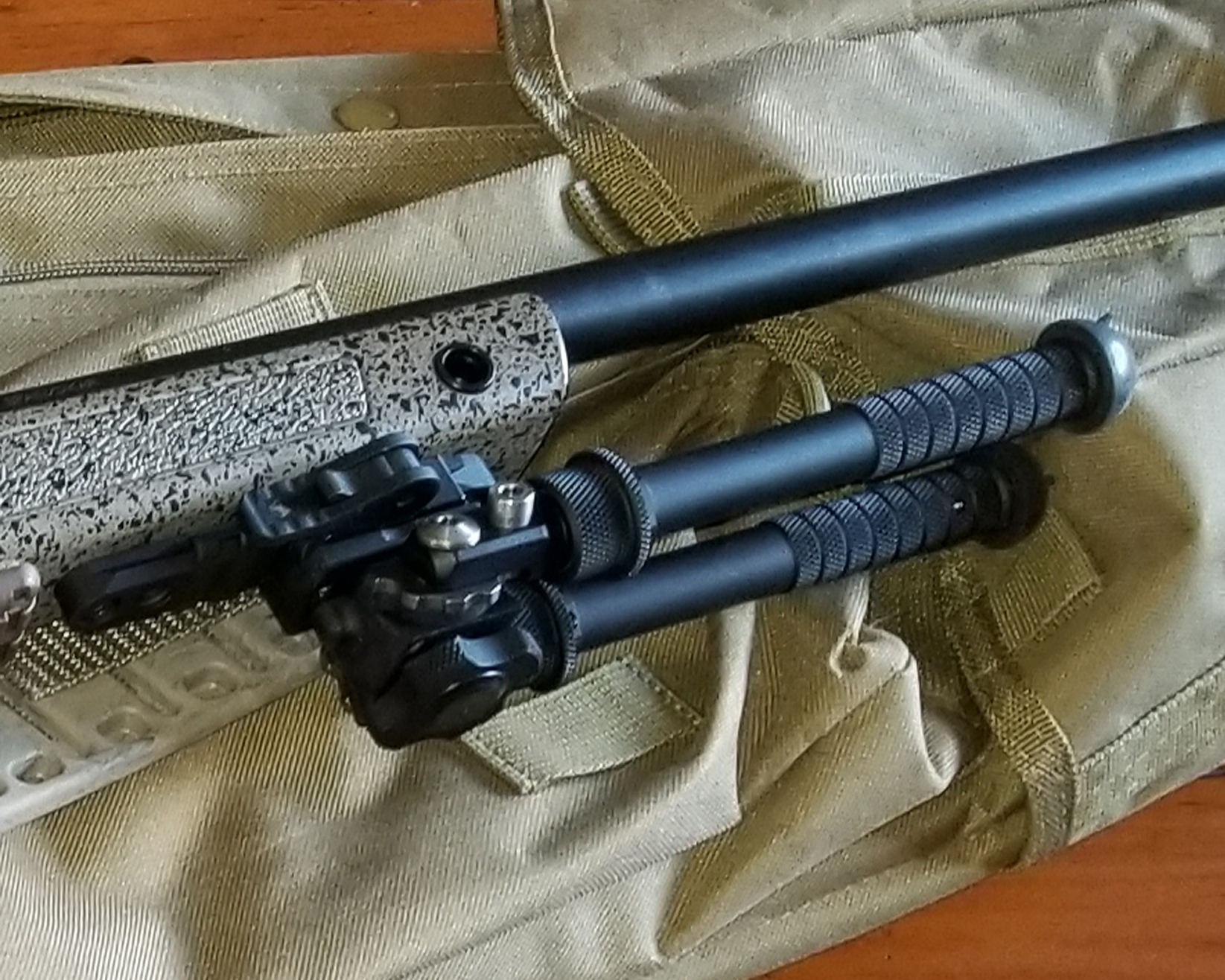 The front sling studs are a little farther apart than most, about 3.2" and will require an Accushot BT17 rail (waiting on mine) to mount an atlas bipod or any other pic mounted bipod.