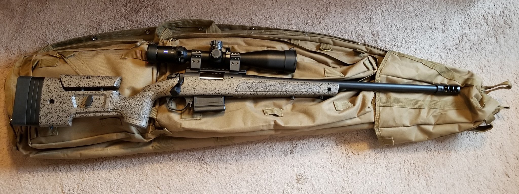 Bergara B14 HMR 6.5 Creedmoor, 20MOA Talley Reminton 700 SA base, Talley 30mm High 6-Screw Rings, Patriot Valley Arms "Jet Blast" Muzzle Brake, Zeiss Conquest V4 6-24x50 MOA1 Reticle Illuminated 80 MOAs total elevation w/ Butler Creek Flip up caps. The muzzle brake makes the 6.5 Creedmoor even more enjoyable, great optical follow thru when I can see the impact, and no one in the neighboring lanes complains about getting blasted.