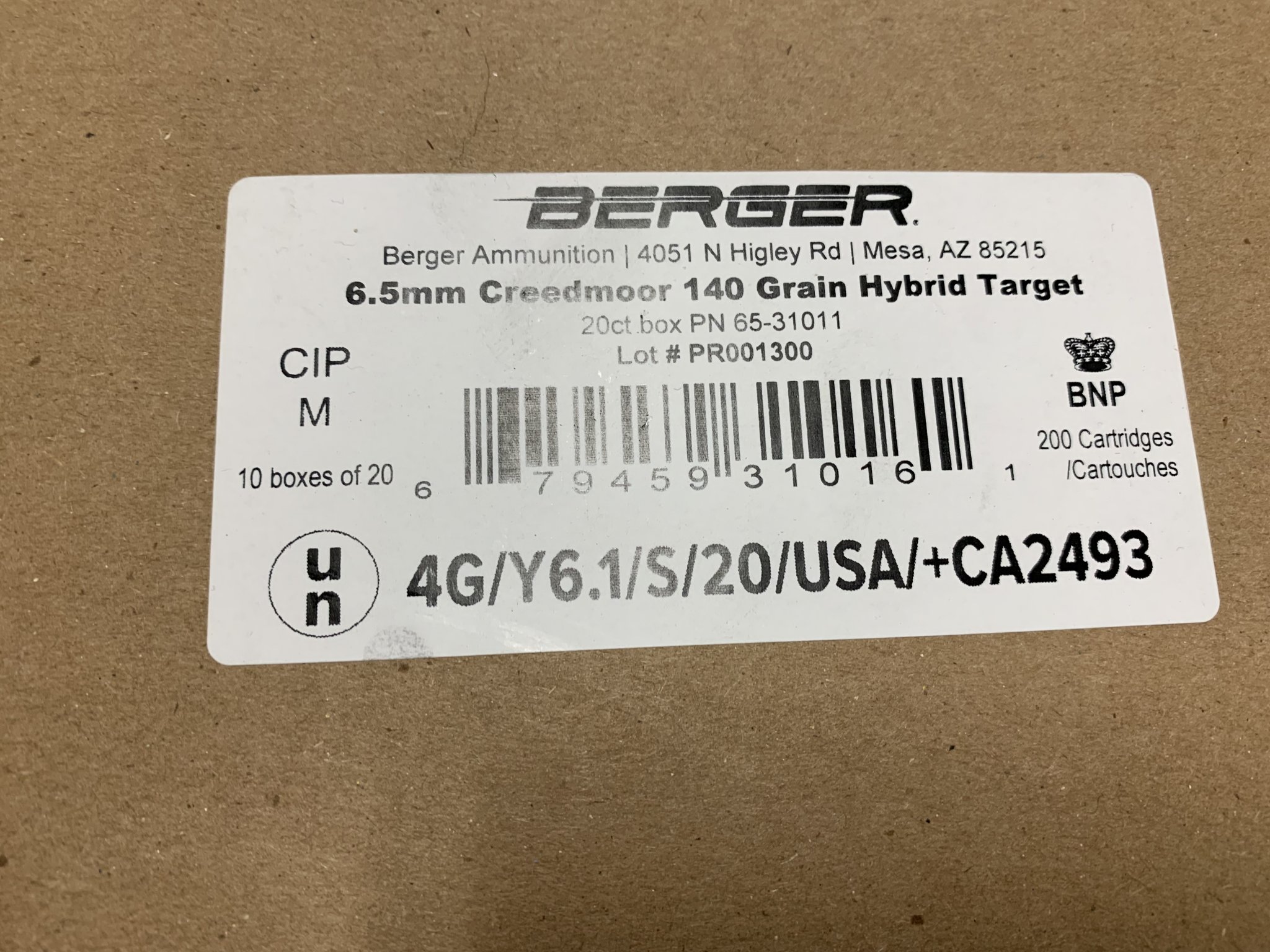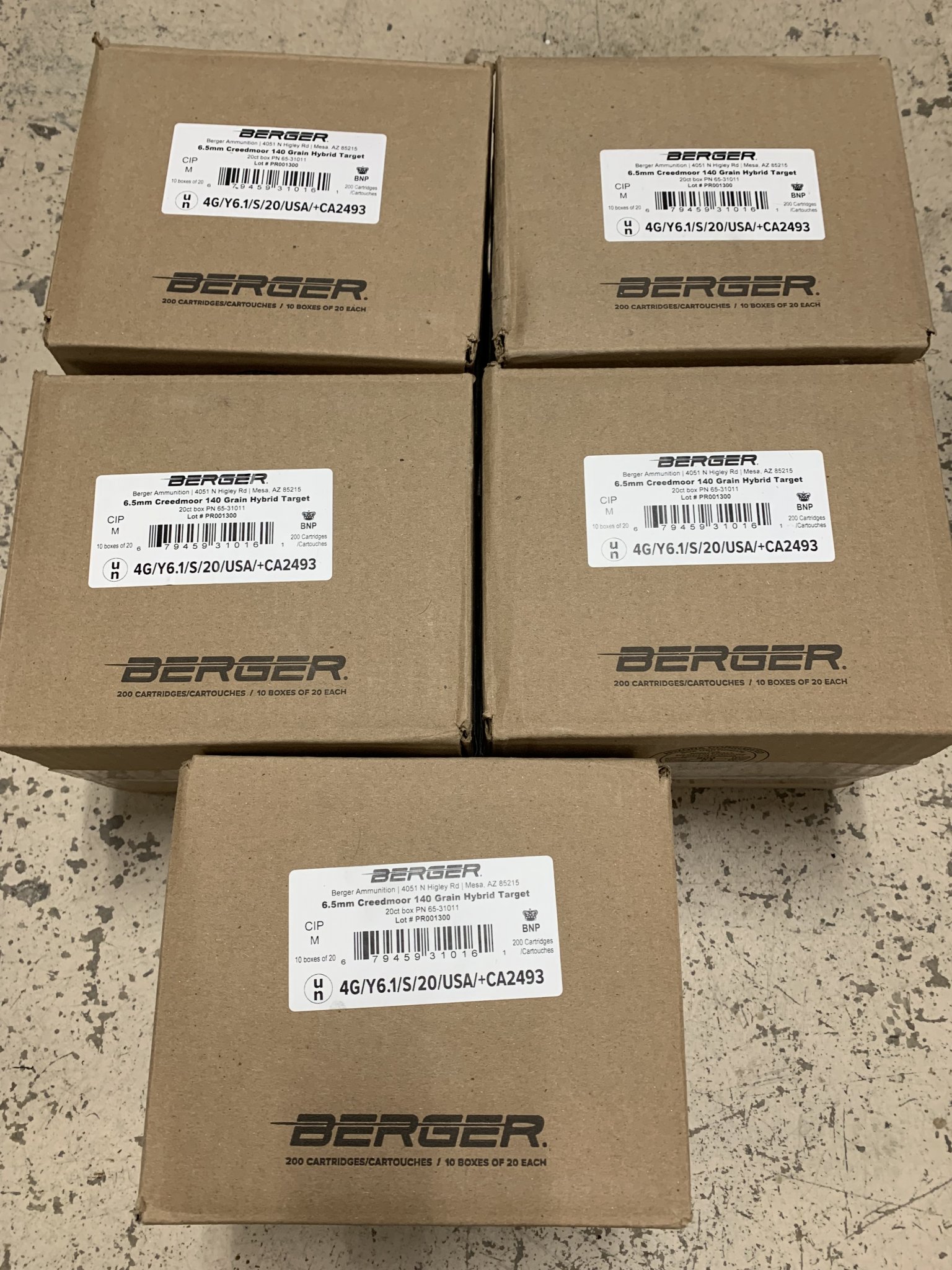 5 cases (200 rounds per case) of same lot Berger Hybrid Target 140gr 6.5 Creedmoor with LARGE RIFLE PRIMER Lapua brass. This is not Small Rifle Primer brass.