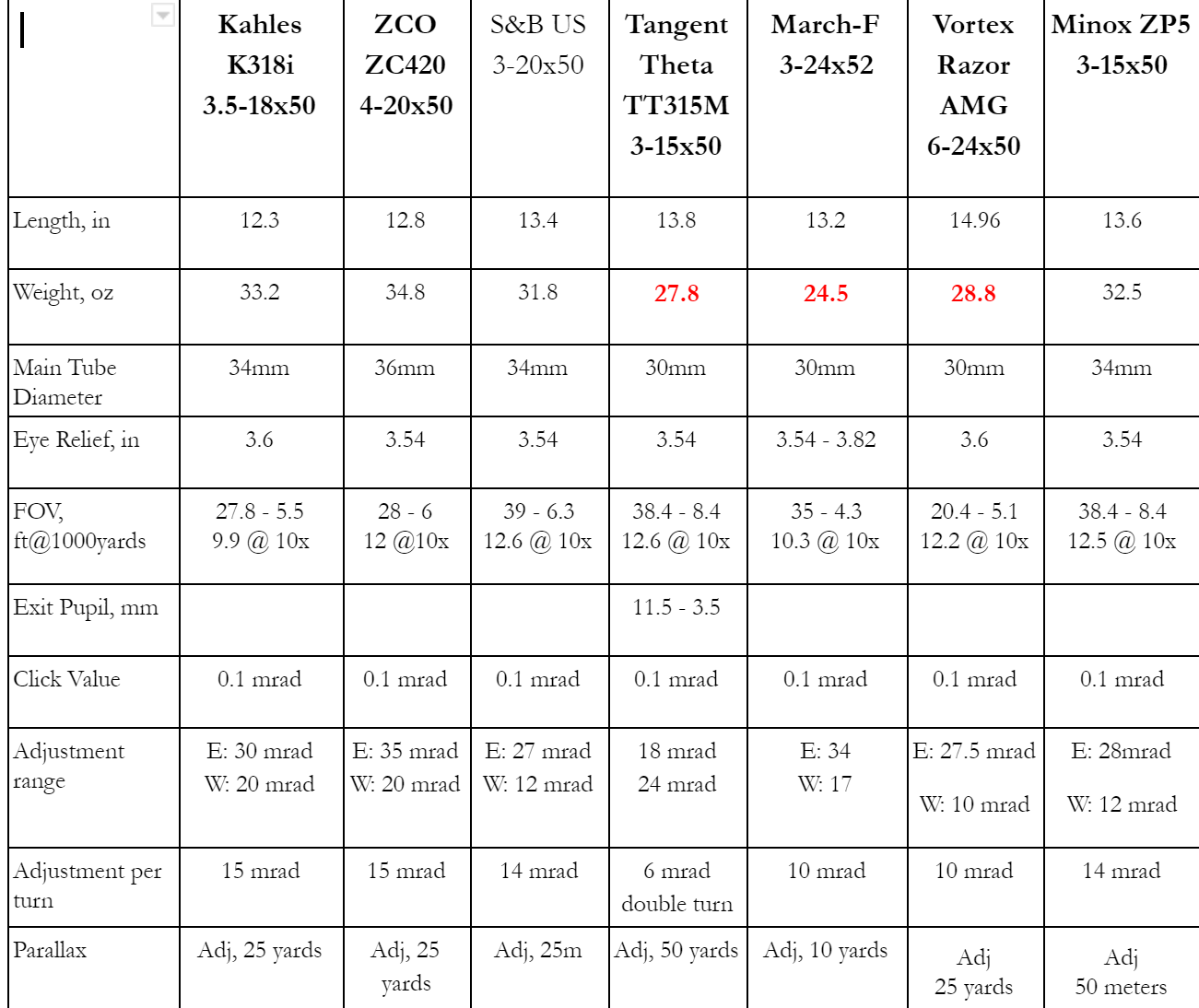 I have a K318i and it is ridiculously heavy, almost the same weight as my Minox ZP8 5-25x56. Honestly the vudu 5-25x50 at 29.5 oz is quickly becoming my favorite scope for all around use.I can’t speak to 1 and 3 above but the Kahles 3-18 is a pig.
