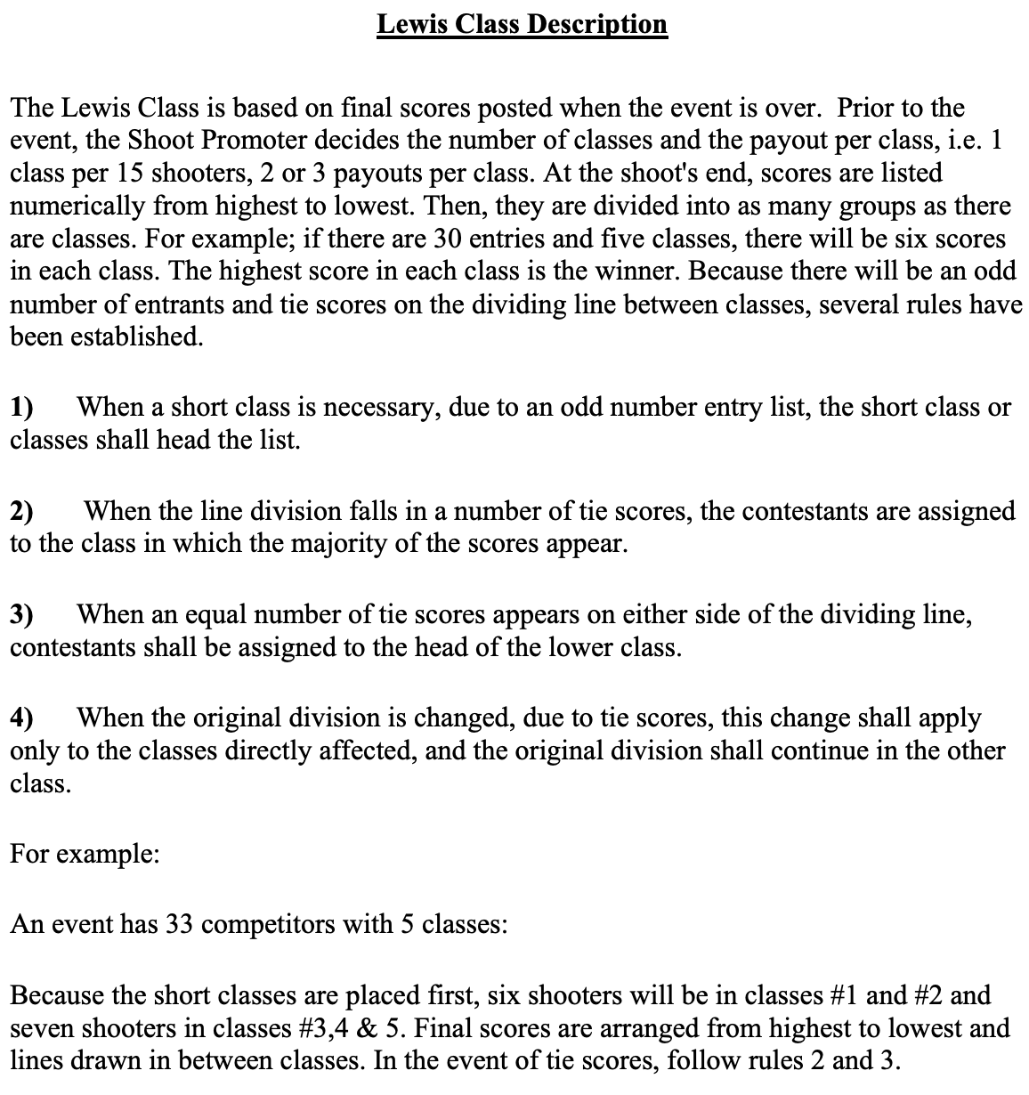 Enter Lewis class scoring. Everyone gets a chance to win a prize, it's impossible to sandbag, and only the top gun is guaranteed to win. I'm surprised more venues aren't aware of and use it. Many many years ago, one of the clubs to which I belong did a little Tuesday night pistol match. Five bucks to enter. Lewis class winners got their entry fee back.