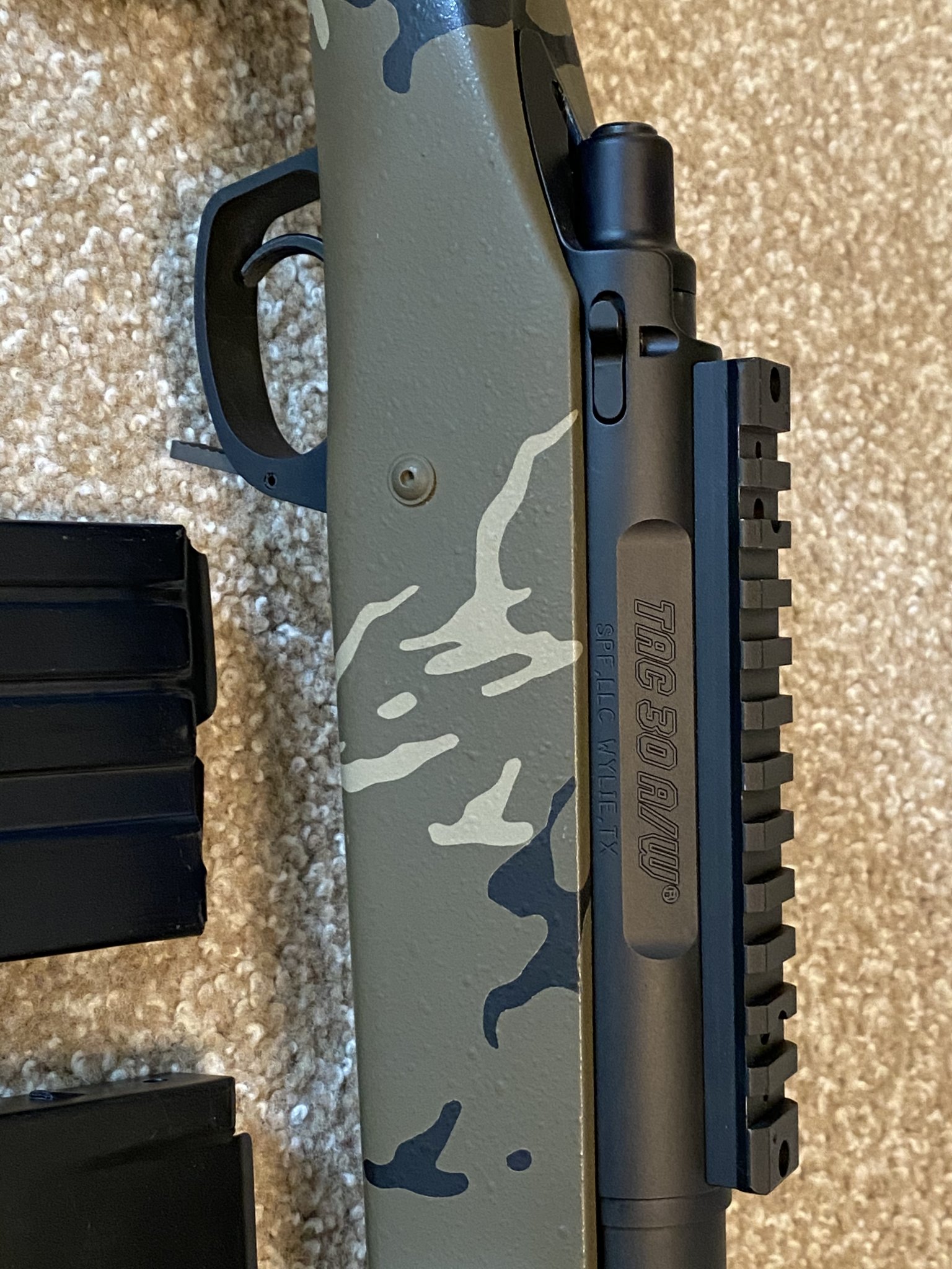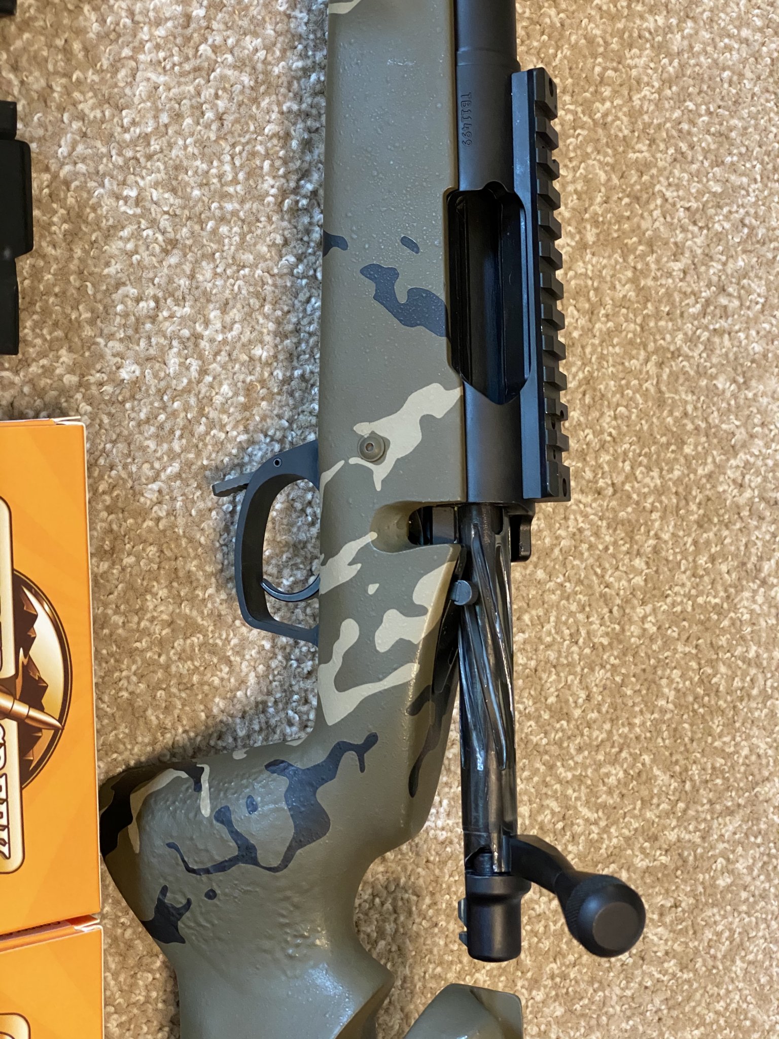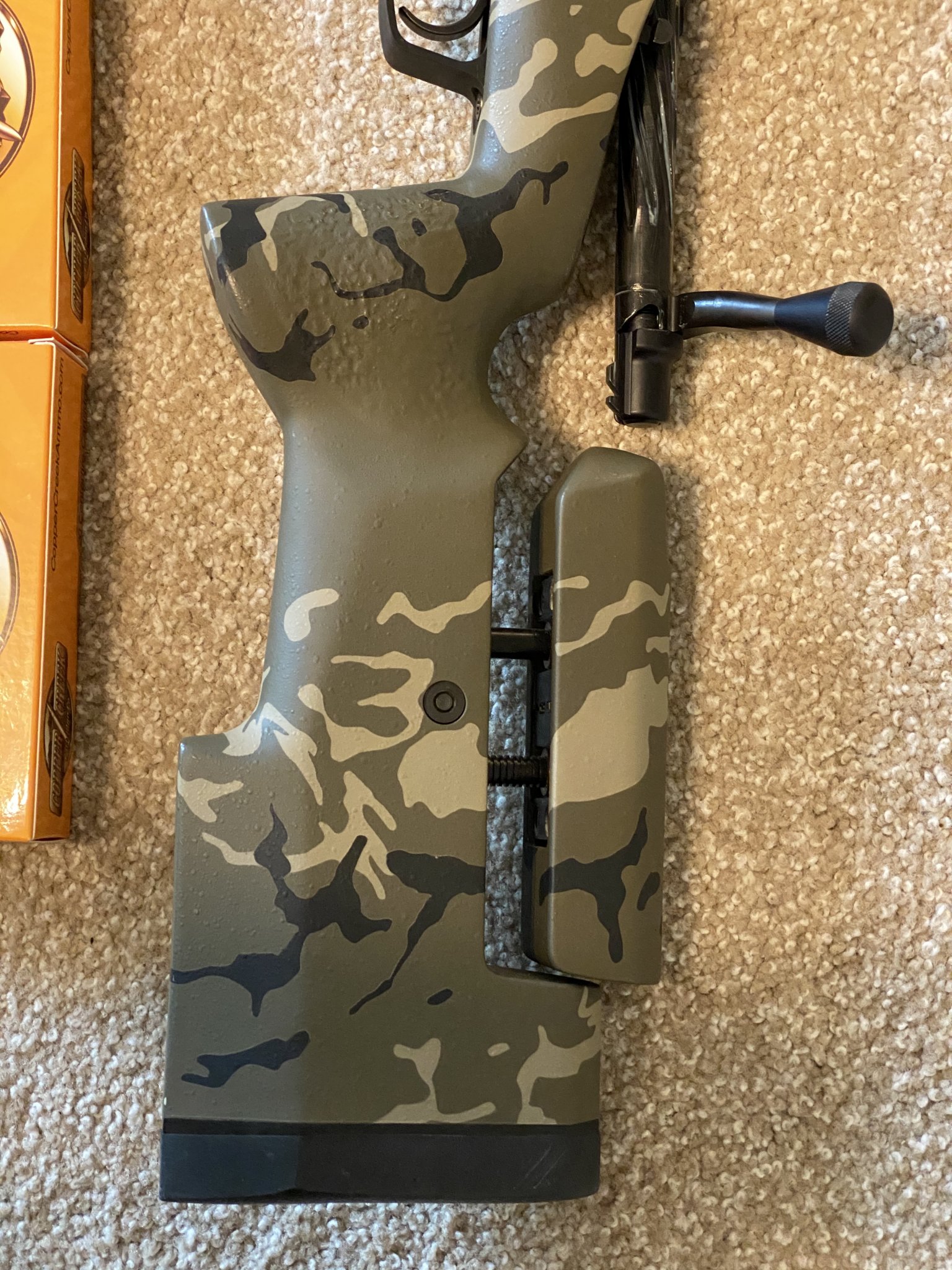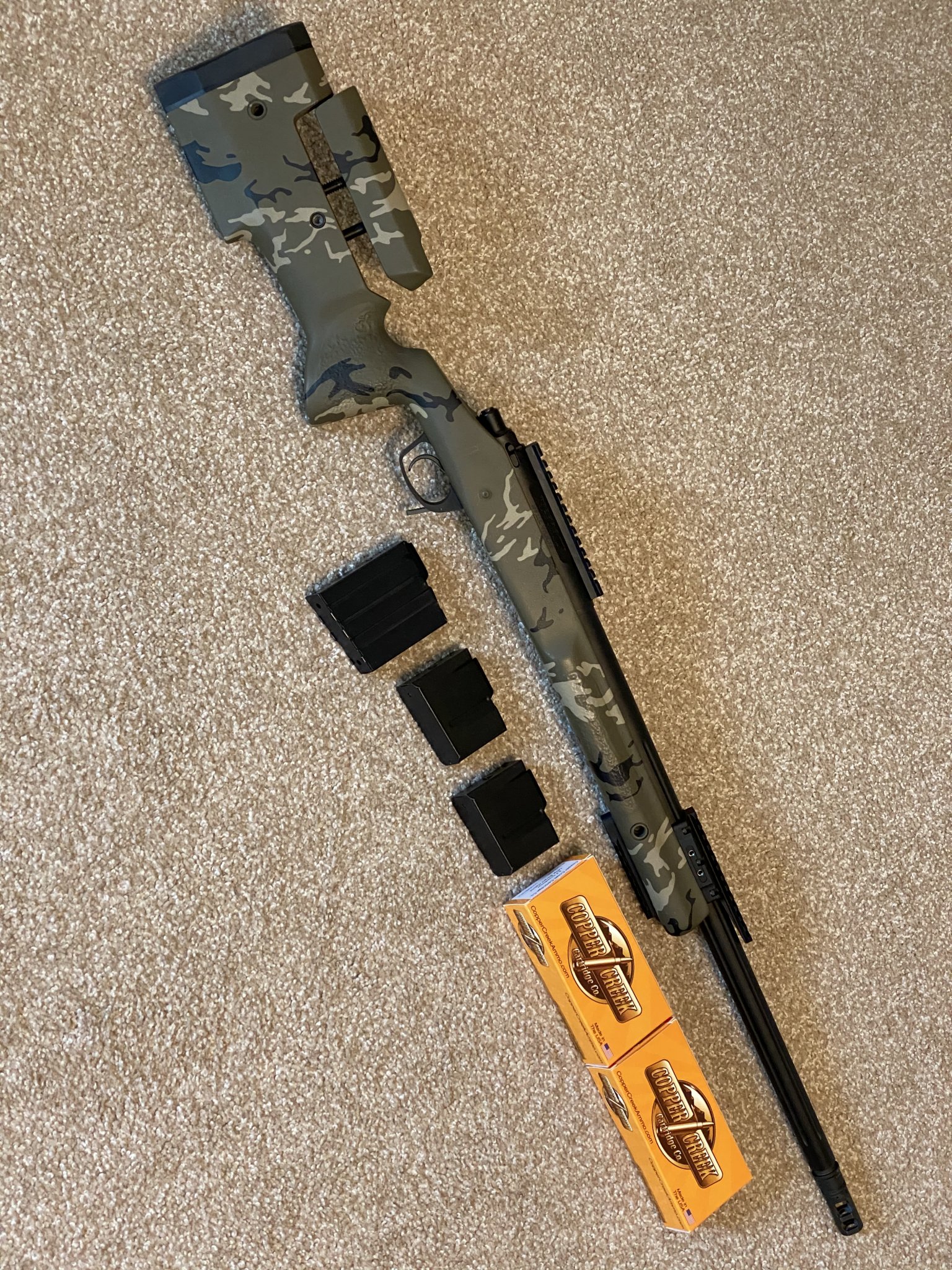 Robert's Precision Rifle: Left hand, Brux 1-8.5 twist 6.5mm Creedmoor m24 contour fluted 25", Stiller TAC30 AW action, 20 MOA base, Manners T4A stock with mini chassis with custom camo paint by Custom Gun Coatings, Badger embedded front rail, Badger picitinny bottom rail, Timney 510 trigger. One 10 Alpha and two 5 round magazines. 2 boxes of Copper Creek 140s. $2,500 (originally listed for $3,200).