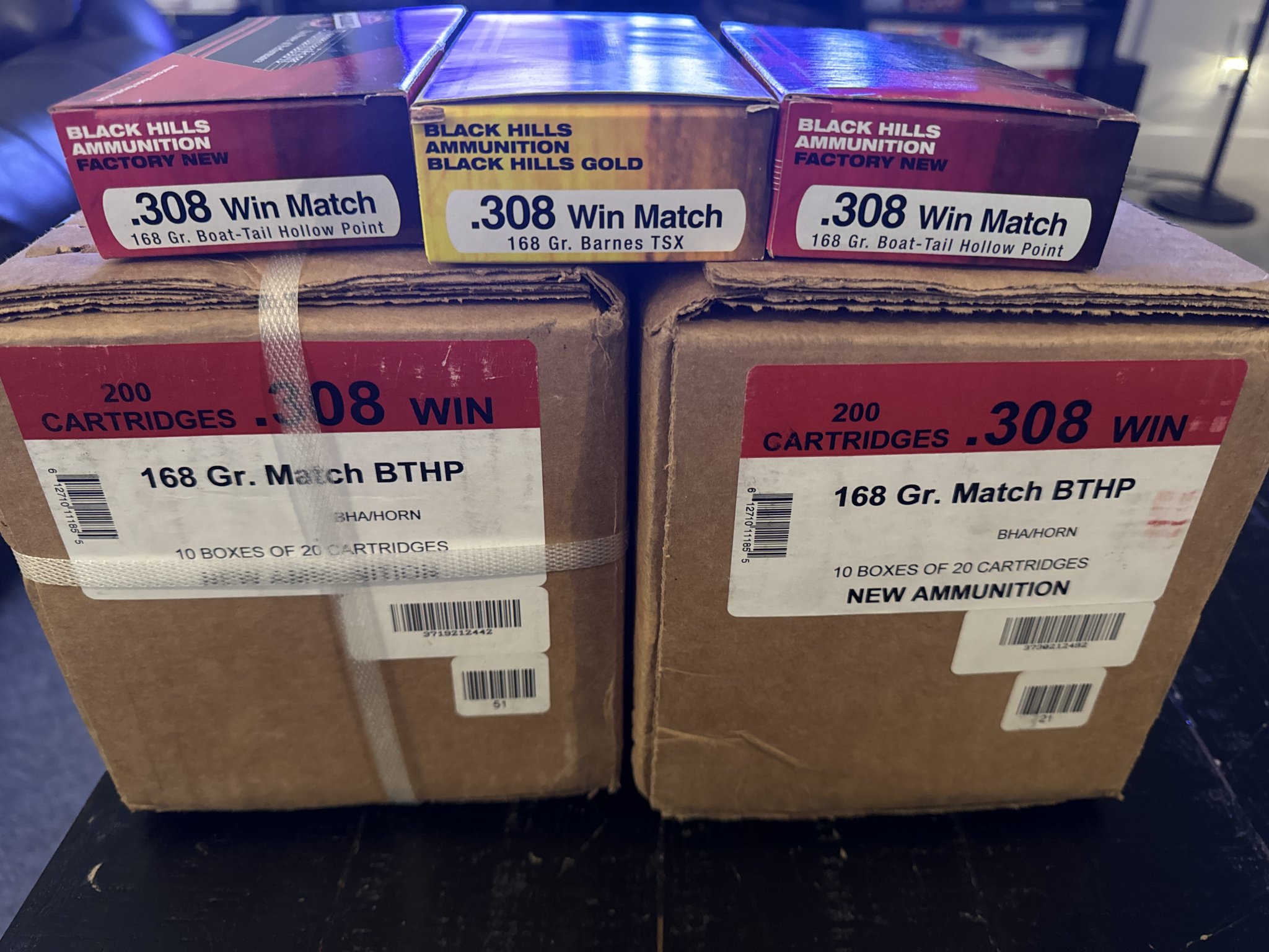 Two cases and two spare boxes of 168gr .308 from Black Hills. Still in the cases from BH.