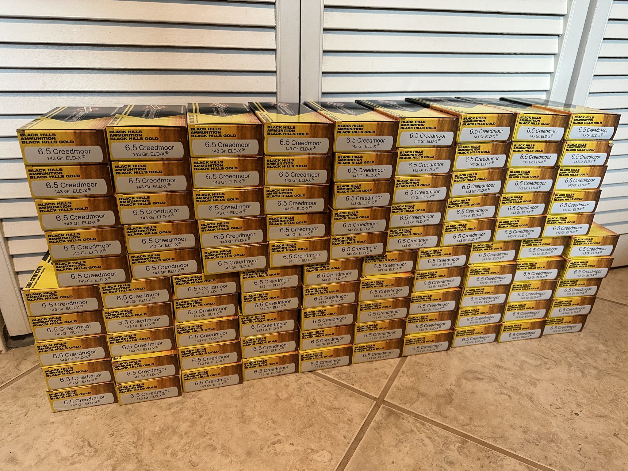 I have for sale here 1900 rounds of Black Hills 6.5 Creedmoor 143gr ELD-X. I am not looking for any trades, and the smallest lot I am looking to sell at is 200 rounds.