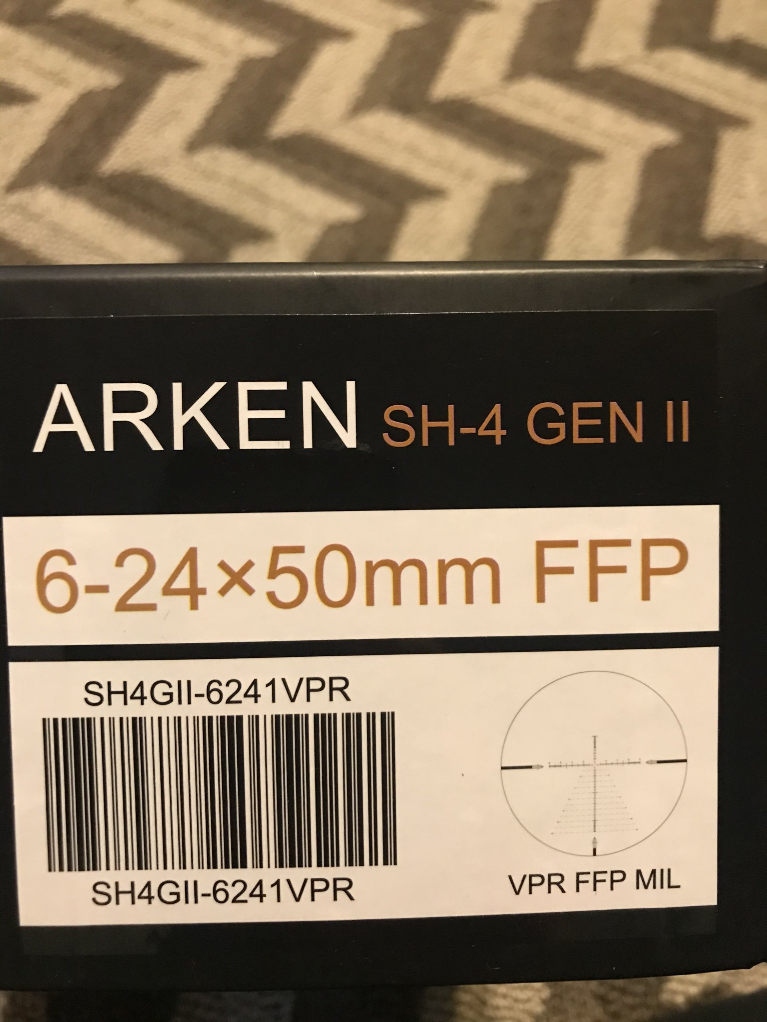 Brand new in box Arken Optics SH4 Gen 2. 6-24x50. FFP and Mil/Mil. Comes with the precision package (everything pictured) which includes a scope level, throw lever and rear bag. It also comes with Arken flip up caps.