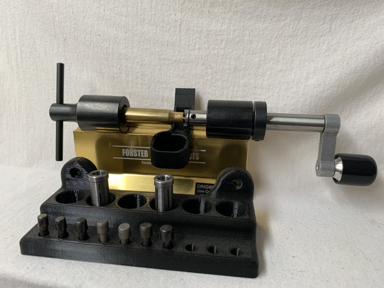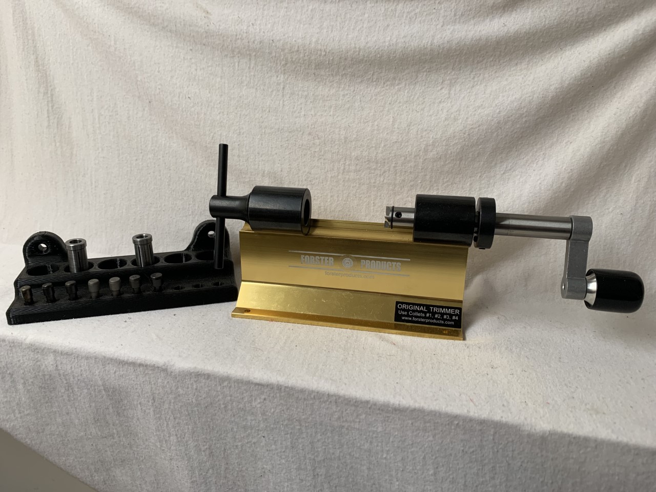 $27 TYD Forster Original Trimmer brass catcher: The catcher sits on the rails and can be moved left or right. When you are ready to empty just lift it off and dump it. This also has a rack that can be mounted on the wall or shelf for the case collets (6) and allen wrench and pilots.