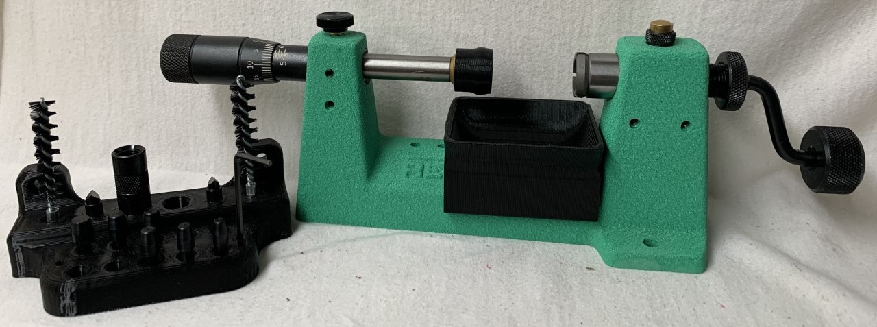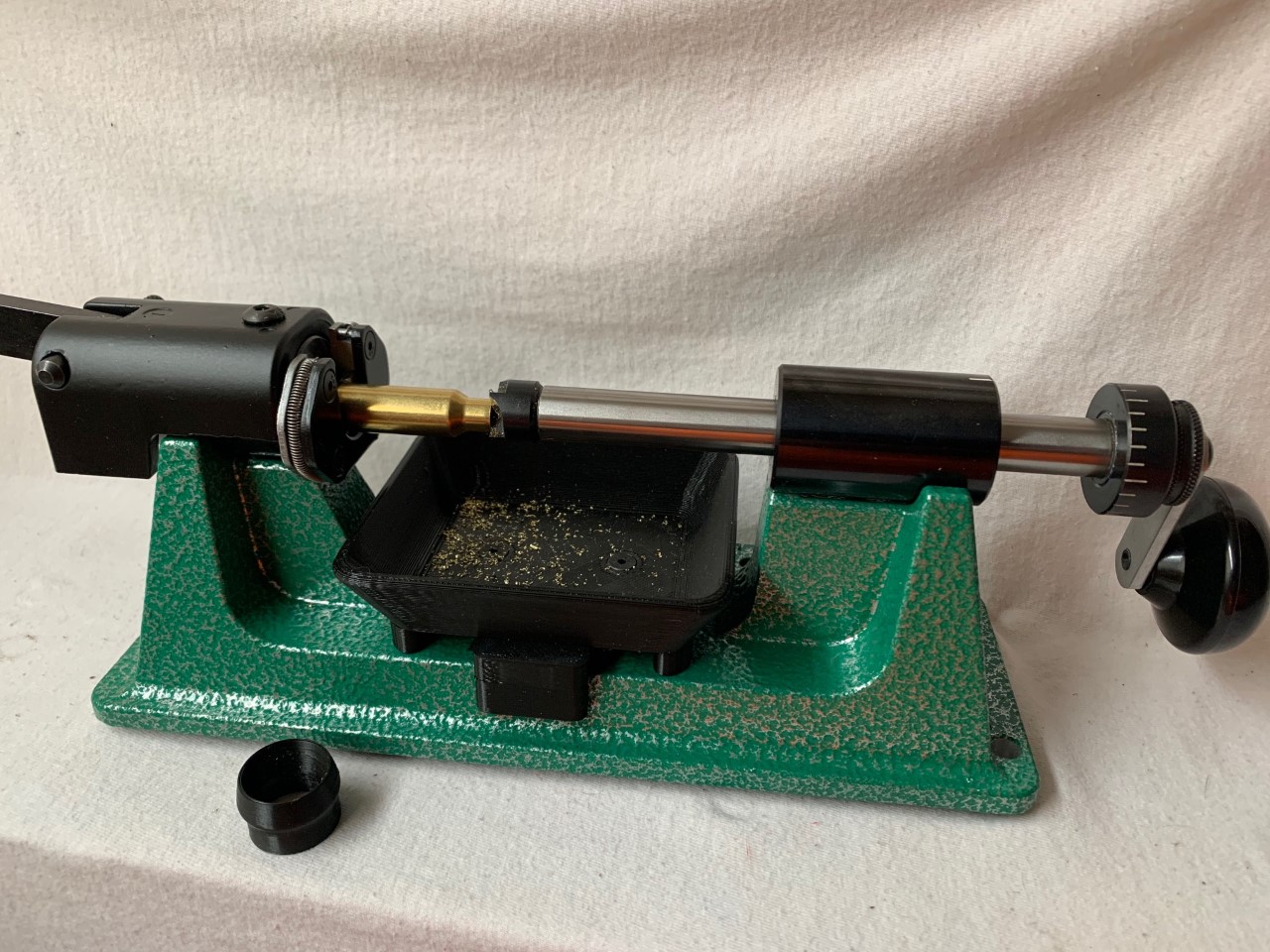$25 TYD Lyman Express Trimmer Brass Catcher: This has a basket that just slides underneath the trimmer head that catches the shavings. Remove it and dump them out. Also has a small collet rack that can sit on the trimmer or just sit on the bench. One of the images shows my first larger collet rack but thats too bulky, only going with the smaller one but the image shows how it sits on the trimmer.