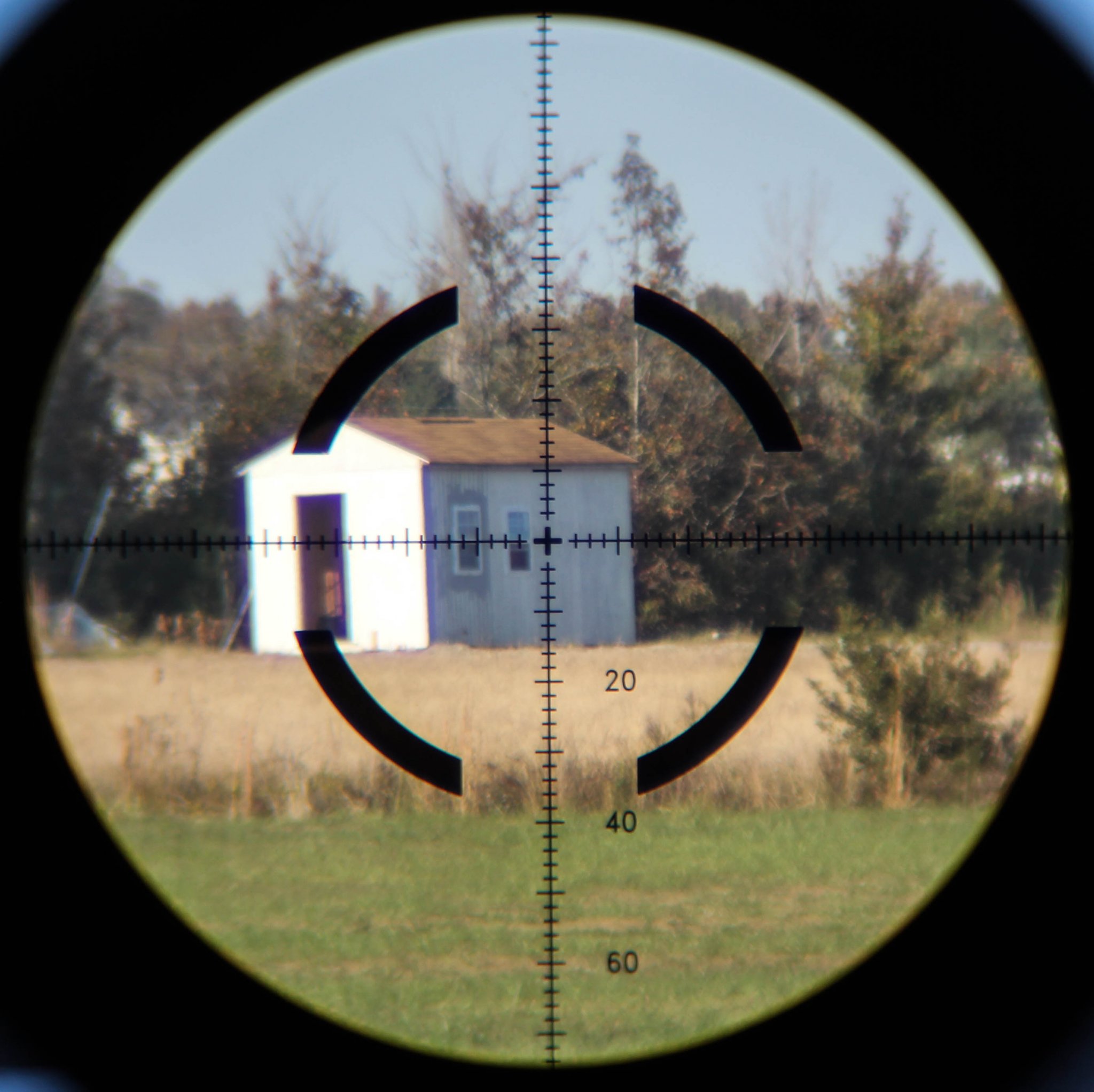 In your review you posted pics at 2x 4x 6x 8x ... Do you remember what the distance to the Bush ???... Also I can see the appeal of that Reticle, but I had it on the Burris 1.5-8 and absolutely hated it and that Scope, also why the Trijicon is a no go. have you any time behind the Ballistic Dot Reticle???