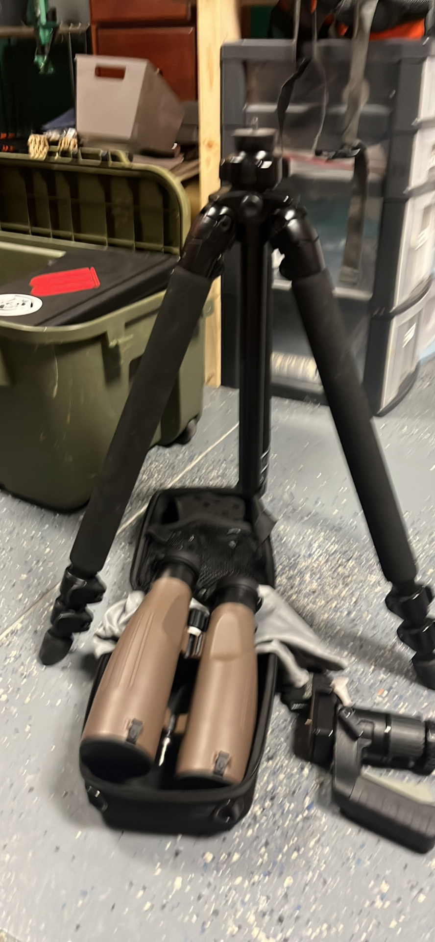 Bushnell forges 15x56 with Bushnell tactical tripod, swivel mount, bino harness asking for 550 plus shipping.