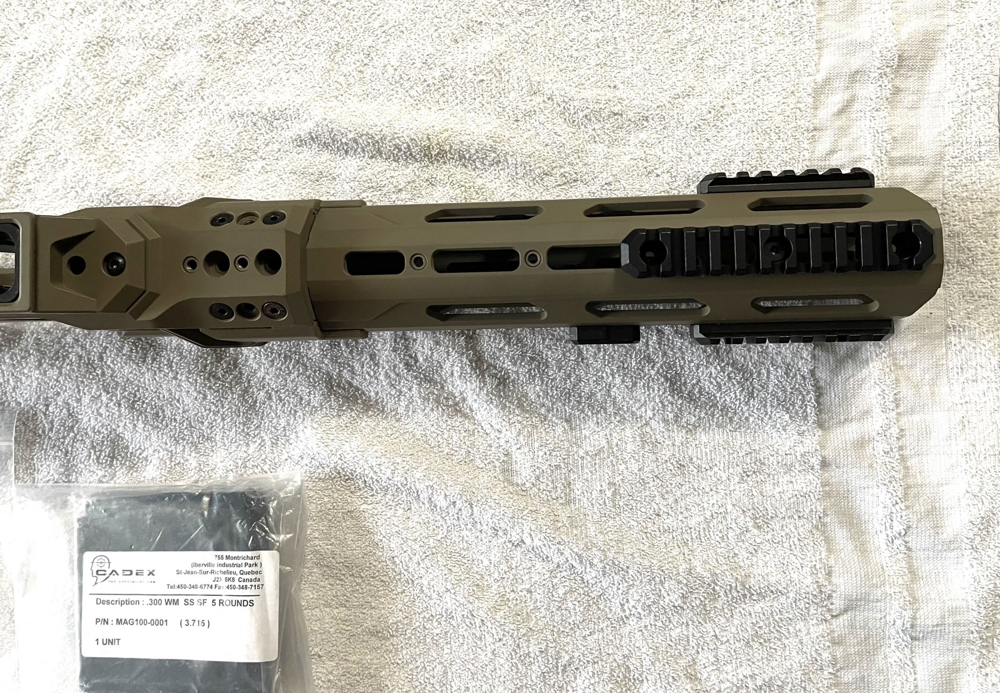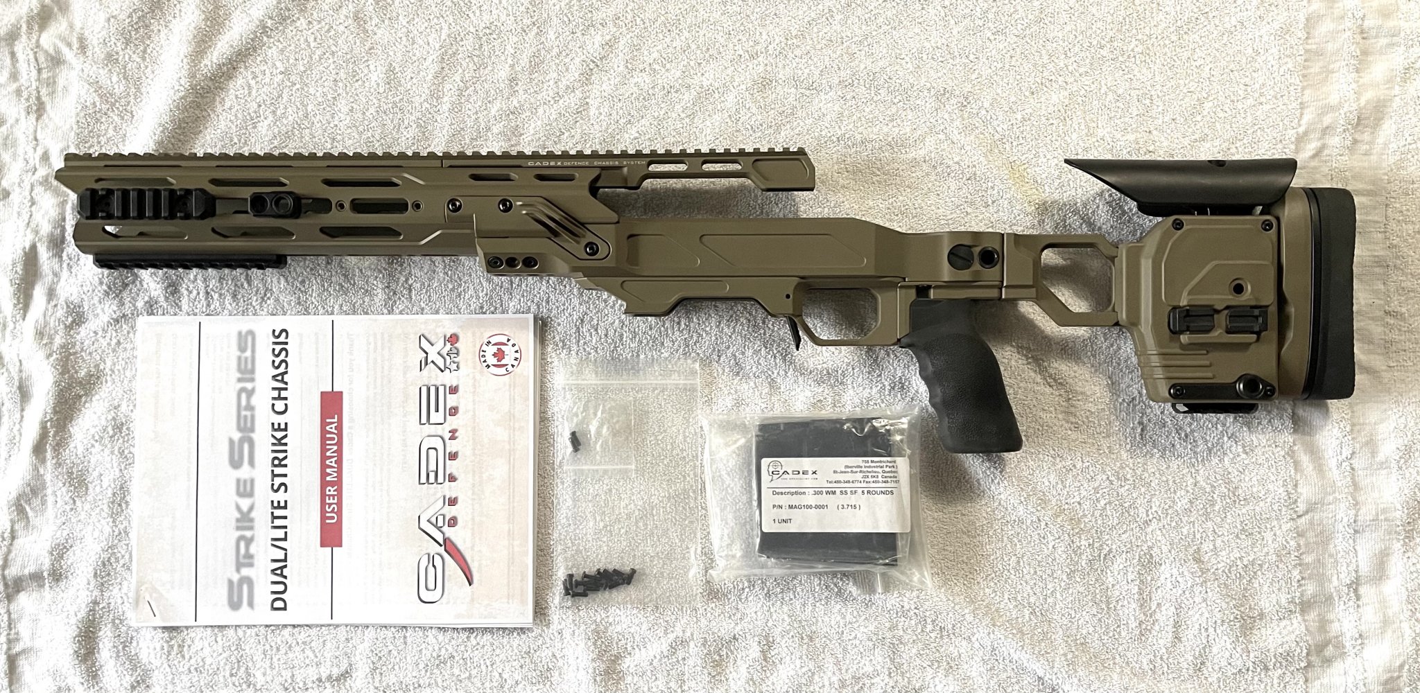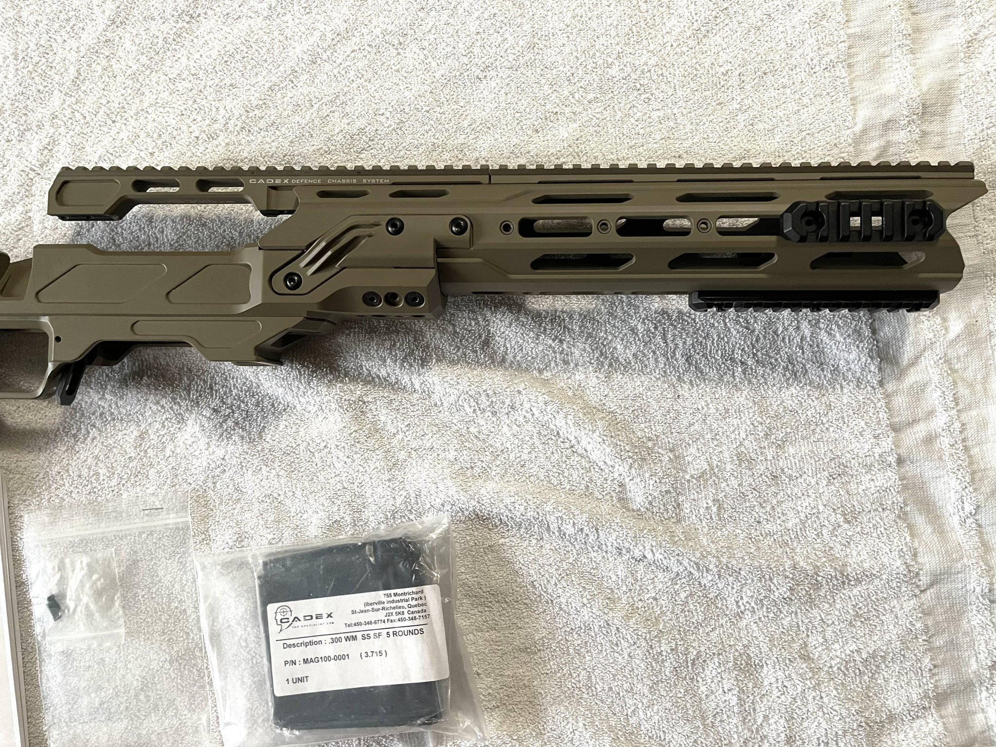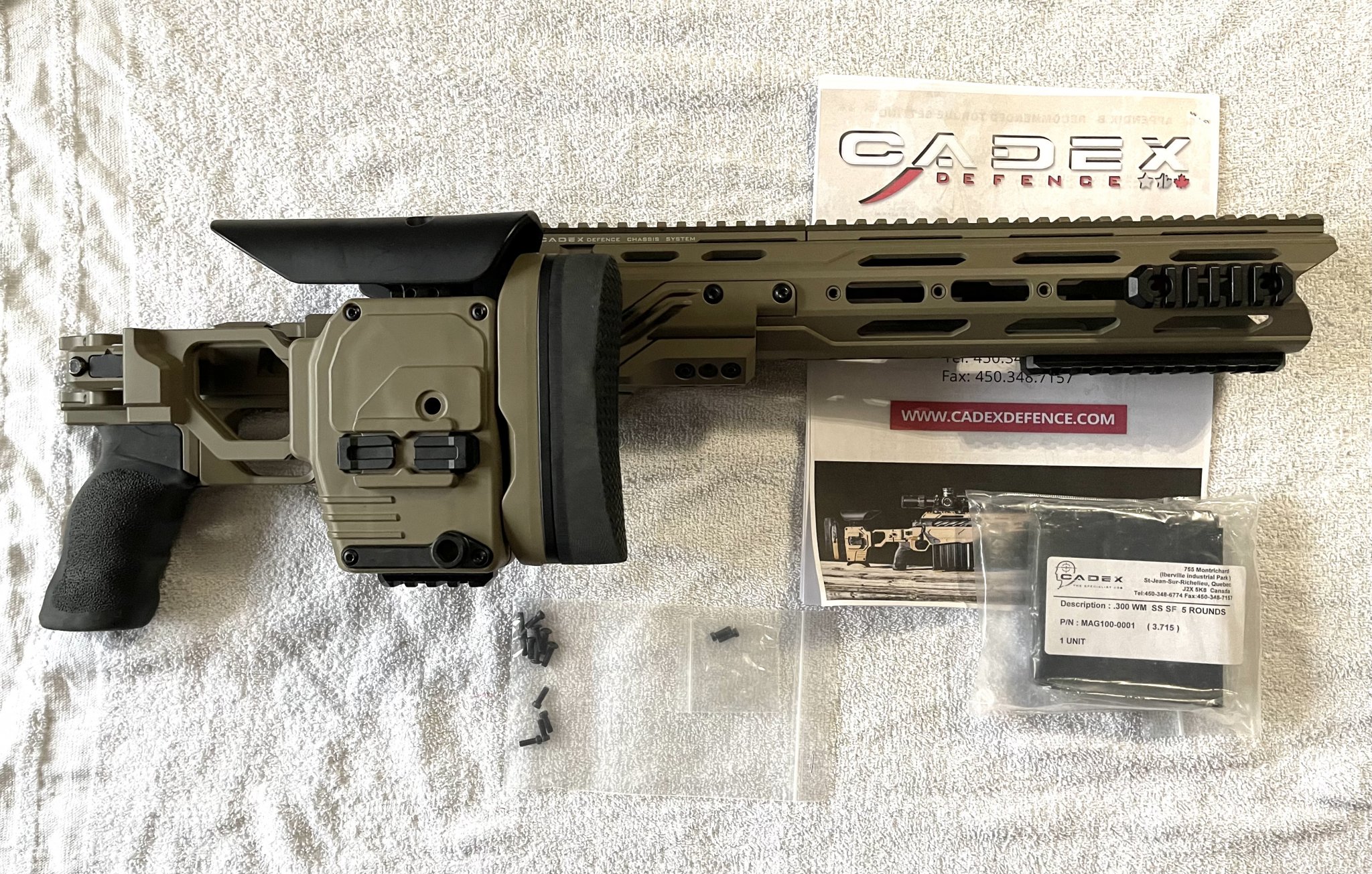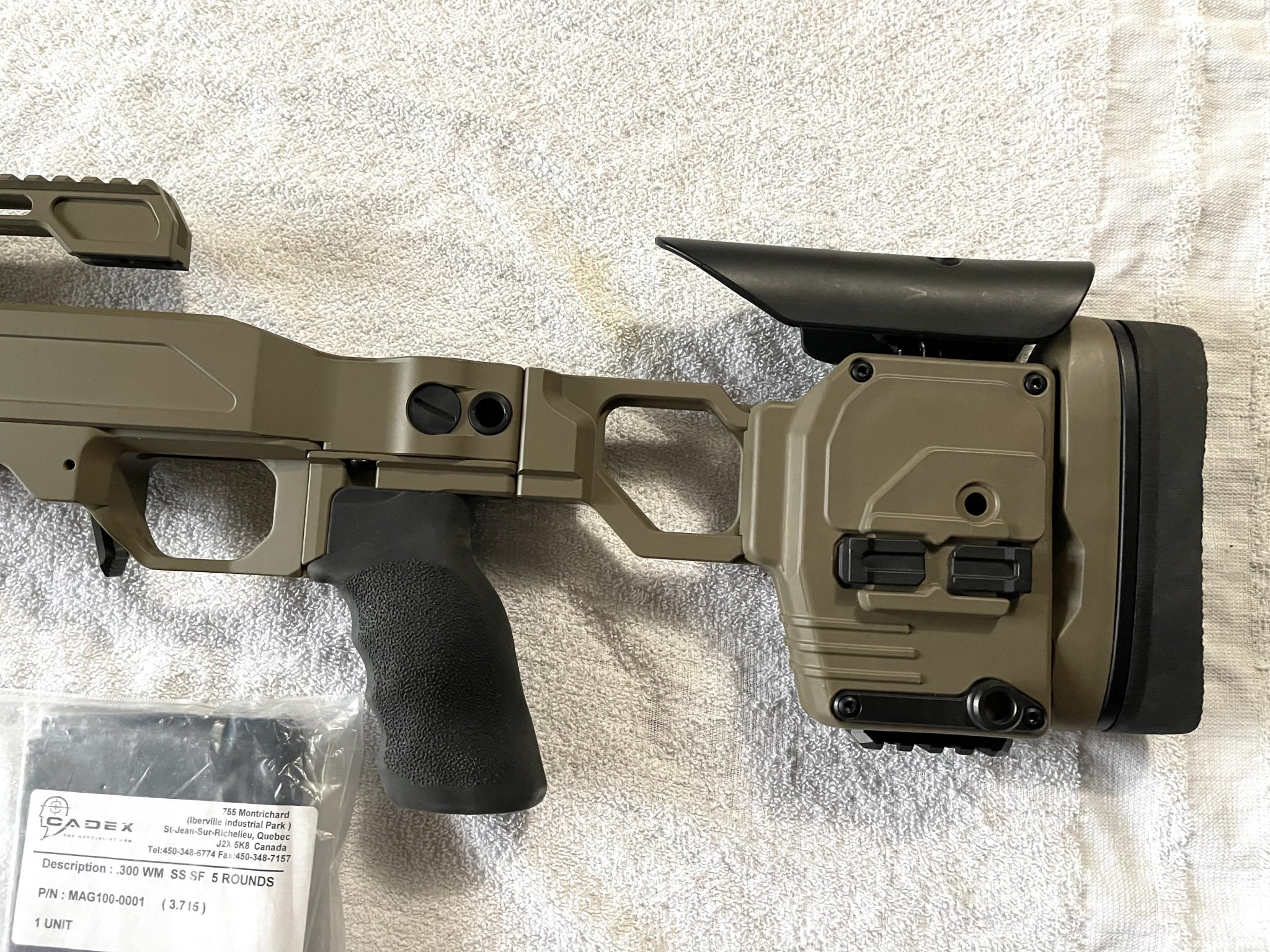 Specs: Ultimate sniper system currently in use worldwide by special operations units and long range shooters. Color: Unsure? Looks O.D. Green sometimes and looks dark tan others, see pics. I asked Cadex and they said Tan. Dimensions: 34.25”x3.1”x8.13”, Folded: 25.27”x4.68”x8.13”, Weight: 6.86 lbs (w/o mag), Folding Butt Stock: Reverse folding butt stock offers bolt handle protection and ultra compact transport, Locking Mechanism: Rattle Free locking mechanism, Easy manipulation with gloves, Folding hinge: Offset cam to remove any free play, Tool-free adjustable Butt Pad, Tool-Free adjustable cheek rest, Magazine Sleeve: Multiple magazine sleeves are available to fit most magazine types on the market, Aluminum Detachable Base: Removable for trigger maintenance or tuning without need to remove your action and lose your zero, Full length dual top rail: 20 MOA full length dual top rail, Fore-end tube: Heavy Duty Fore-end tube providing rail placement at 3,6 and 9 O’Clock, Grip: Finger Grooved rubberized Ergo grip, Trigger guard: Oversized guard and magazine release for easy manipulation with gloves, Roller bedding technology: Barreled action sits on 4 rollers to provide a stable platform that reduce barrel vibrations. According to the Cadex Configuration chart this Rem LA Chassis would fit: 30-06 Sprg, 7mm Rem Mag, 300 WM, 300 Rum, 338LM. That may or may not require different Magazine Sleeve and Magazine. Currently this Chassis comes with a 300 WM SS SF (3.715) 5-round New Cadex Magazine. Shipping Fix rate $30, UPS Ground Insured to Lower 48. Be sure you are legal to own prior to buying.