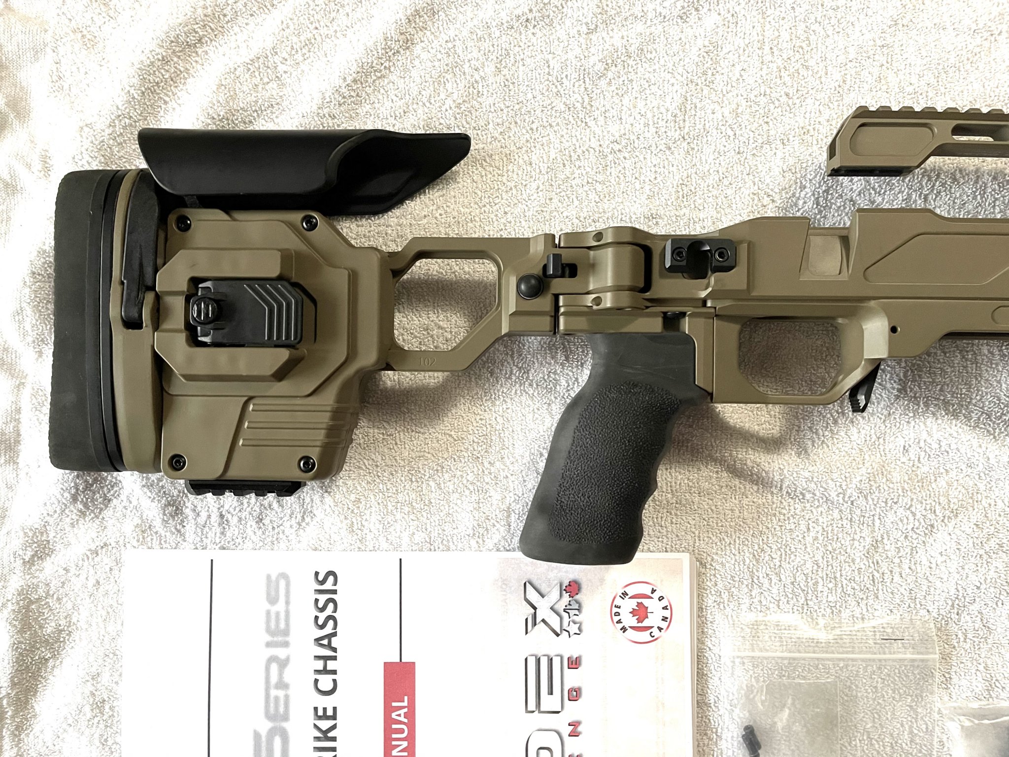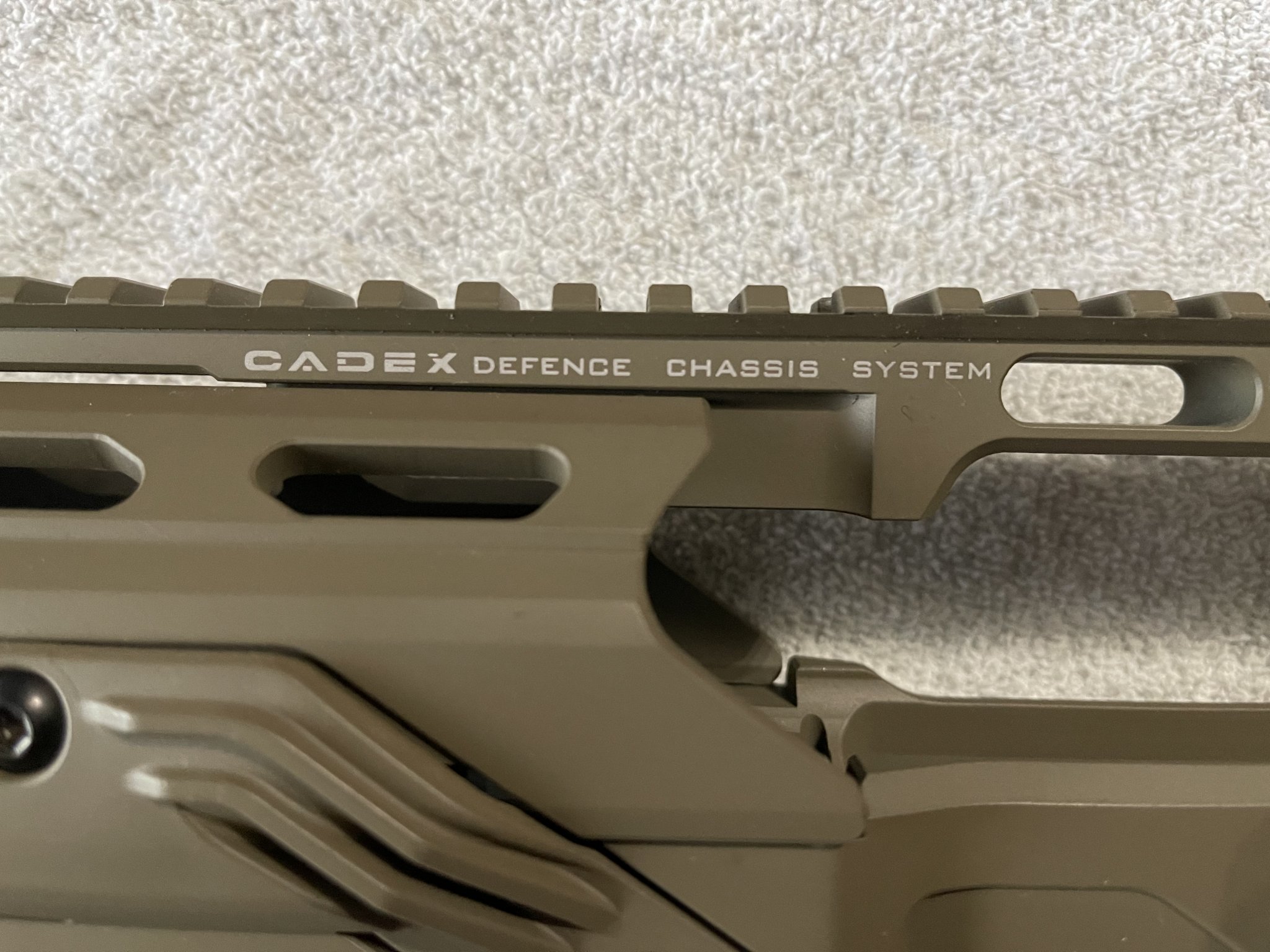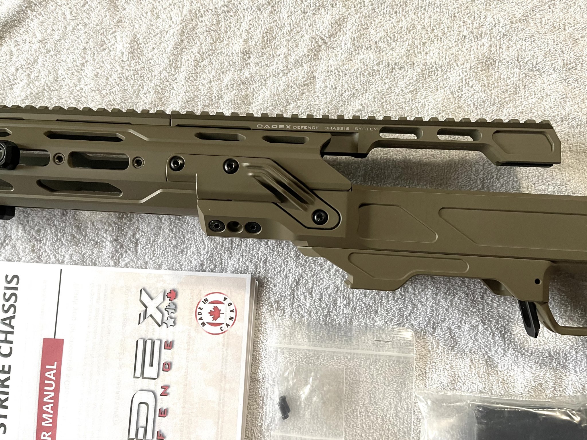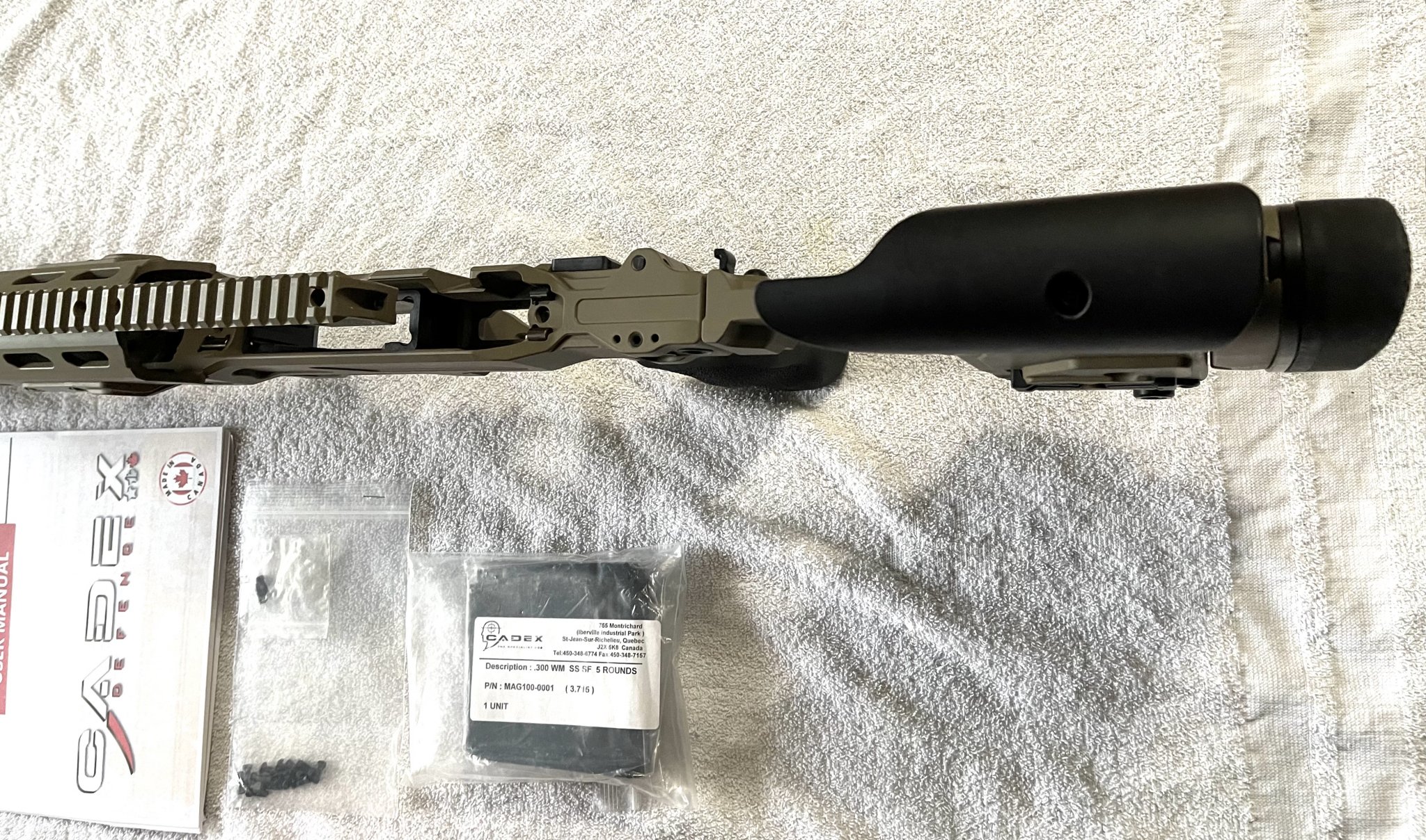 Specs: Ultimate sniper system currently in use worldwide by special operations units and long range shooters. Color: Unsure? Looks O.D. Green sometimes and looks dark tan others, see pics. I asked Cadex and they said Tan. Dimensions: 34.25”x3.1”x8.13”, Folded: 25.27”x4.68”x8.13”, Weight: 6.86 lbs (w/o mag), Folding Butt Stock: Reverse folding butt stock offers bolt handle protection and ultra compact transport, Locking Mechanism: Rattle Free locking mechanism, Easy manipulation with gloves, Folding hinge: Offset cam to remove any free play, Tool-free adjustable Butt Pad, Tool-Free adjustable cheek rest, Magazine Sleeve: Multiple magazine sleeves are available to fit most magazine types on the market, Aluminum Detachable Base: Removable for trigger maintenance or tuning without need to remove your action and lose your zero, Full length dual top rail: 20 MOA full length dual top rail, Fore-end tube: Heavy Duty Fore-end tube providing rail placement at 3,6 and 9 O’Clock, Grip: Finger Grooved rubberized Ergo grip, Trigger guard: Oversized guard and magazine release for easy manipulation with gloves, Roller bedding technology: Barreled action sits on 4 rollers to provide a stable platform that reduce barrel vibrations. According to the Cadex Configuration chart this Rem LA Chassis would fit: 30-06 Sprg, 7mm Rem Mag, 300 WM, 300 Rum, 338LM. That may or may not require different Magazine Sleeve and Magazine. Currently this Chassis comes with a 300 WM SS SF (3.715) 5-round New Cadex Magazine. Shipping Fix rate $30, UPS Ground Insured to Lower 48. Be sure you are legal to own prior to buying.