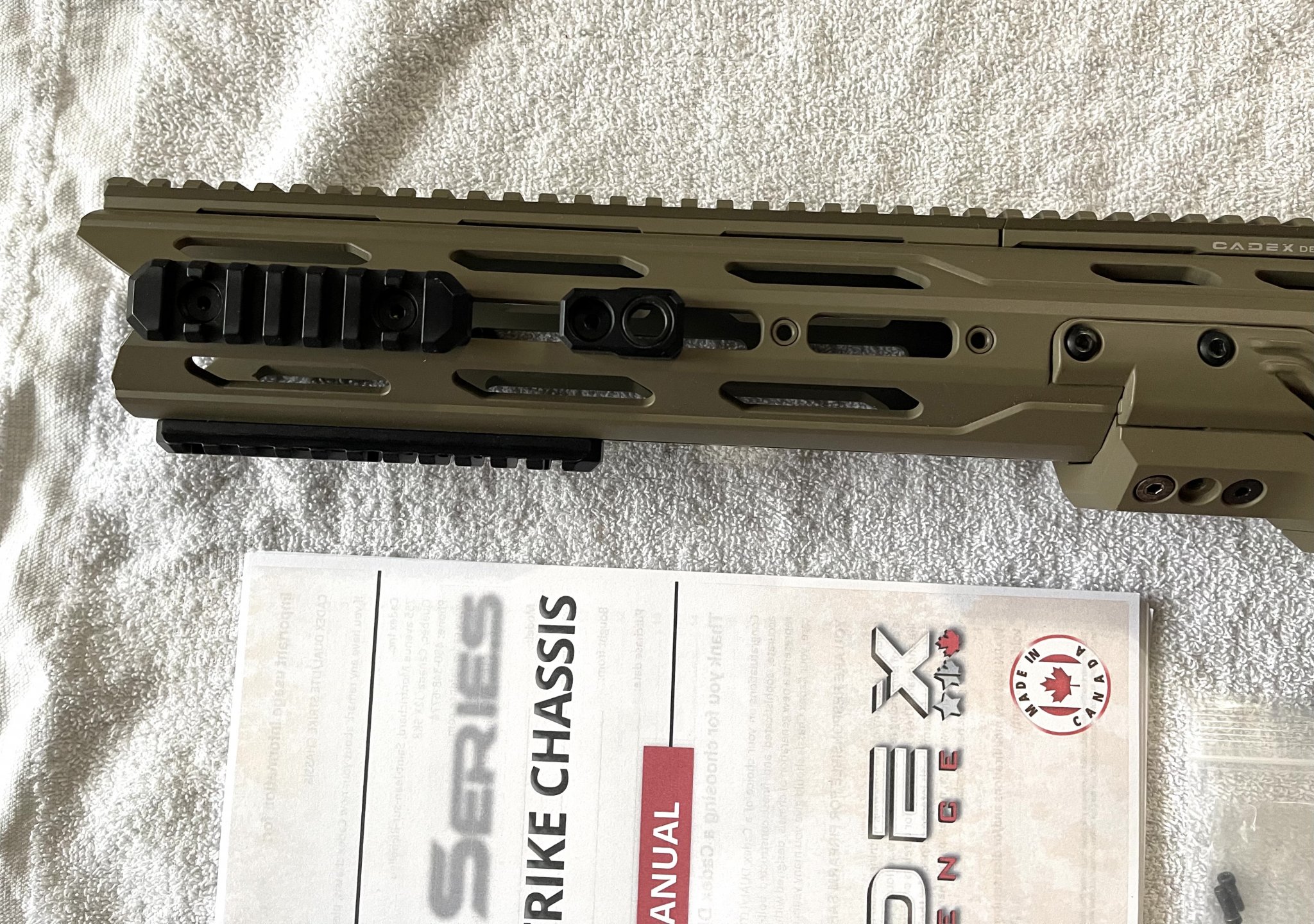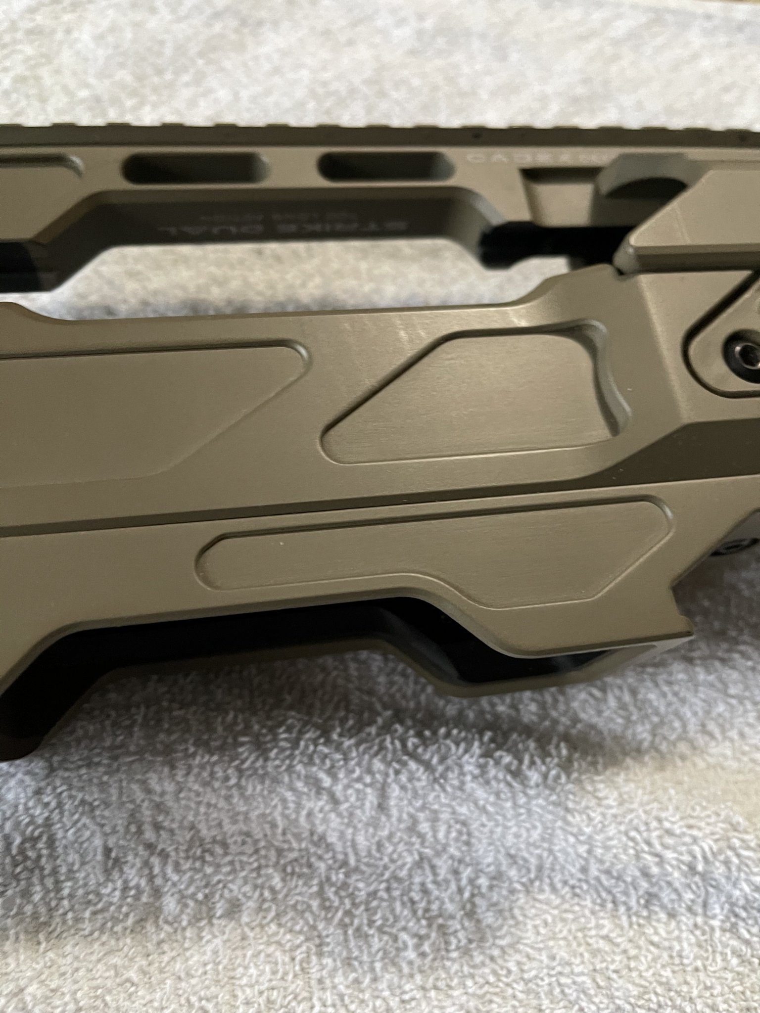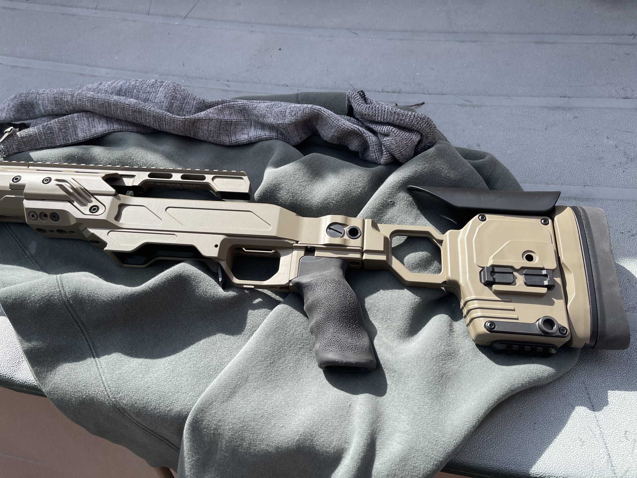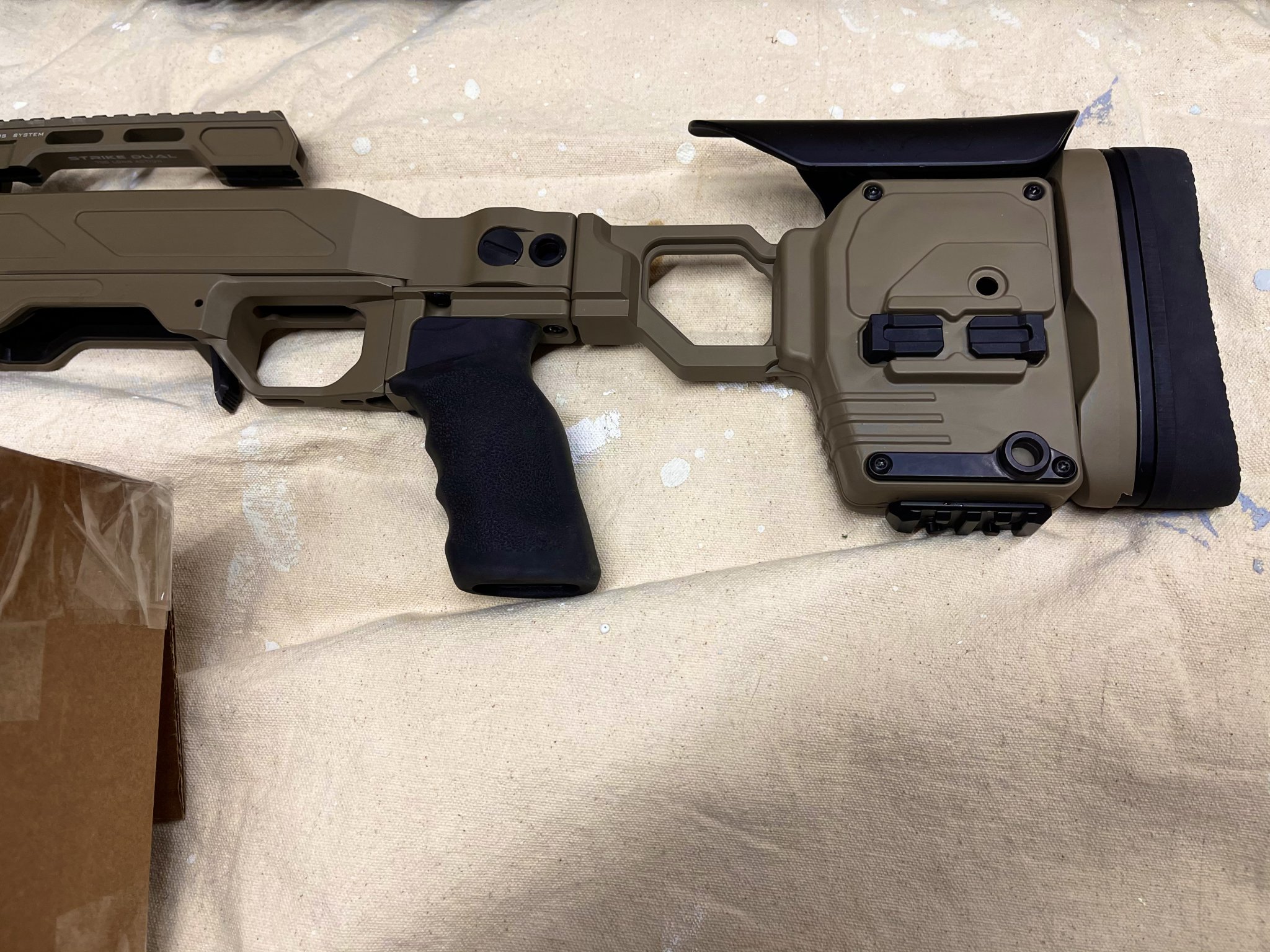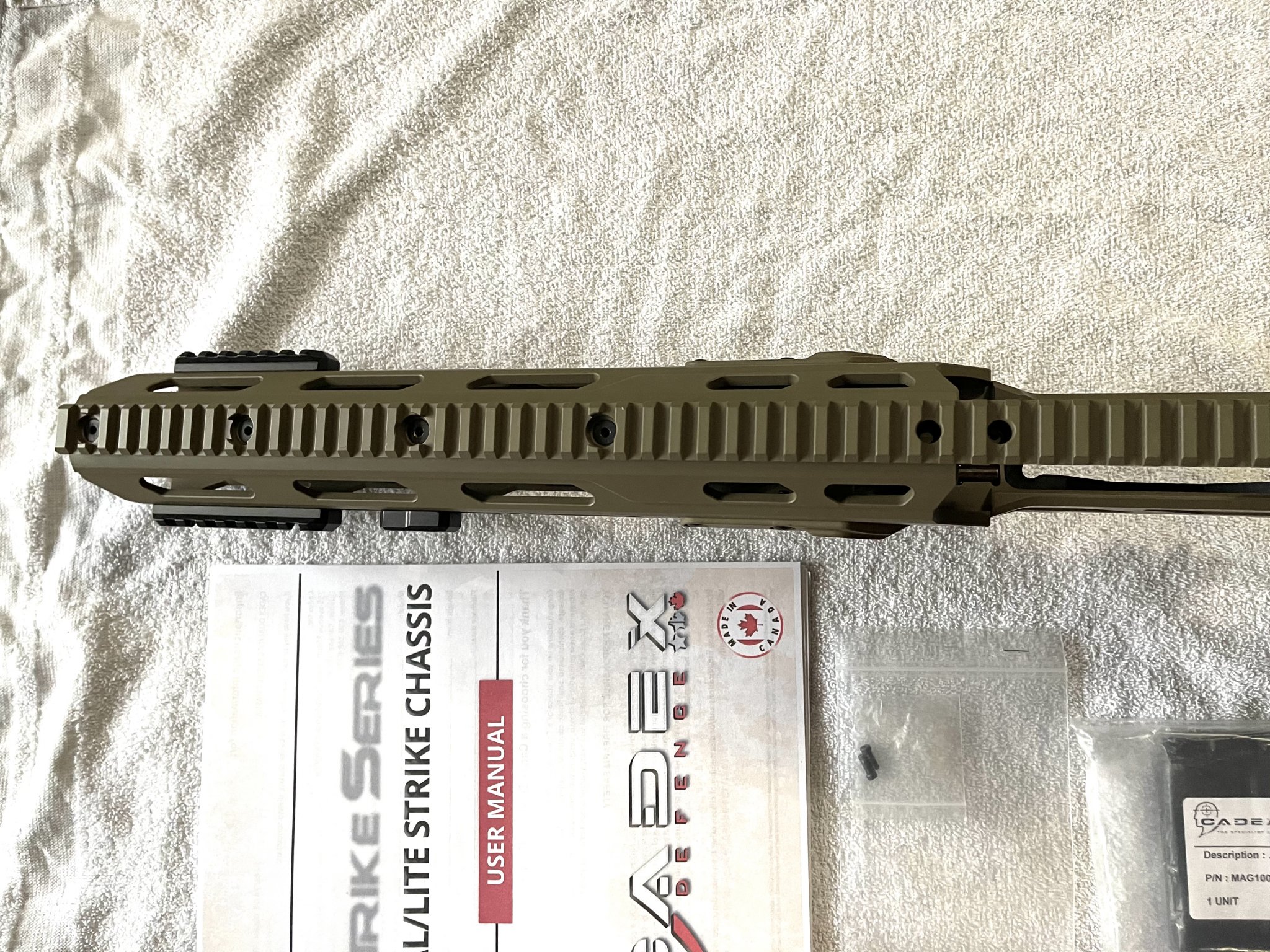 Specs: Ultimate sniper system currently in use worldwide by special operations units and long range shooters. Color: Unsure? Looks O.D. Green sometimes and looks dark tan others, see pics. I asked Cadex and they said Tan. Dimensions: 34.25”x3.1”x8.13”, Folded: 25.27”x4.68”x8.13”, Weight: 6.86 lbs (w/o mag), Folding Butt Stock: Reverse folding butt stock offers bolt handle protection and ultra compact transport, Locking Mechanism: Rattle Free locking mechanism, Easy manipulation with gloves, Folding hinge: Offset cam to remove any free play, Tool-free adjustable Butt Pad, Tool-Free adjustable cheek rest, Magazine Sleeve: Multiple magazine sleeves are available to fit most magazine types on the market, Aluminum Detachable Base: Removable for trigger maintenance or tuning without need to remove your action and lose your zero, Full length dual top rail: 20 MOA full length dual top rail, Fore-end tube: Heavy Duty Fore-end tube providing rail placement at 3,6 and 9 O’Clock, Grip: Finger Grooved rubberized Ergo grip, Trigger guard: Oversized guard and magazine release for easy manipulation with gloves, Roller bedding technology: Barreled action sits on 4 rollers to provide a stable platform that reduce barrel vibrations. According to the Cadex Configuration chart this Rem LA Chassis would fit: 30-06 Sprg, 7mm Rem Mag, 300 WM, 300 Rum, 338LM. That may or may not require different Magazine Sleeve and Magazine. Currently this Chassis comes with a 300 WM SS SF (3.715) 5-round New Cadex Magazine. Shipping Fix rate $30, UPS Ground Insured to Lower 48. Be sure you are legal to own prior to buying.