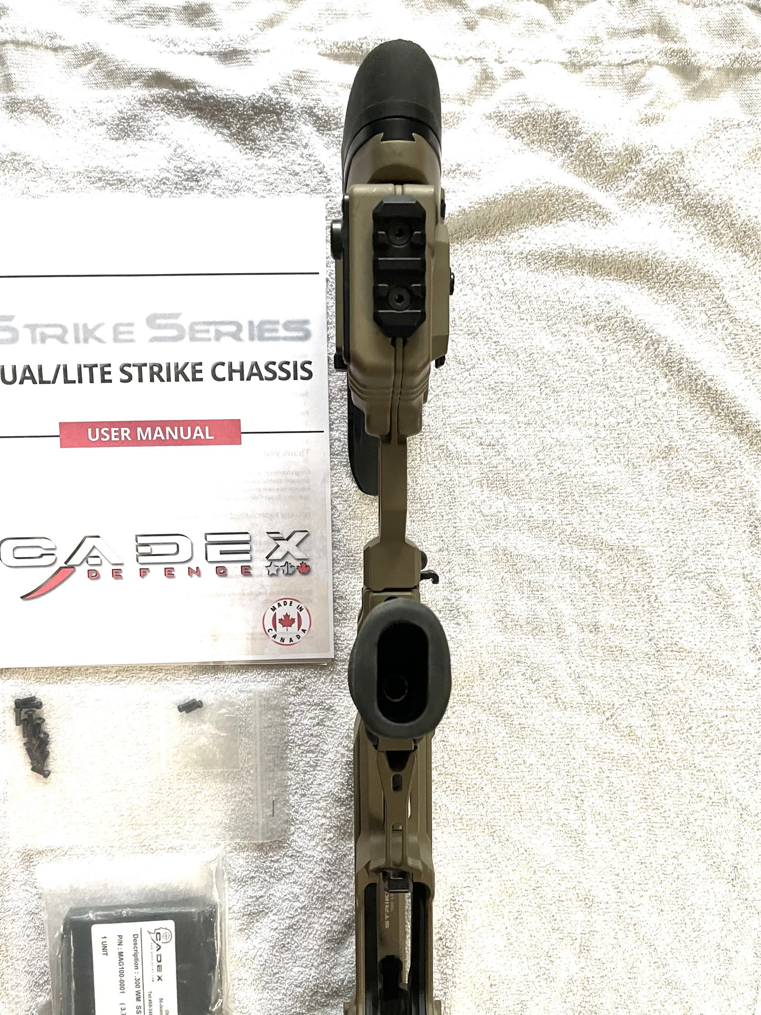 DUAL STRIKE CHASSIS for Remington LA. Awesome accuracy upgrade to any Remington LA!, Really allows use of shorter case when traveling to the range or for hunting with the collapsible stock. It is listed as used only because it had a rifle mounted in it, a few handling marks but otherwise in great shape, see pictures. The magazine that comes with it is for 300 WM. Cadexdefence (dot) com for more info on additional accessories. Comes with action screws, 6x48 rail screws, some extra screws, the 300WM Magazine and a print out of the manual for all assembly and disassembly info. This is a chance to save hundreds of dollars on your ultimate rifle build.