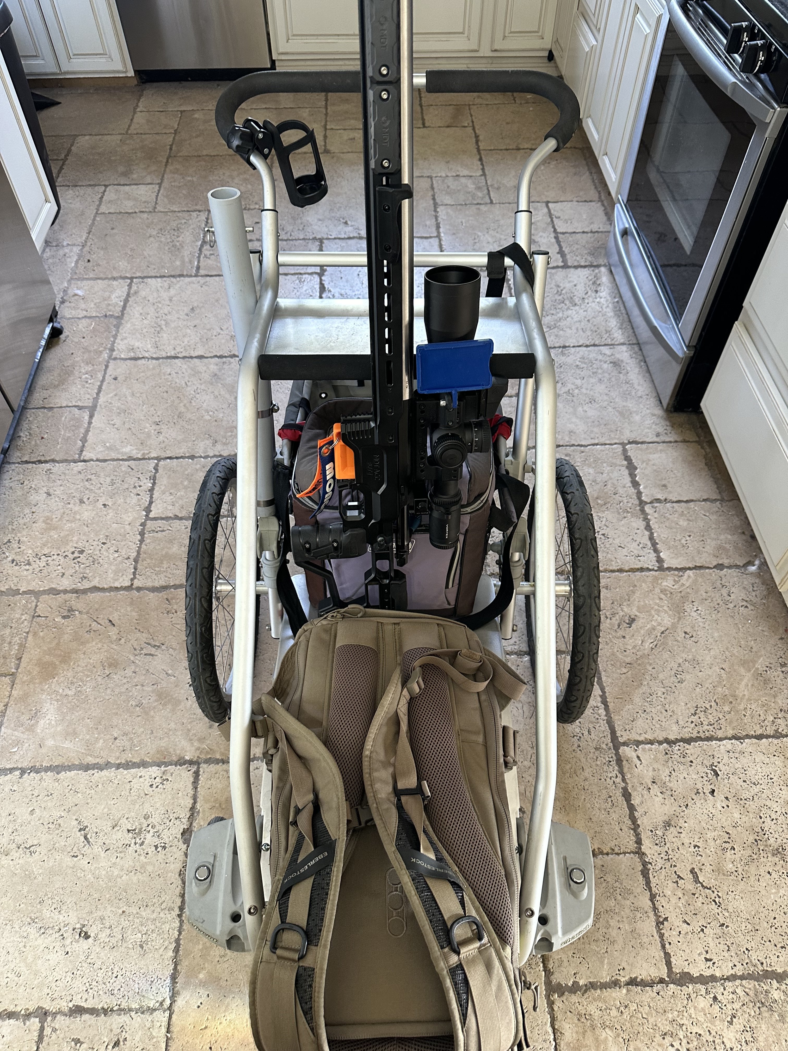 Mine is real similar to that. No cooler either but not a bad ideaThis is what a buddy of mines cart looks like. Just a jogging stroller $30-$100 at yard sales or FB market Place. Then kit it out like you want. Mine is similar, but I don't have a cooler strapped to mine!!!View attachment 8049215