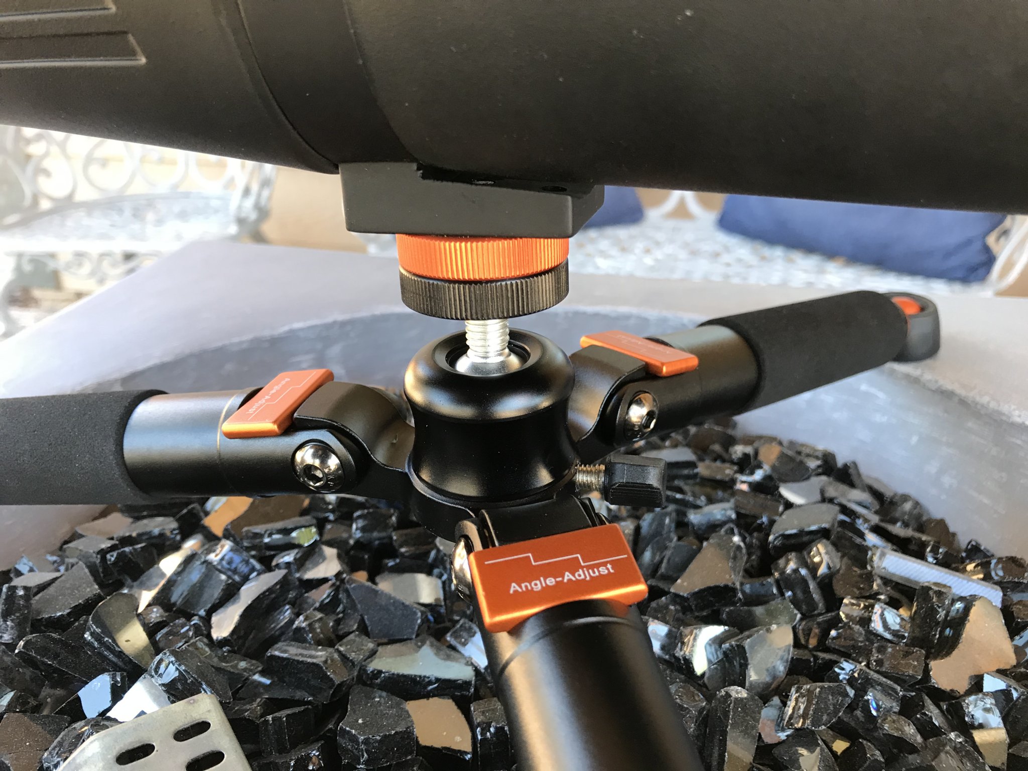 The Bestshoot is a different animal, it’s all metal and feels substantial. The legs have three positions that are set by metal sliders fitting to metal lugs. The leg design is similar to my high end DSLR tripod. The three set heights make for the following measurements: lowest setting 3.9” high covering an 18” circle, middle setting 7.75” covering a 16” circle, high setting 9.4” high covering a 9” circle, weight is 19.3 oz. It is very stable on the low or medium setting, I wouldn’t use the high setting with a heavy spotting scope as the legs are pretty close together. The rubber feet articulate on metal balls and three spares were included in the box. The ball head is not as ideal as a pan and tilt head for a spotting scope, but it holds my scope adequately without cranking it down super tight. The ball head could loosen up later and cause issues, but initially it feels good. The ball head uses a pair of screw collars to secure the screw to the mount on the scope. There is no secondary pin to prevent the scope from rotating, just friction from the collar to the scope. Overall I’m impressed with the Bestshoot, especially at the price.