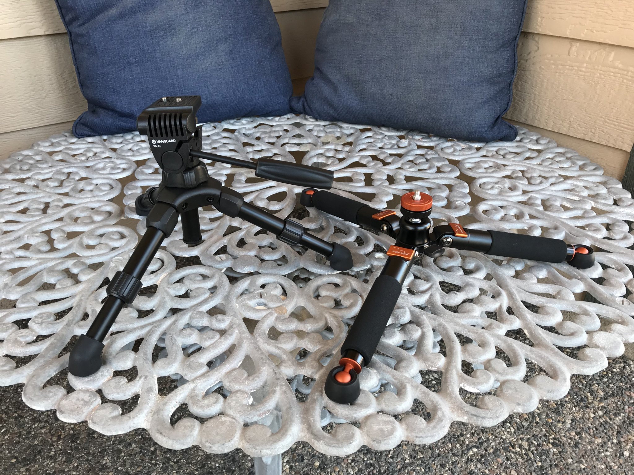 I received both on Friday 7/19 and evaluated. Right out of the box the vanguard feels like a kids toy. The center frame is plastic, the pan and tilt head feels cheap, the rubber feet don’t sit flat on the bench. It strained with the weight of my scope and flexed with the slightest pressure. The tilt on the head needed to be cranked down tight to keep the scope from moving, but the inherent shake from the flimsy plastic allowed the scope to shake. The measurements are as follows: circle covered by the legs, 12” collapsed/15” extended, height minimum 7.4”, maximum 10.25”, weight is 14.7 oz. Color me not impressed, it’s going back to Amazon.