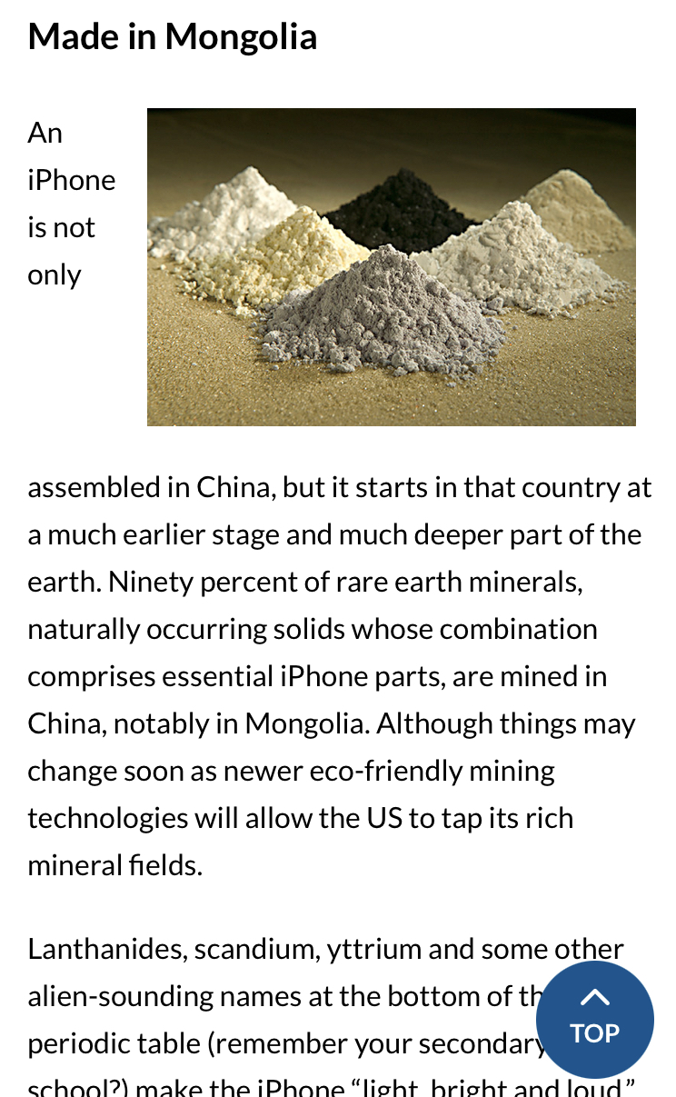 Assembled by a company called Hon Hai Precision, a chinese owned company. Just a small amount of research shows that a majority of iphones and ipads are built in the shenzen,china factories. They own and operate factories all over the world, you are correct there. They do make SOME iphone and ipads in Taiwan, but not all and not a majority. Either way you cook it, the majority of the money for production is going through mainland china first, I’m sure some makes it back to california. The image was more for the first line that said “Not only are they made in china”Are we going to do an elemental origin analysis? Let me know what product will be left.