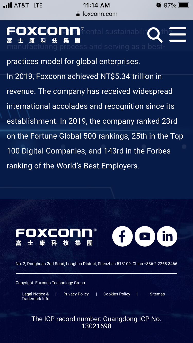 LMAO...they have facilities all over the planet including the USSo this same FOXCONN that is formerly known as Hon Hai? The one with the corporate address in china? Having a HQ in a country doesn’t make it owned by that country. I also said a MAJORITY of iphones and ipads made in china. I have no doubt there are plenty of them rolling out of taiwan. View attachment 7493312
