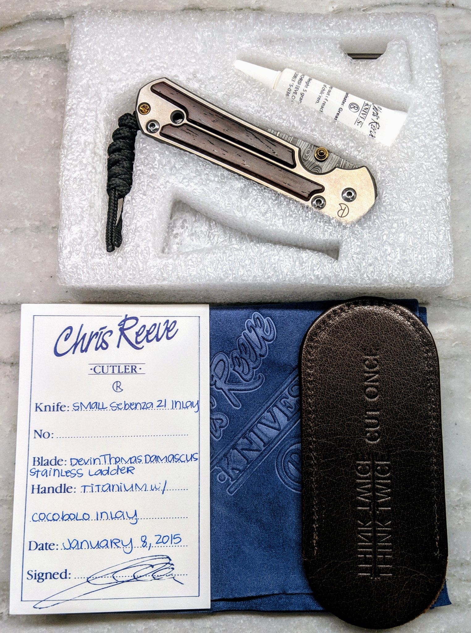 * Small Sebenza 21 cocobolo inlay with Devin Thomas Ladder Damascus. Knife is a perfect example of CRK work. I would be keeping this one if it were the large version as I have larger hands. 600 new price 550 shipped firm.... 500 shipped this weekend!