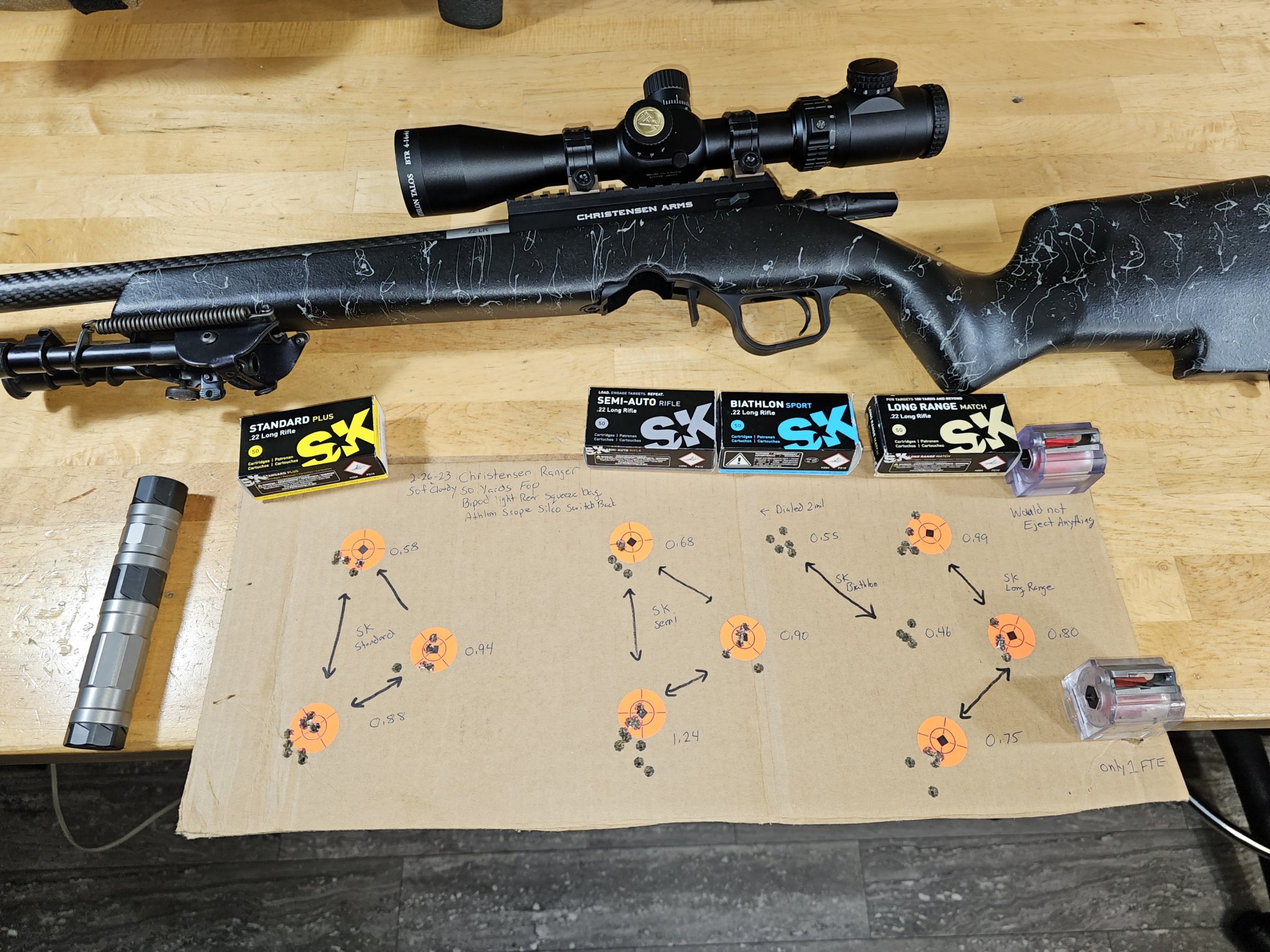 Was at the range today, and a nice older guy was shooting his custom CZ with a Lilja barrel, and we got to talking about rimfires, and he was trying a bunch of high-end ammo in his to see what it liked. He asked which one my Ranger 22 preferred, and I said, honestly never tried anything higher priced than CCI SV in it, as it shoots good enough to have fun with at 200. He slid me a whole box (50) of SK Match (red & black box) over, and said, mine won’t shoot these, give ‘em a try. So after about 15-20 rounds my barrel settled in with the SK, and I put down this 5-shot group. If the 5th one hadn’t gone wide, it would have been much more impressive. But I’m learning that .22 LR having fliers and dropouts is unpredictable, at best…Even with the high-end ammo. 👍🏼