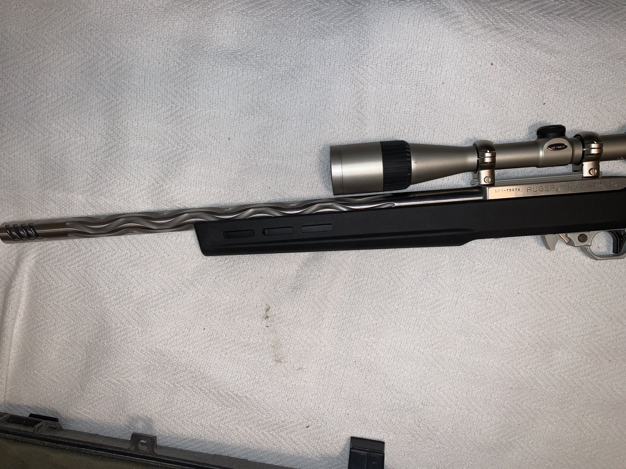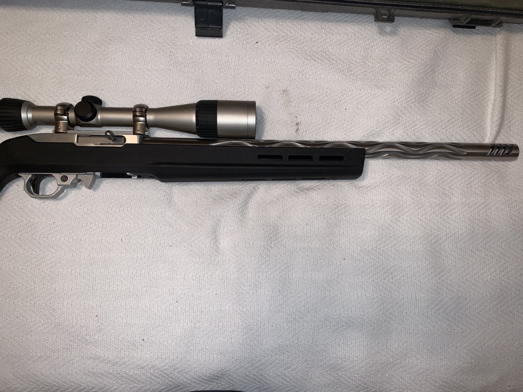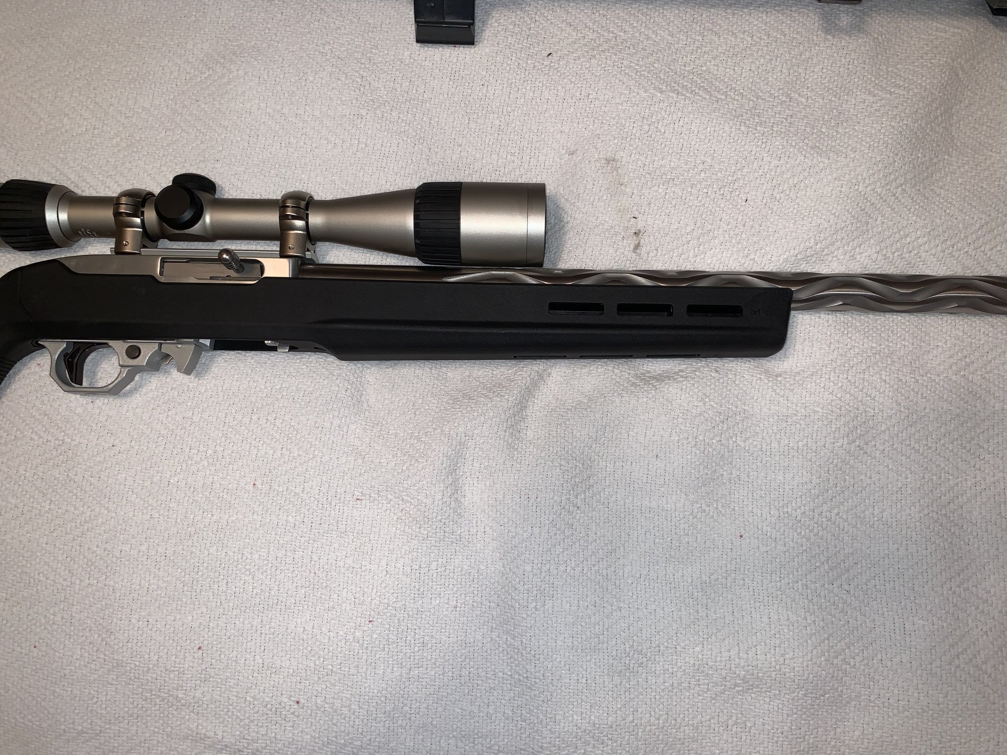 This rifle started life as a standard 10/22. It is now comprised of a Ruger 10/22 receiver, Volquartsen TG2000 trigger group, Volquartsen snake-fluted barrel with compensator. It sits in a Magpul Hunter X-22 stock and is topped with a Weaver Grand Slam 6-20x40 scope. Keeping this for now.