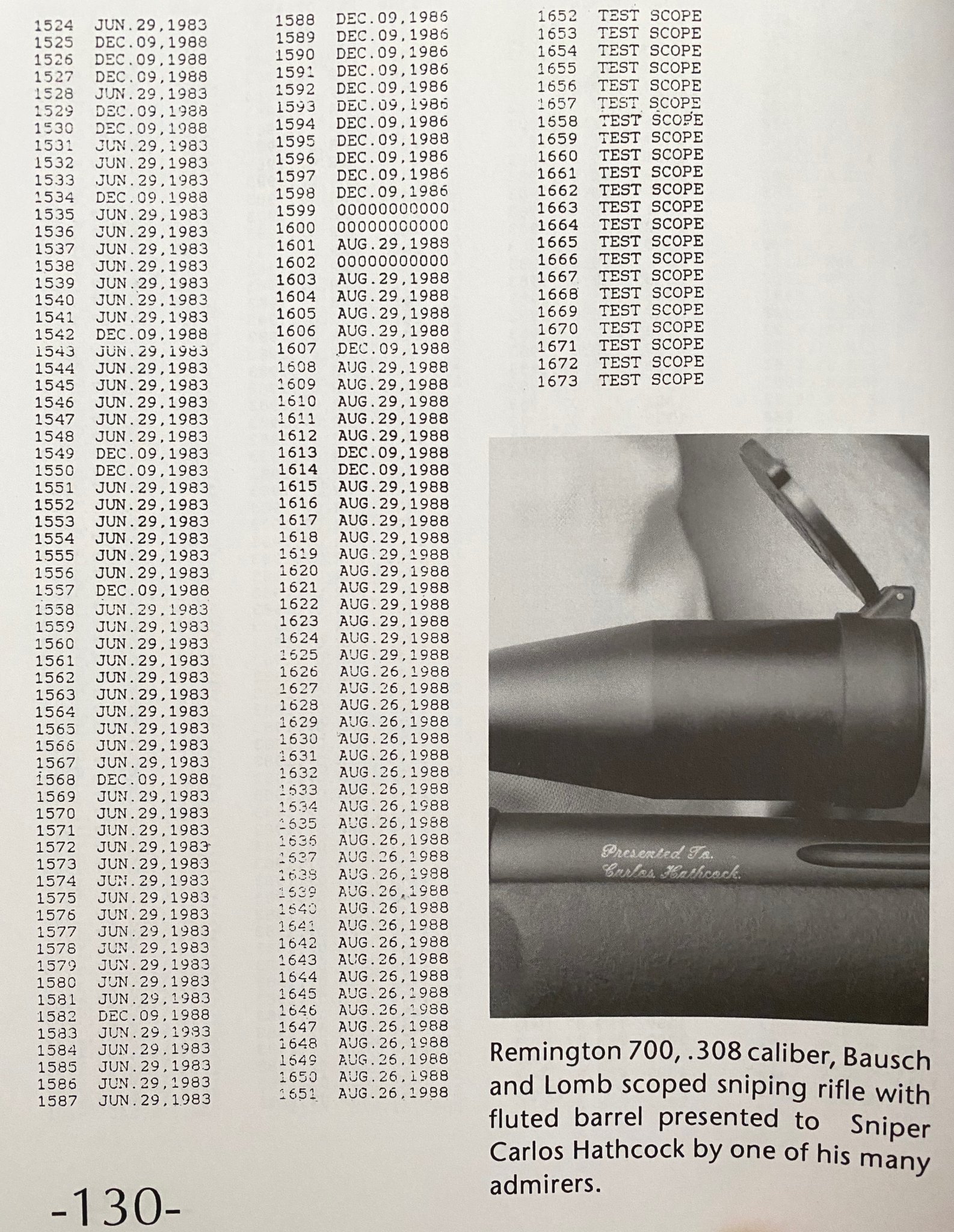 Chandler, Death from Afar, Volume 1 list the serial numbers and dates of purchase for scopes from 1006 up through 1651. It also lists 1652 through 1673 as "test scopes". In the higher serial numbers shown, the dates of purchase bounce around between 1983 and 1988.